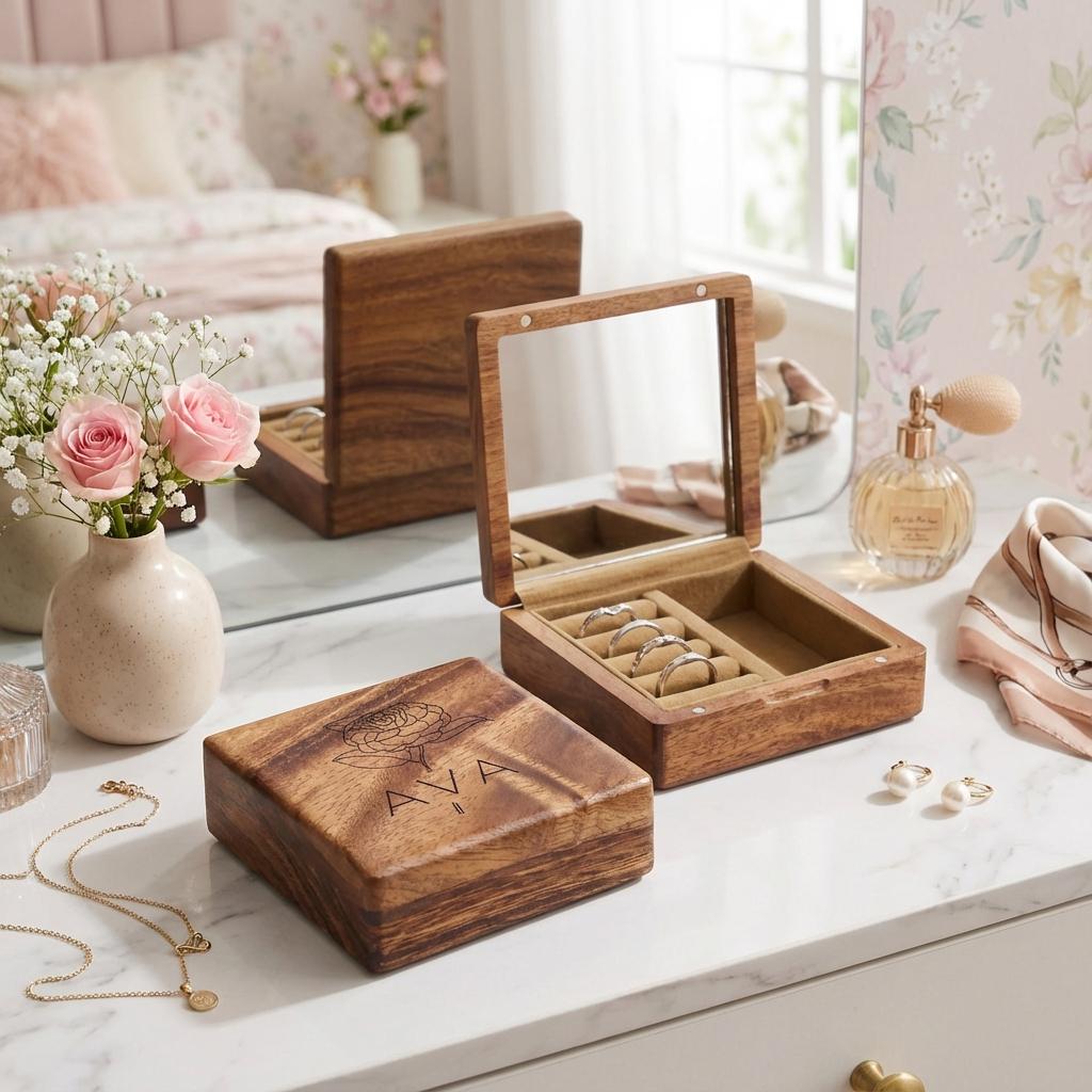 Keep her treasures safe in style with this personalized wood jewelry box. Featuring a built-in mirror and custom birth flower engraving, this compact travel jewelry case makes a luxurious bridesmaid proposal gift or Mother's Day present.