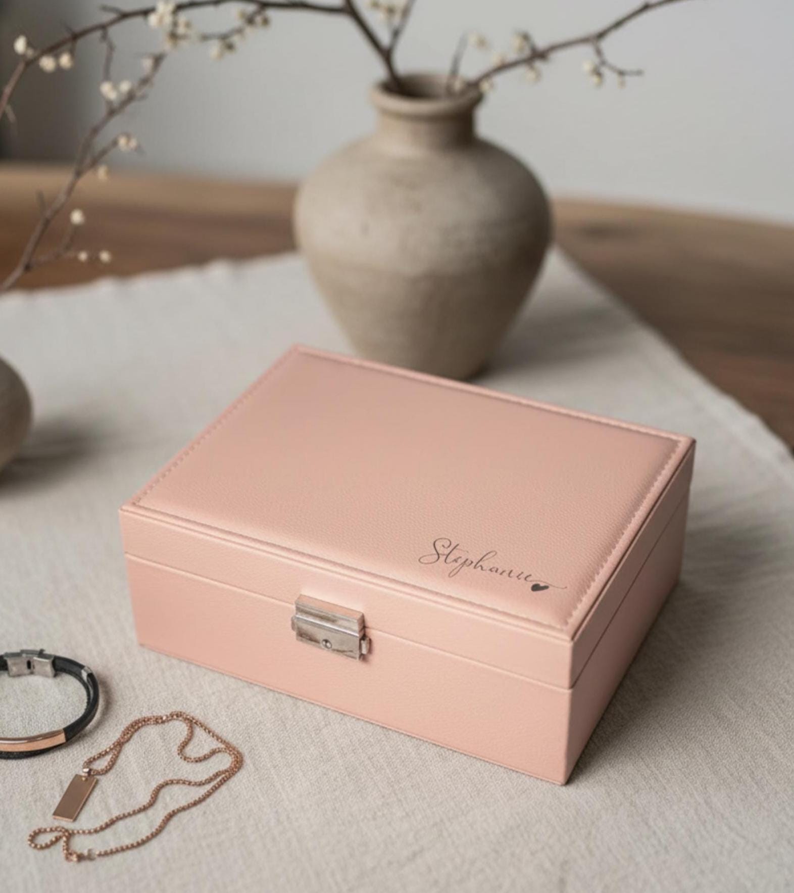 Introducing our exquisite large-size pink leatherette jewelry case, personalized to perfection for your most cherished treasures. Crafted with meticulous attention to detail, each jewelry case is laser engraved with precision, ensuring a stunning and lasting finish.