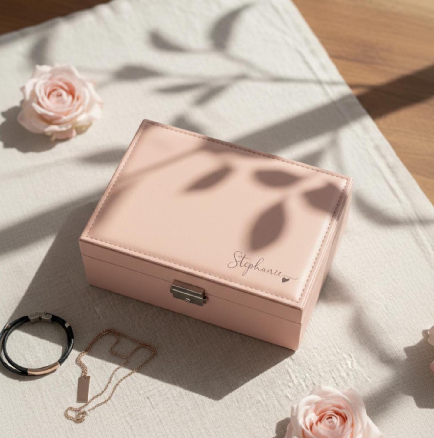 Treat yourself or someone you love to the ultimate luxury with our personalized pink leatherette jewelry case. Order yours today and elevate the way you store and showcase your most treasured pieces.