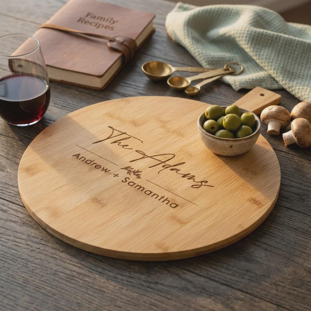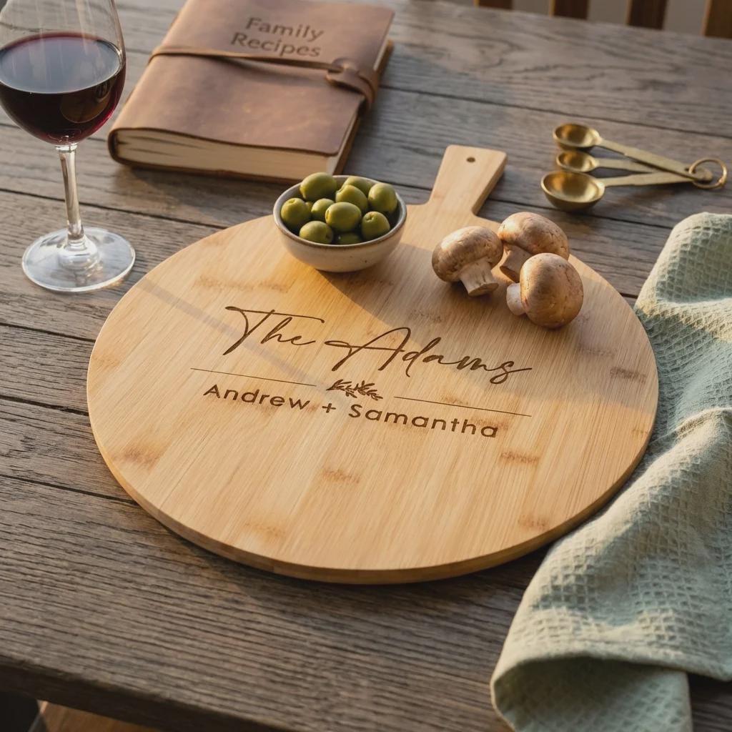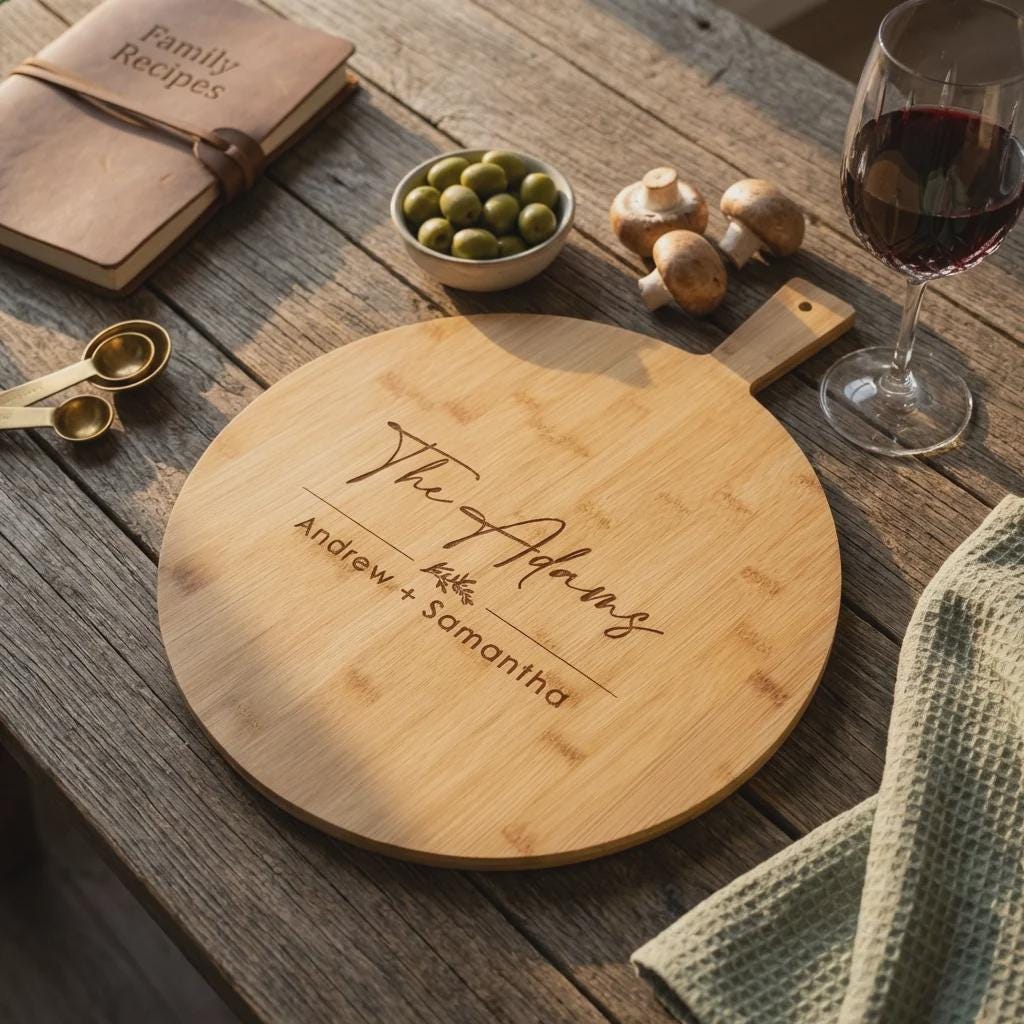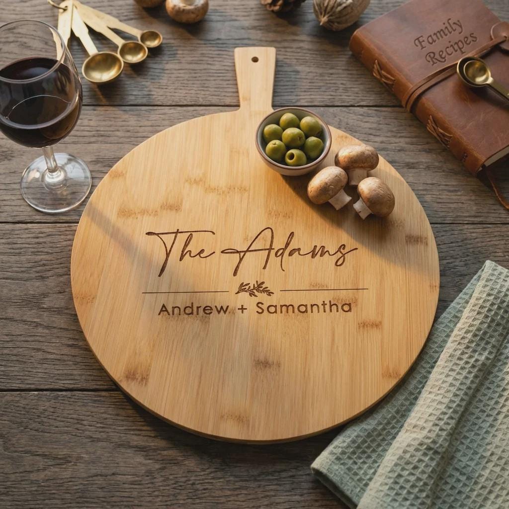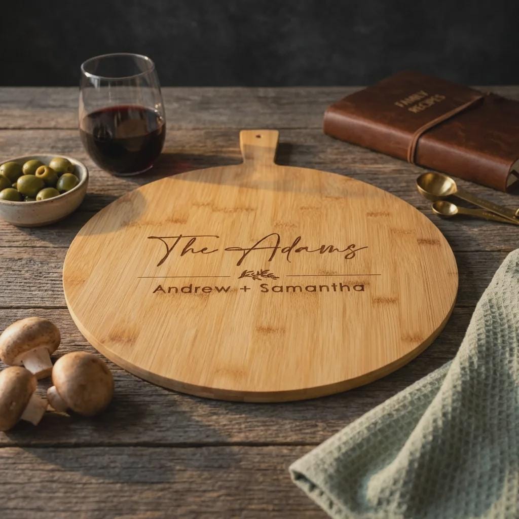 Personalized Bamboo Pizza Peel with Handle, Custom Engraved Round Cutting Board, Wedding Gift