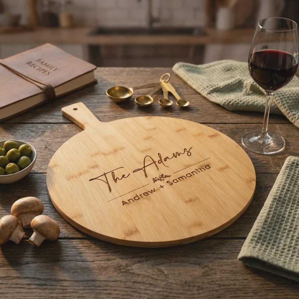 Upgrade your home kitchen or outdoor pizza oven setup with this personalized bamboo pizza peel. Hand-crafted from sustainable natural bamboo, this 18" x 14" round board features an integrated handle with a hanging hole for easy display. Precision laser-engraved with a modern script monogram and custom names, it serves as a professional-grade serving piece for pizza, appetizers, or charcuterie.
