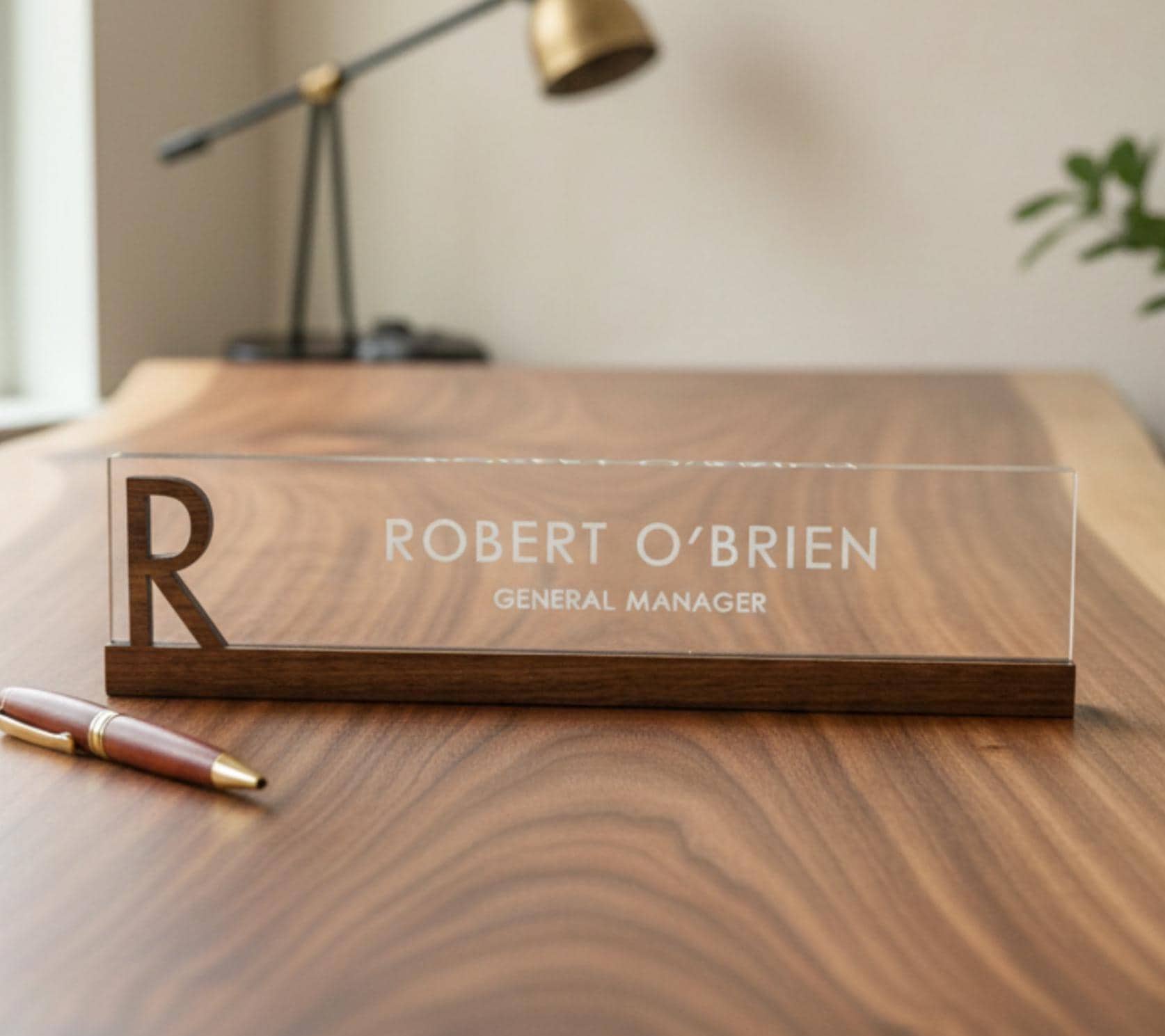 Personalized Desk Name Plate | Custom Acrylic & Walnut Wood Office Sign | Engraved Name Plate | Modern Desk Accessory | Office Decor