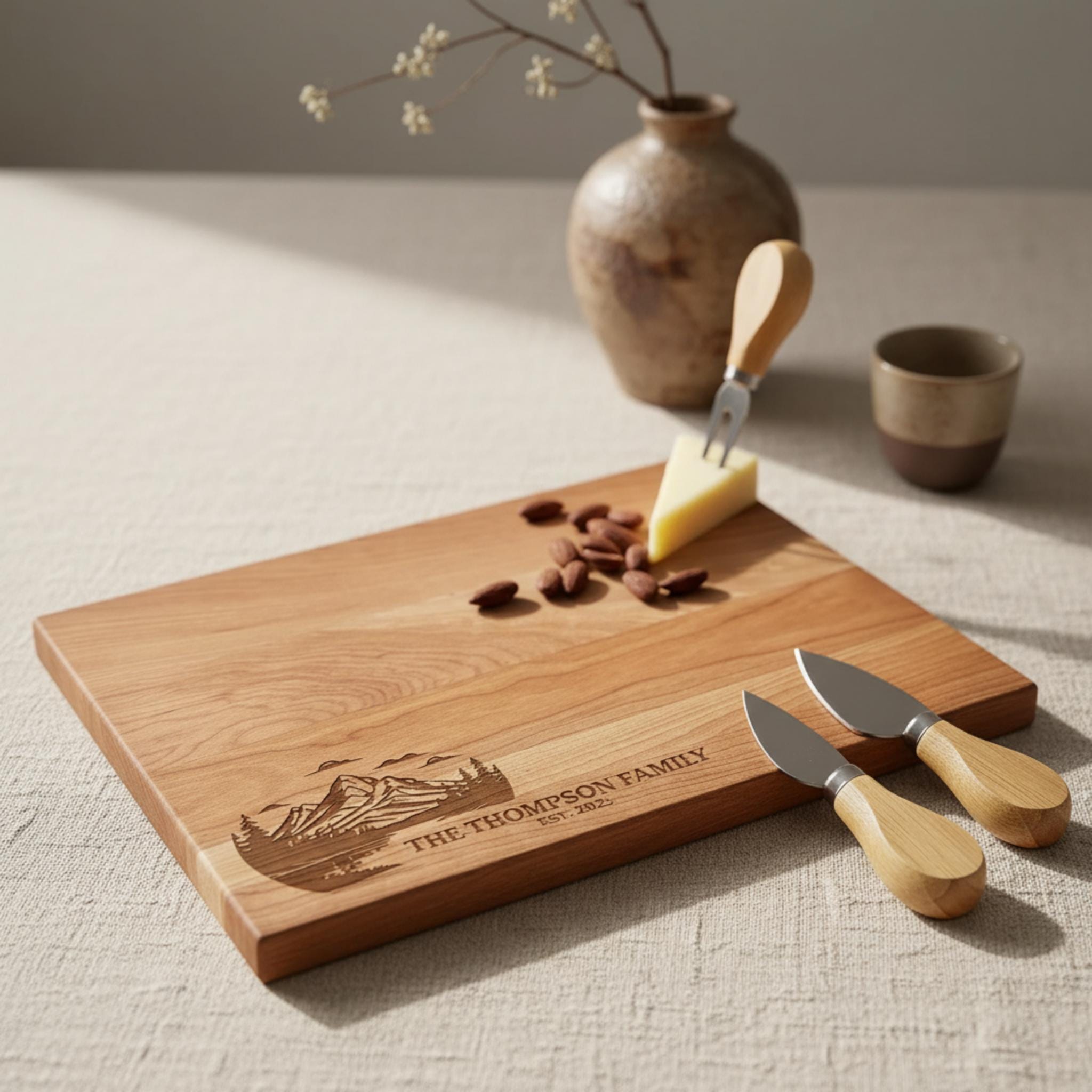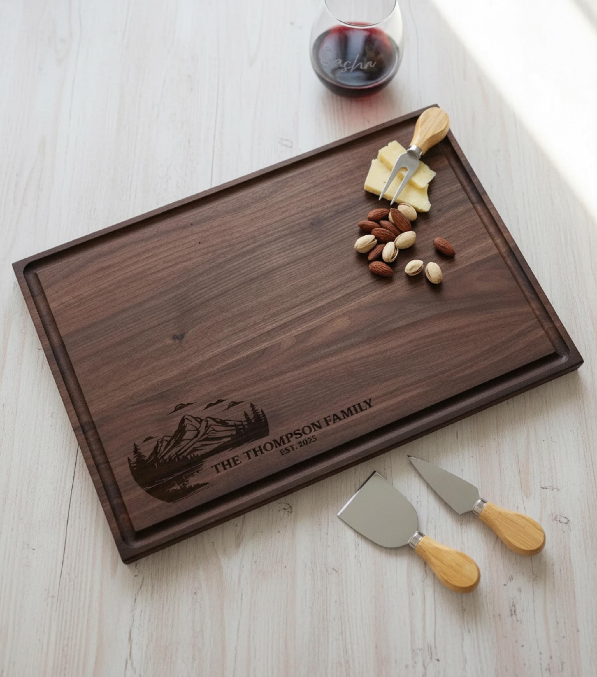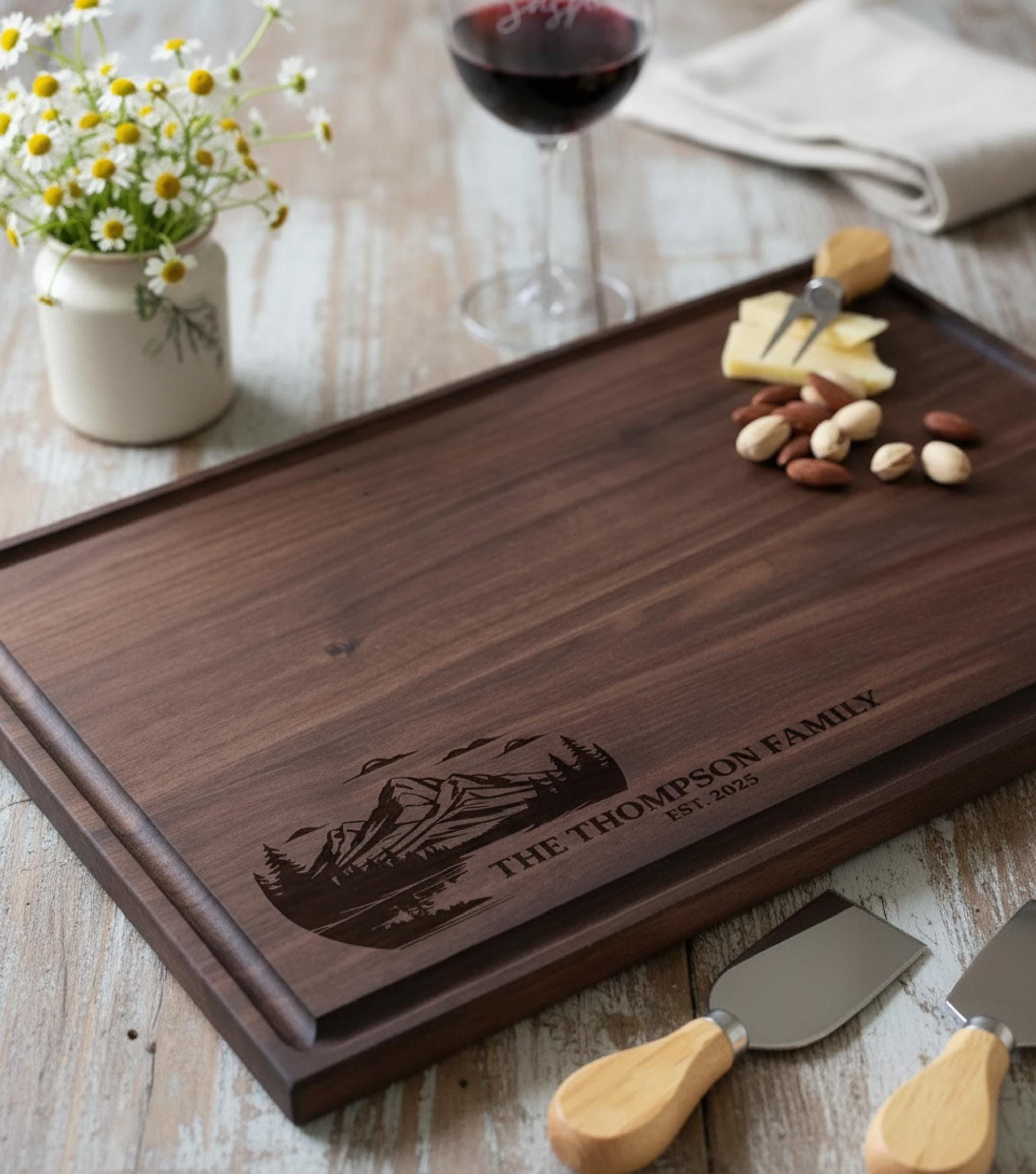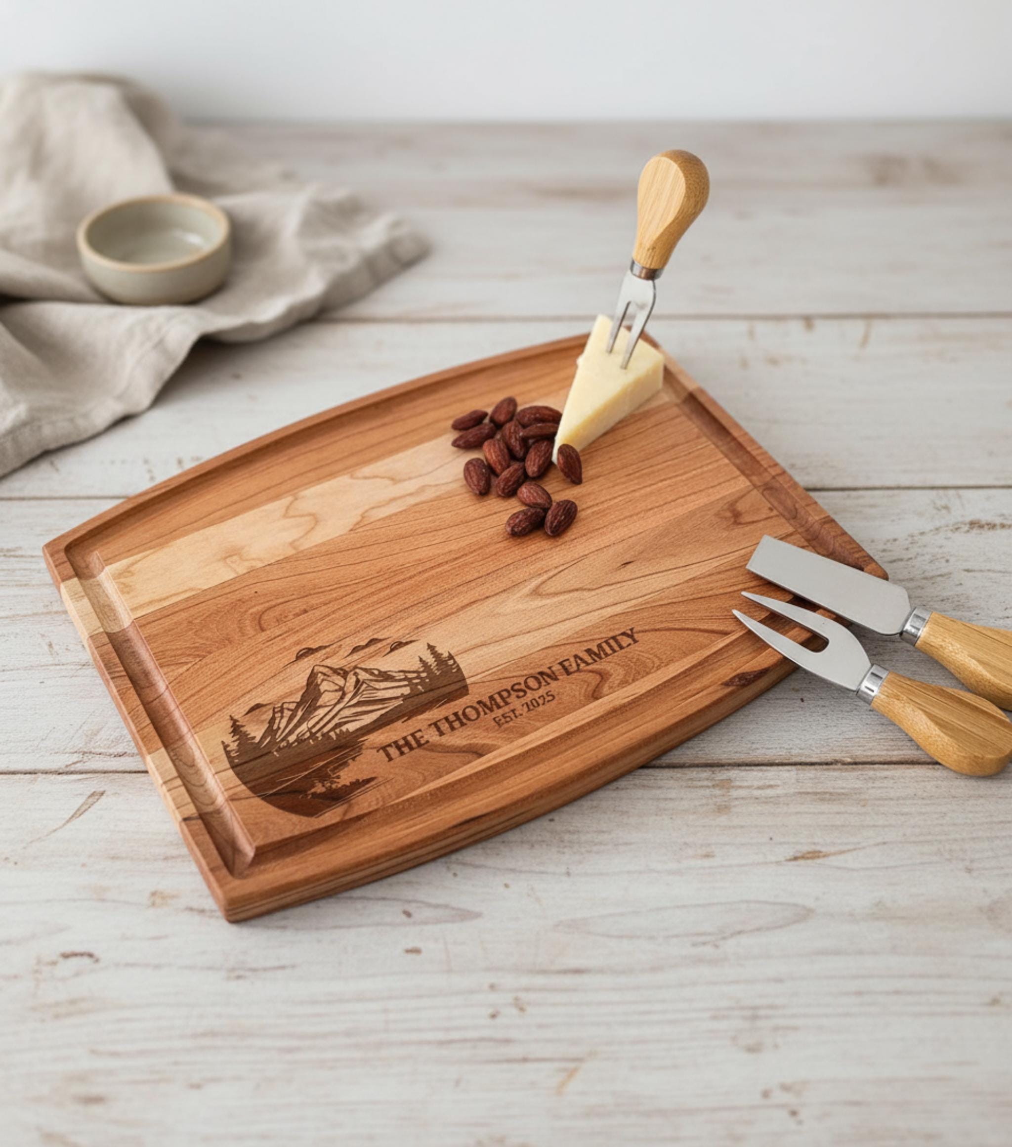 Personalized cutting board, Mountain Landscape: Custom Engraved Charcuterie Board, Lakeside Cabin, Kitchen Decor, Cottage Gift, Housewarming