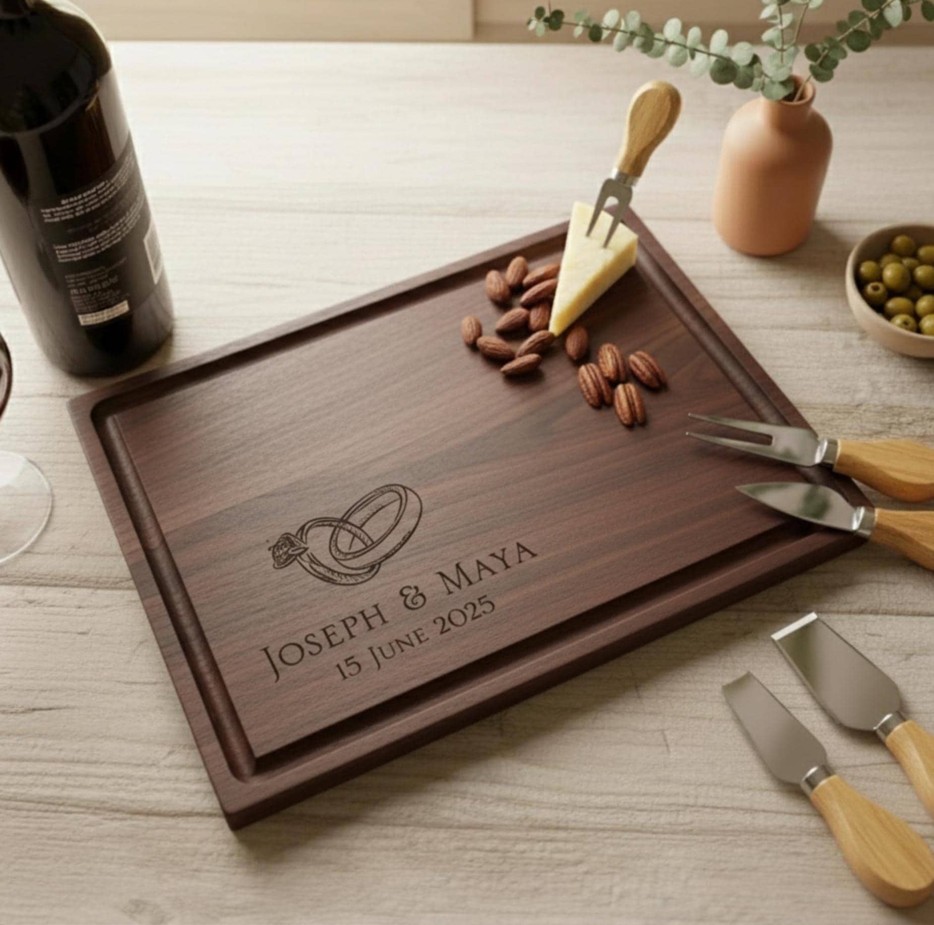 Celebrate your love story with a custom engraving that transforms this cutting board into a cherished memento for anniversaries, engagements, or weddings.