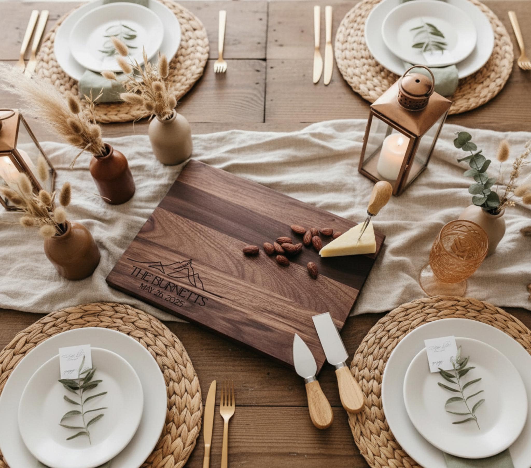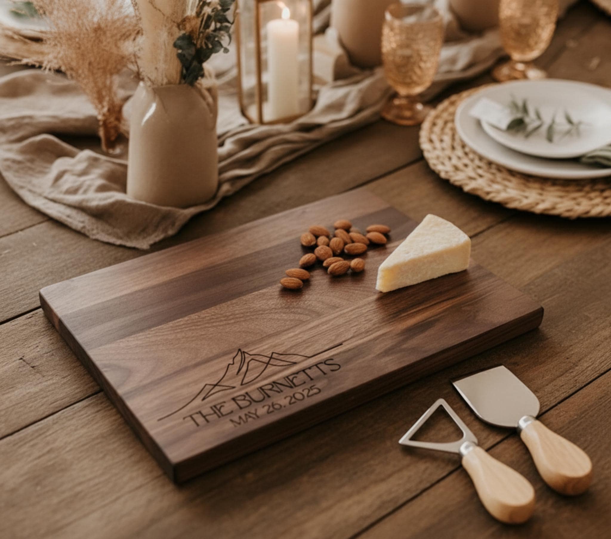 Each board is precision laser-engraved, capturing every detail of the modern mountain motif along with the couple’s personalized details.