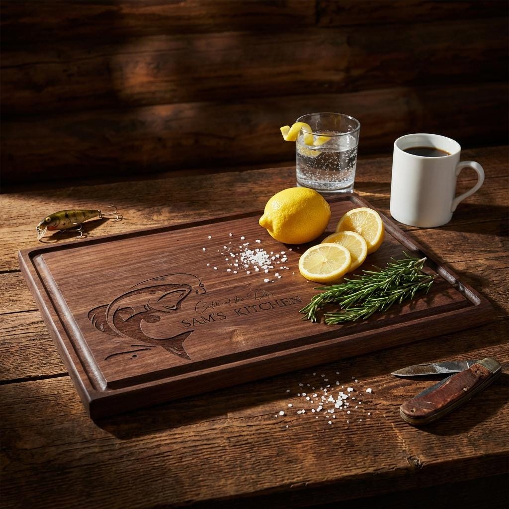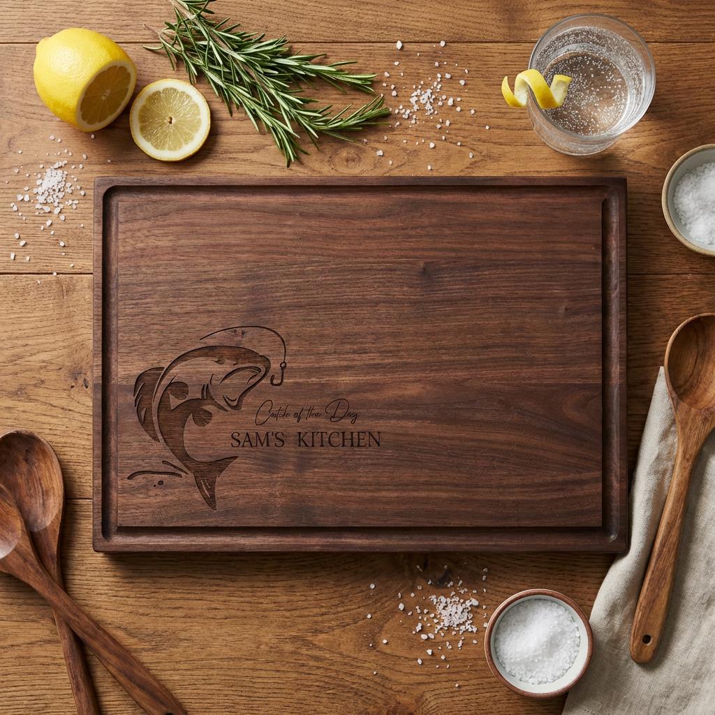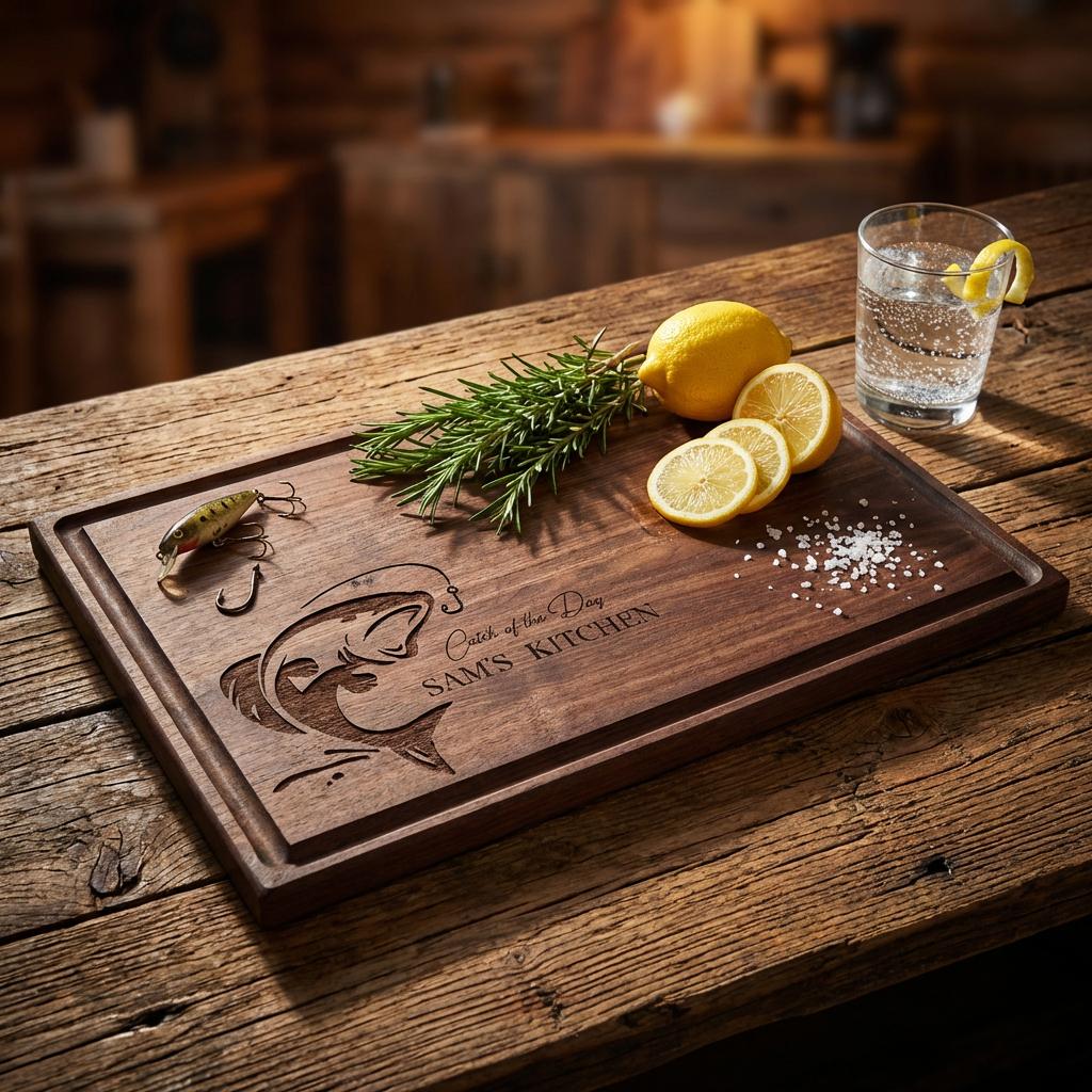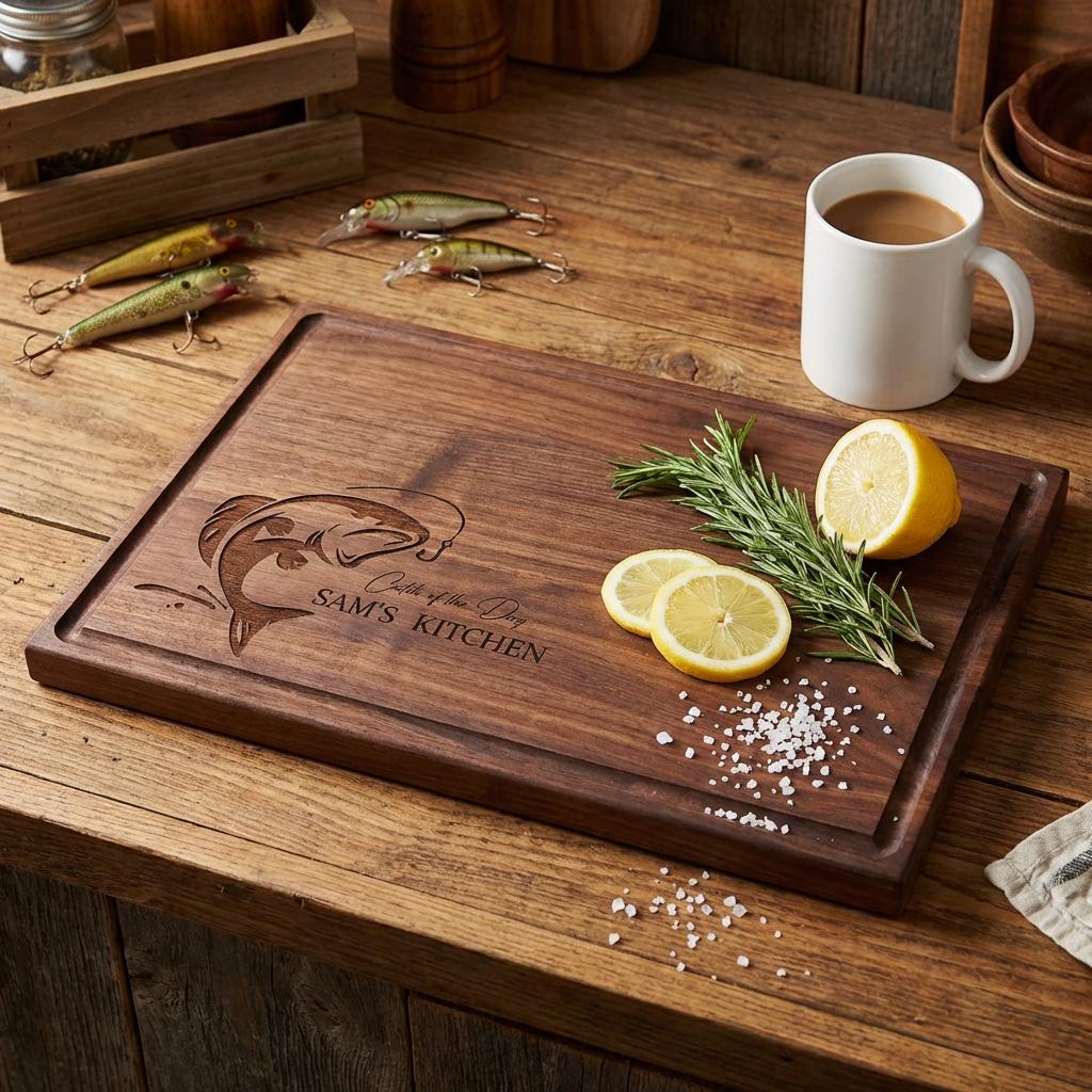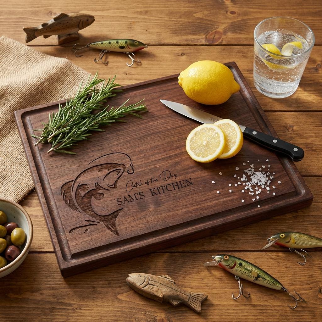 The cutting board is adorned with an elegant fish and hook engraving, complete with a catchy phrase that celebrates his love for cooking and the joy of a well-prepared meal.