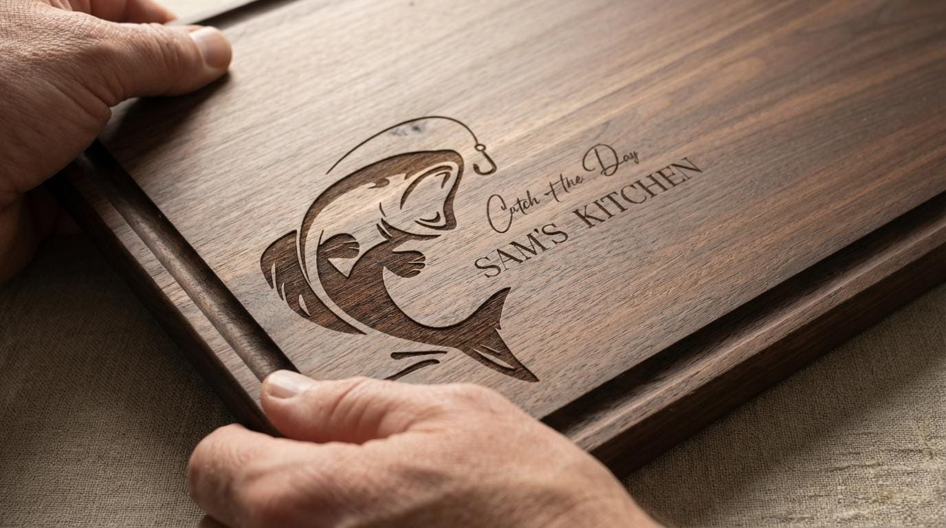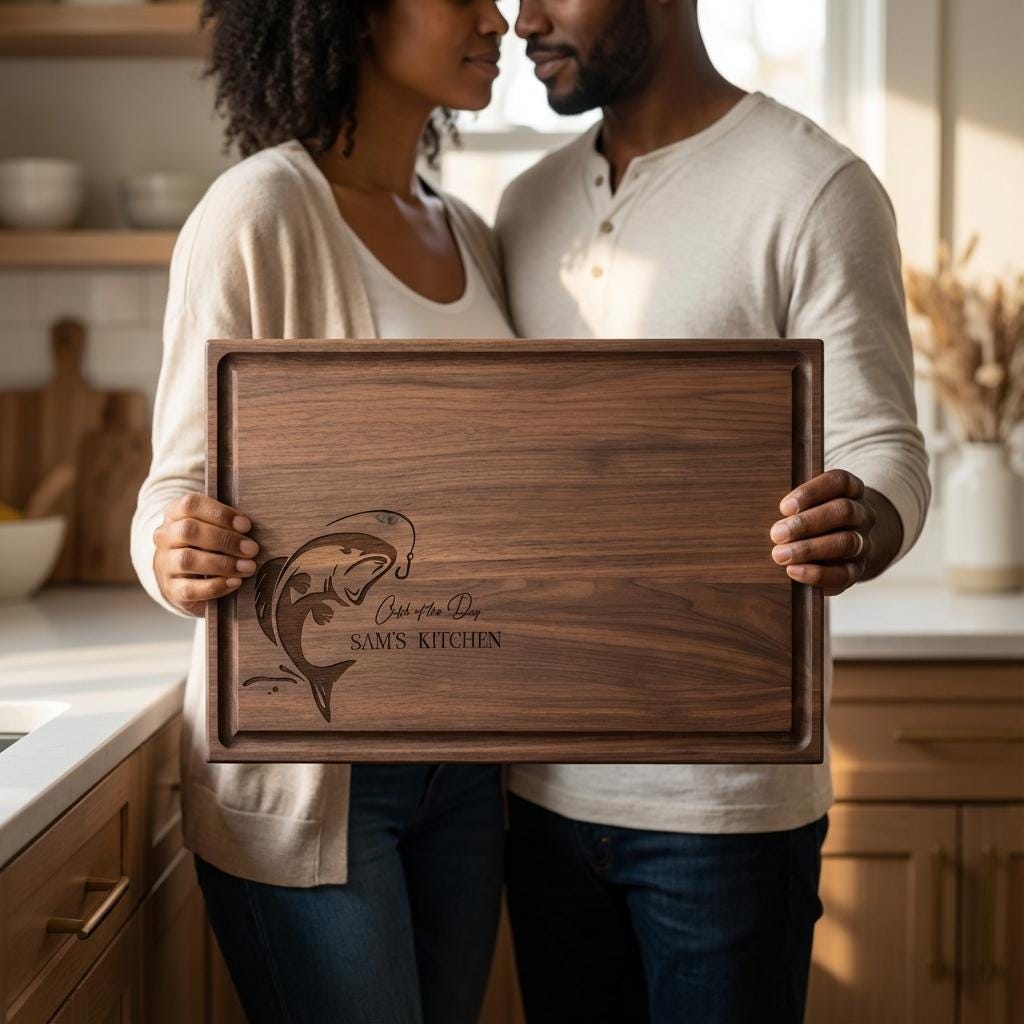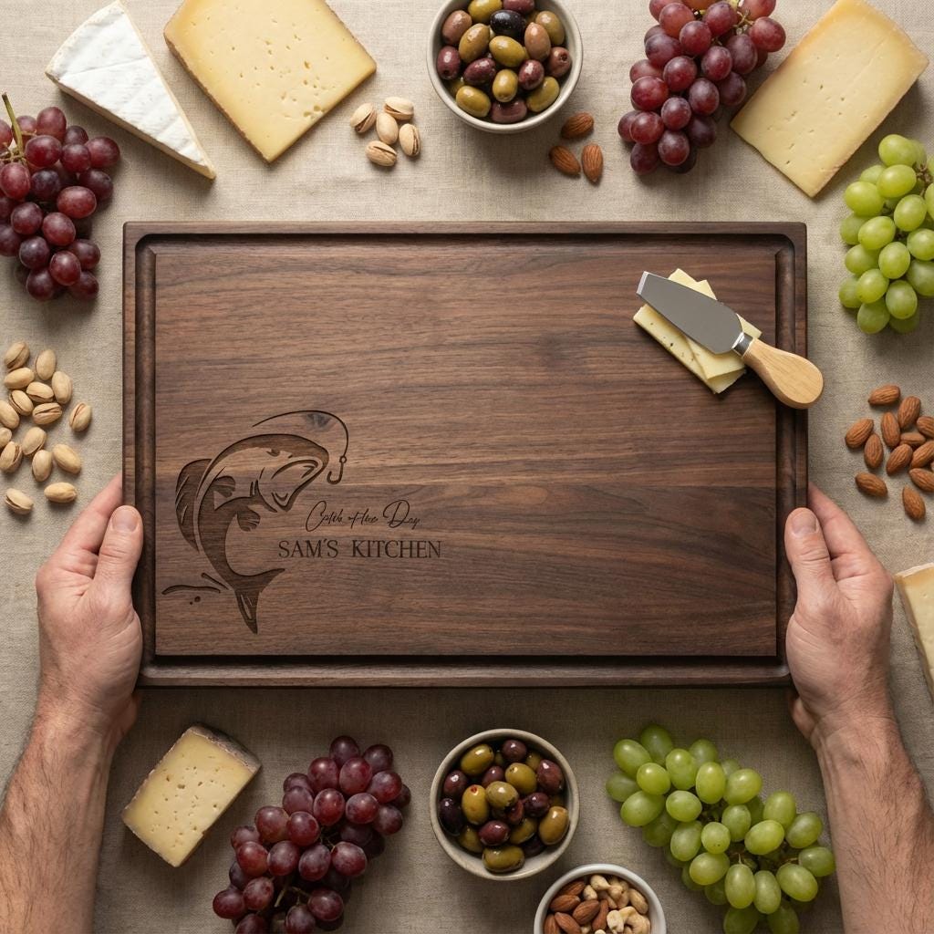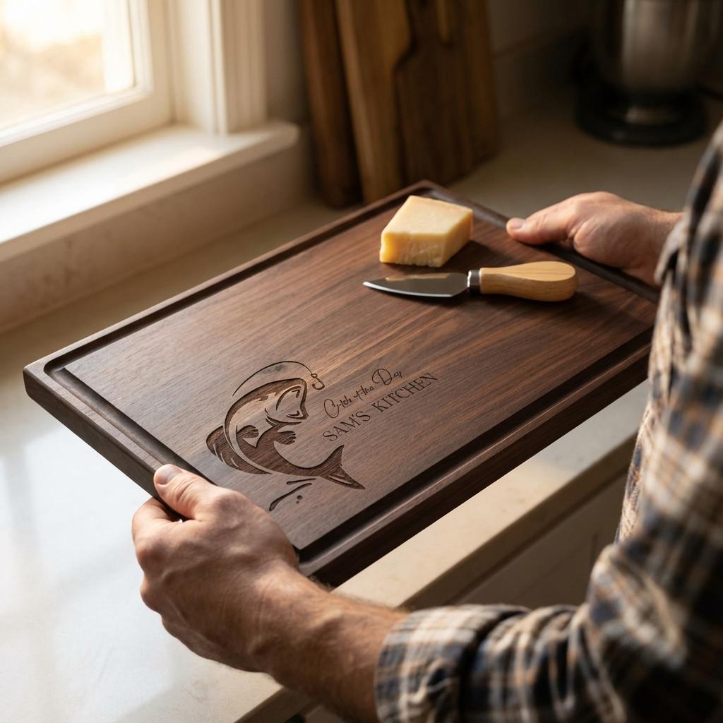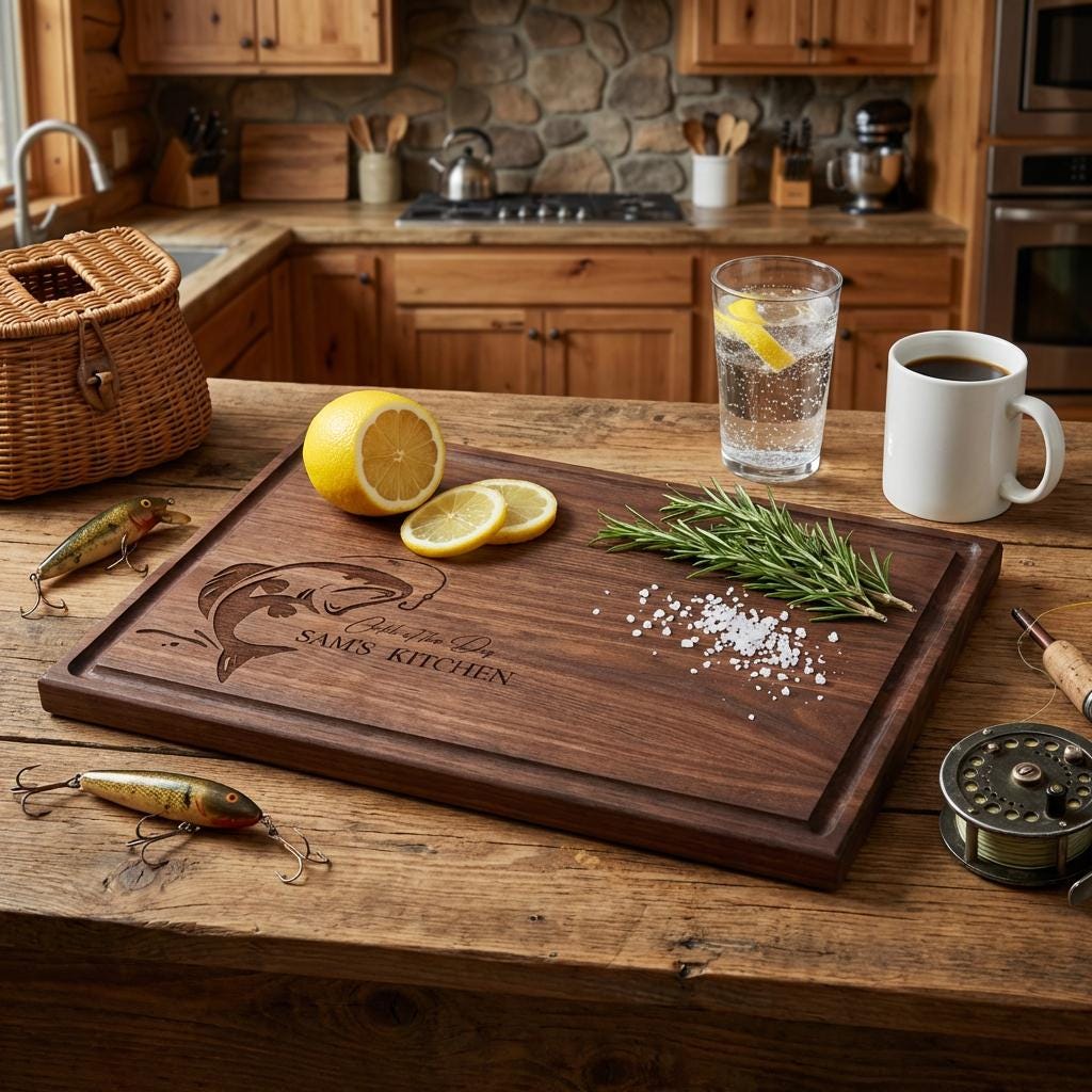 The cutting board is adorned with an elegant fish and hook engraving, complete with a catchy phrase that celebrates his love for cooking and the joy of a well-prepared meal.
