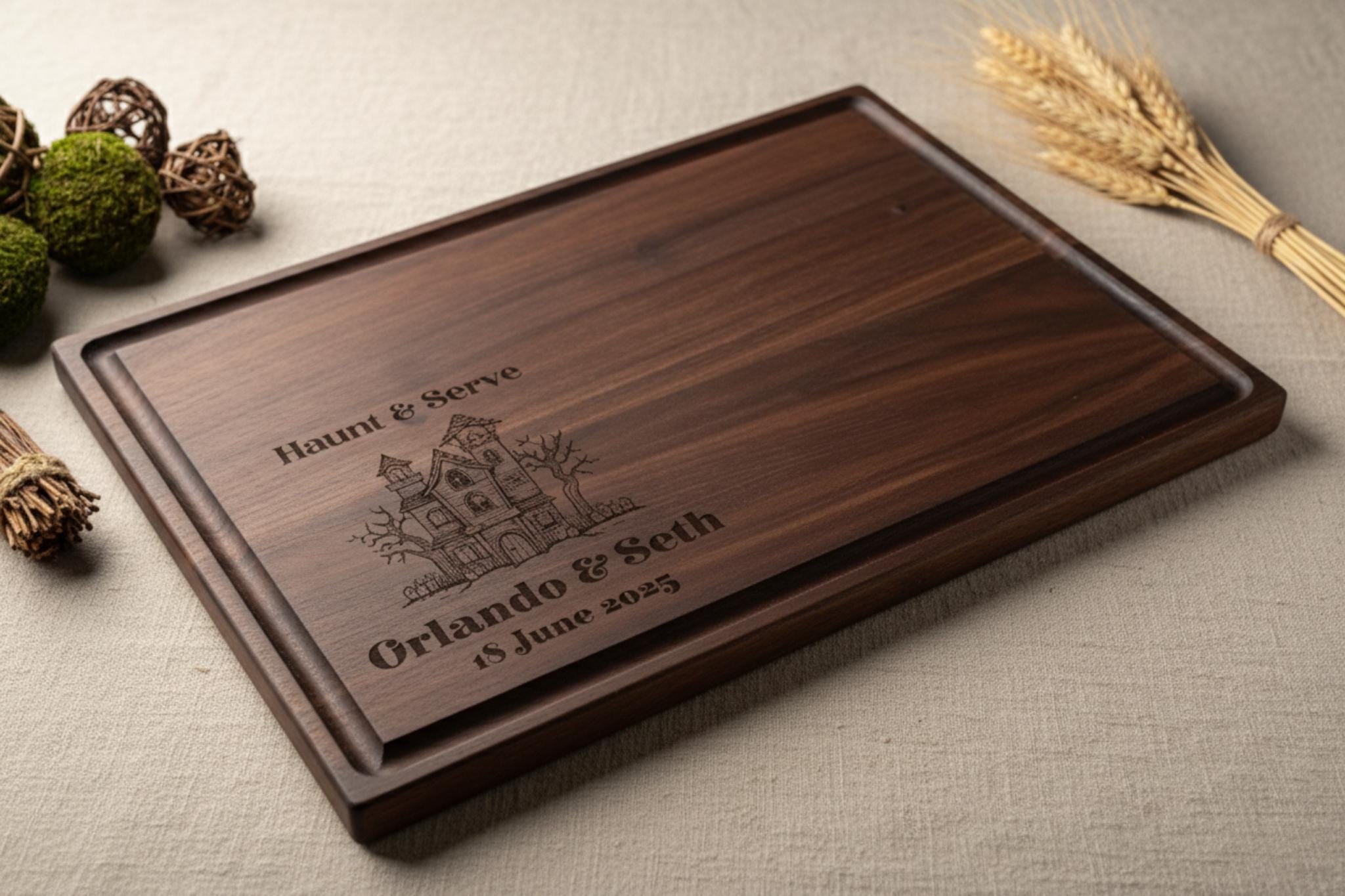The cutting board features a detailed, comic-inspired haunted house engraving that brings the spooky theme to life. The added quote "Haunt and Serve" and personalized couple’s names create a memorable keepsake.