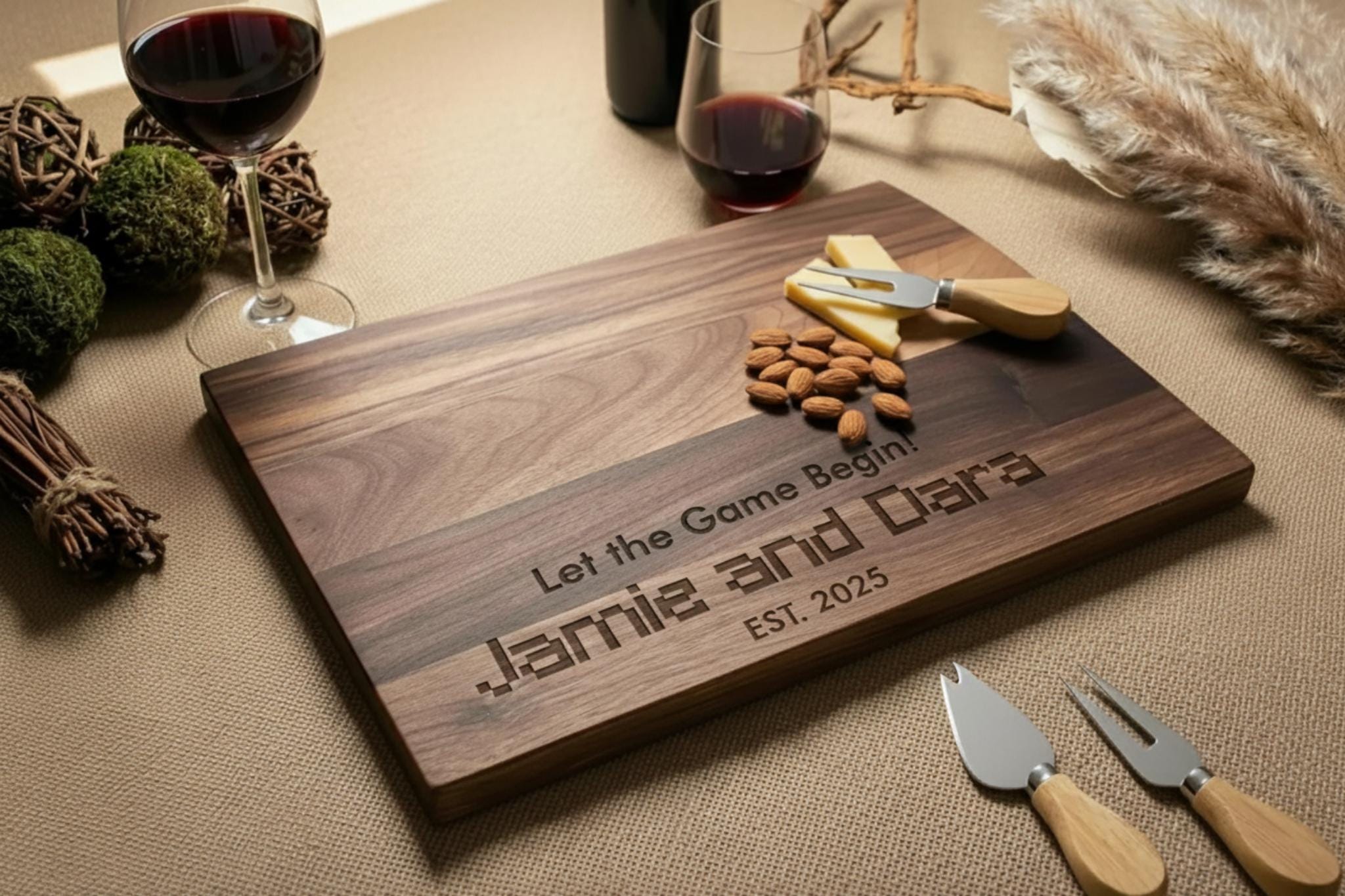 Custom Gamer Engraving: Watch your favorite in-game spirit come to life on quality wood. Our skilled artisans use the Minecraft font to etch “Let the Game Begin!” along with your personalized couple names and the date, making this cutting board a true statement piece.