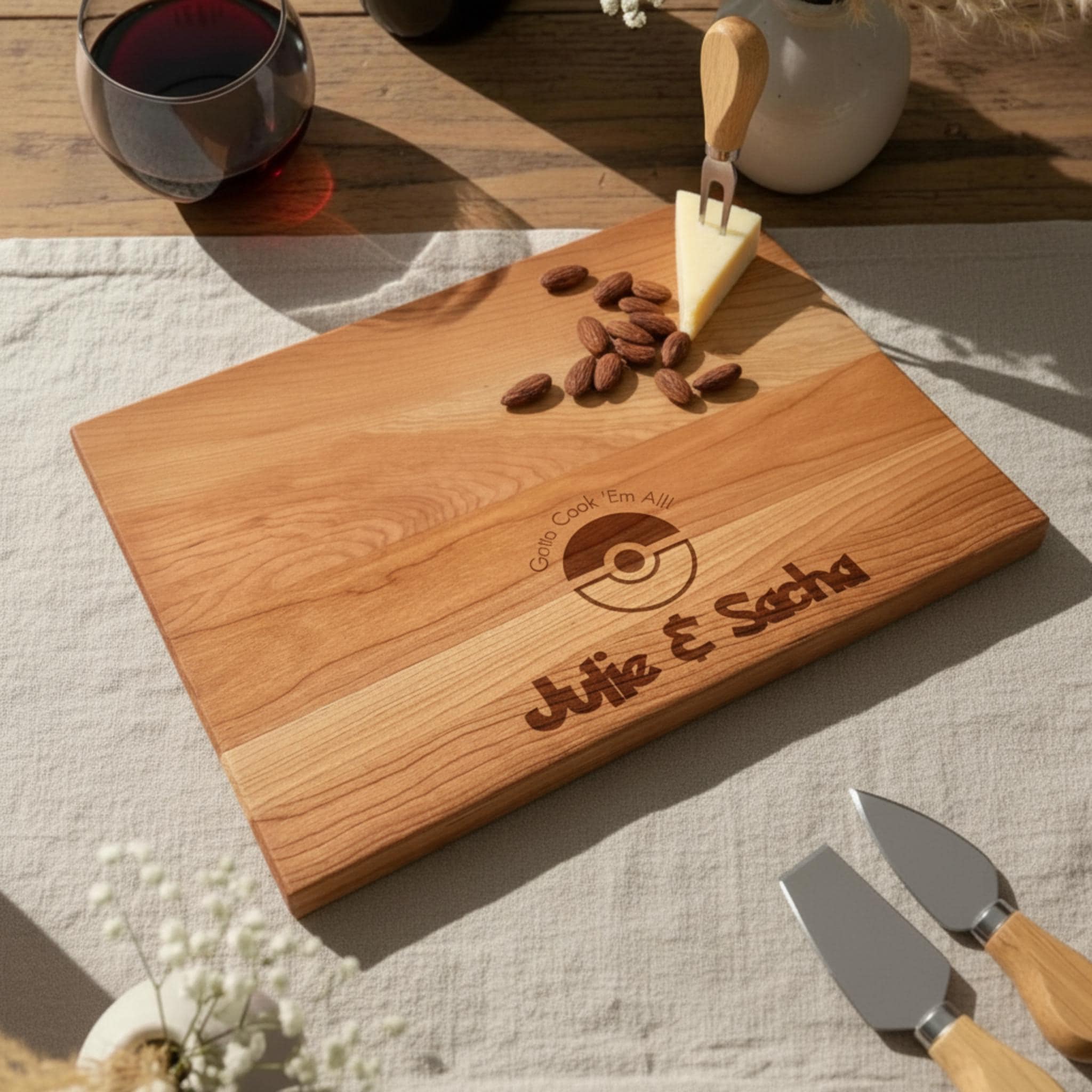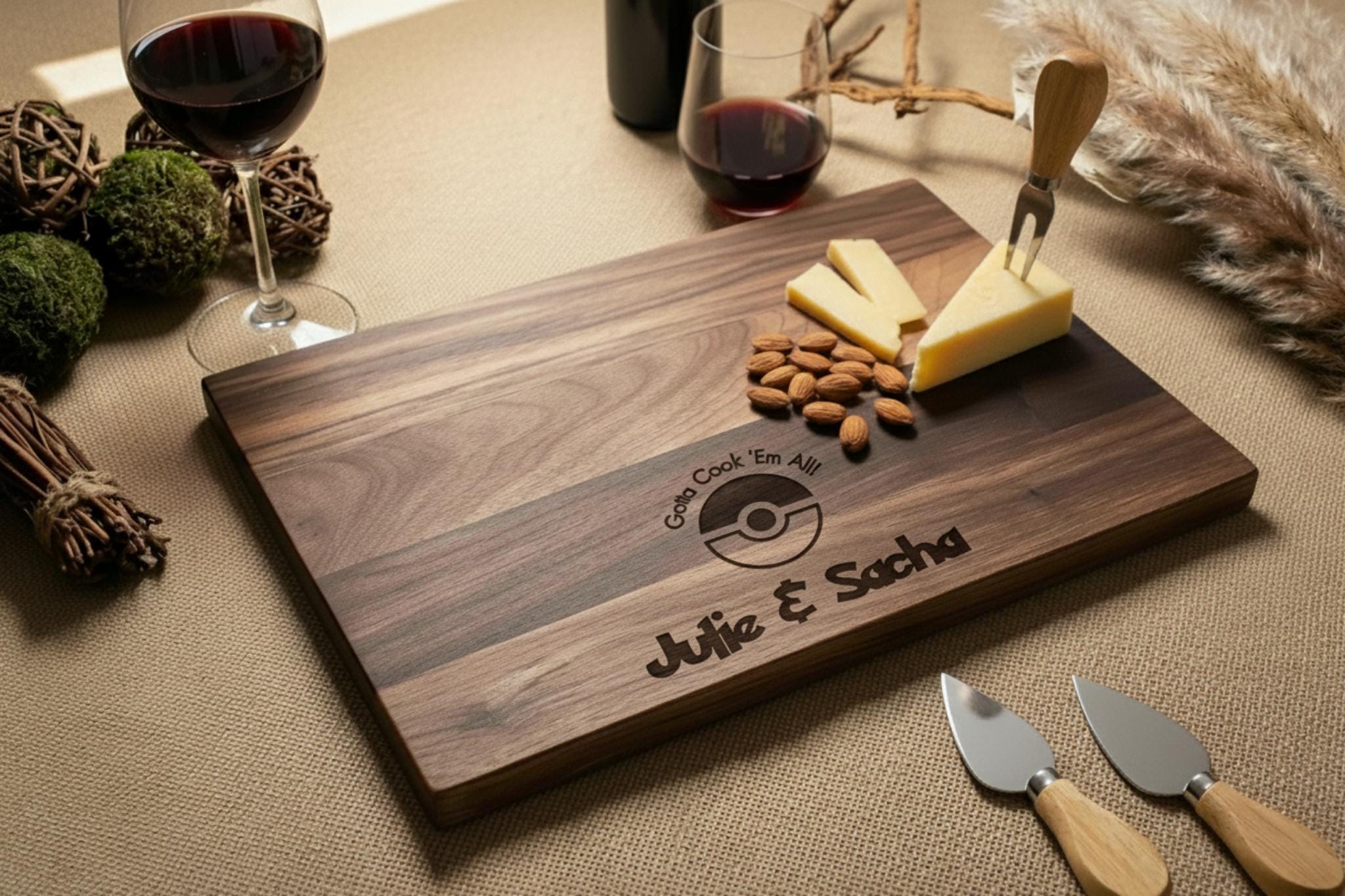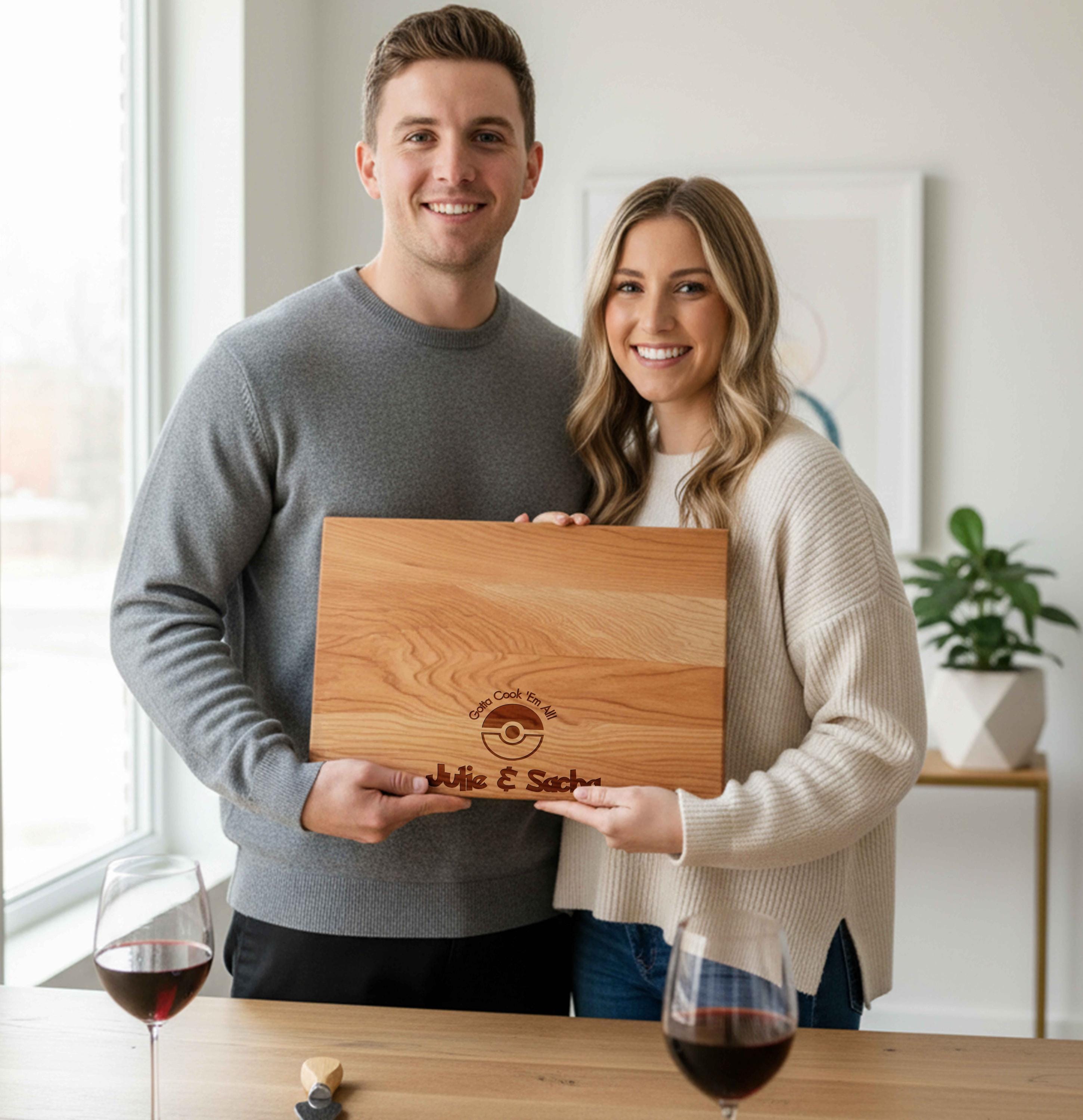 Custom Gamer Engraving: Expertly crafted, this cutting board features the spirited phrase “Gotta Cook 'Em All!” rendered in a Pokémon-inspired style. Your couple’s names and date are incorporated, creating a unique statement of love and playful rivalry.