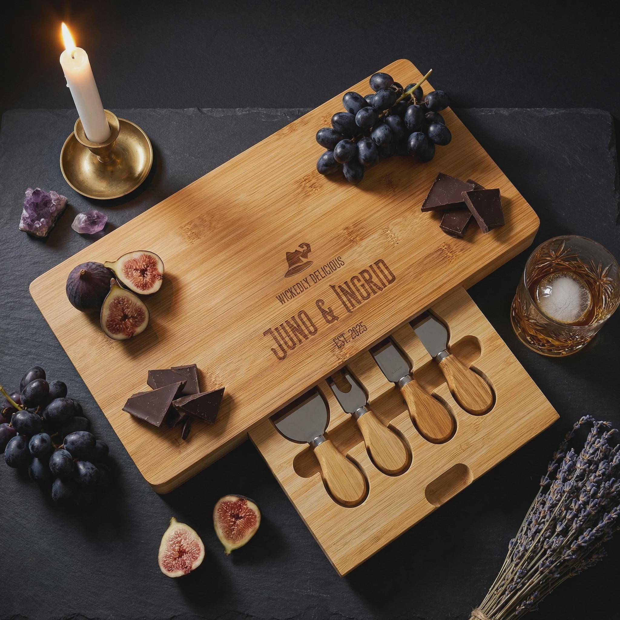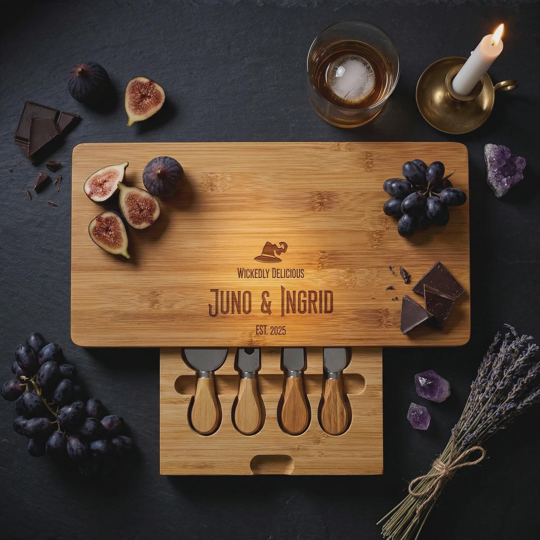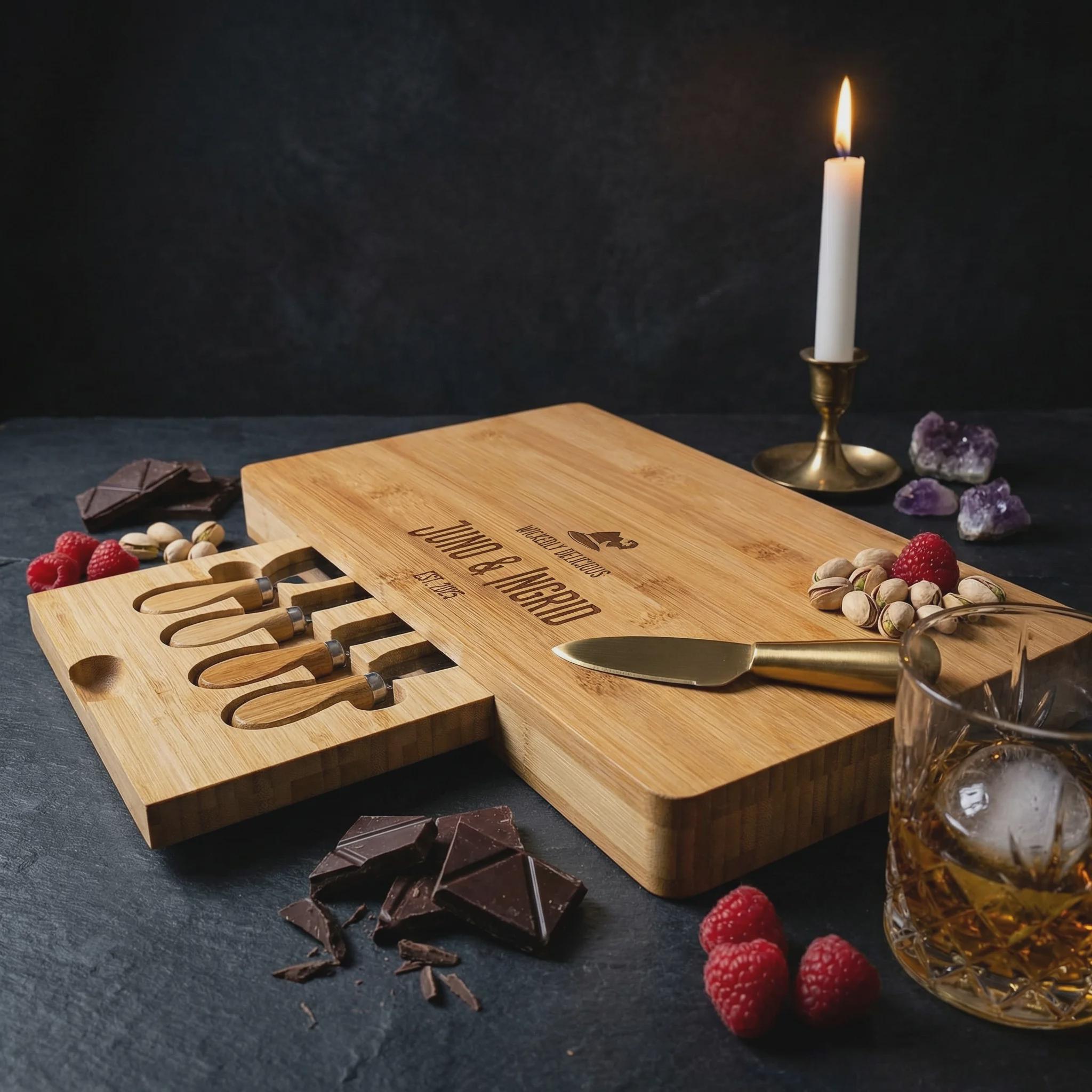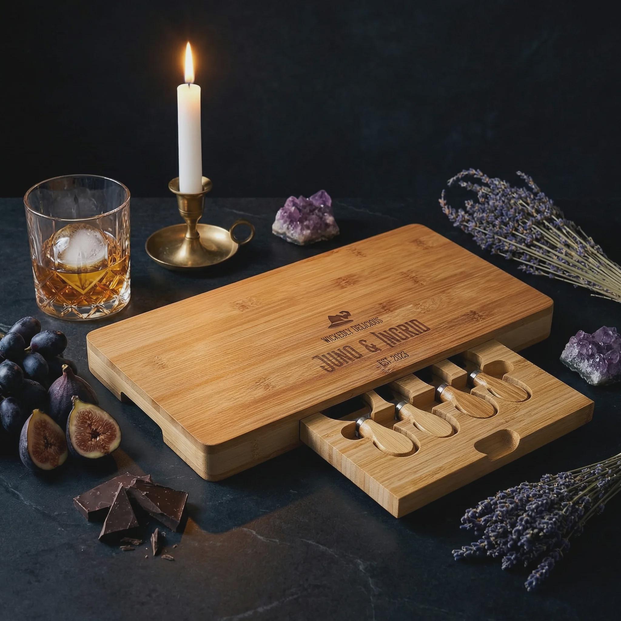 Click "Add to Cart" to create a custom engraved bamboo cheese and charcuterie board with a "Wicked" twist. Perfect for celebrating love and every wickedly sweet moment!