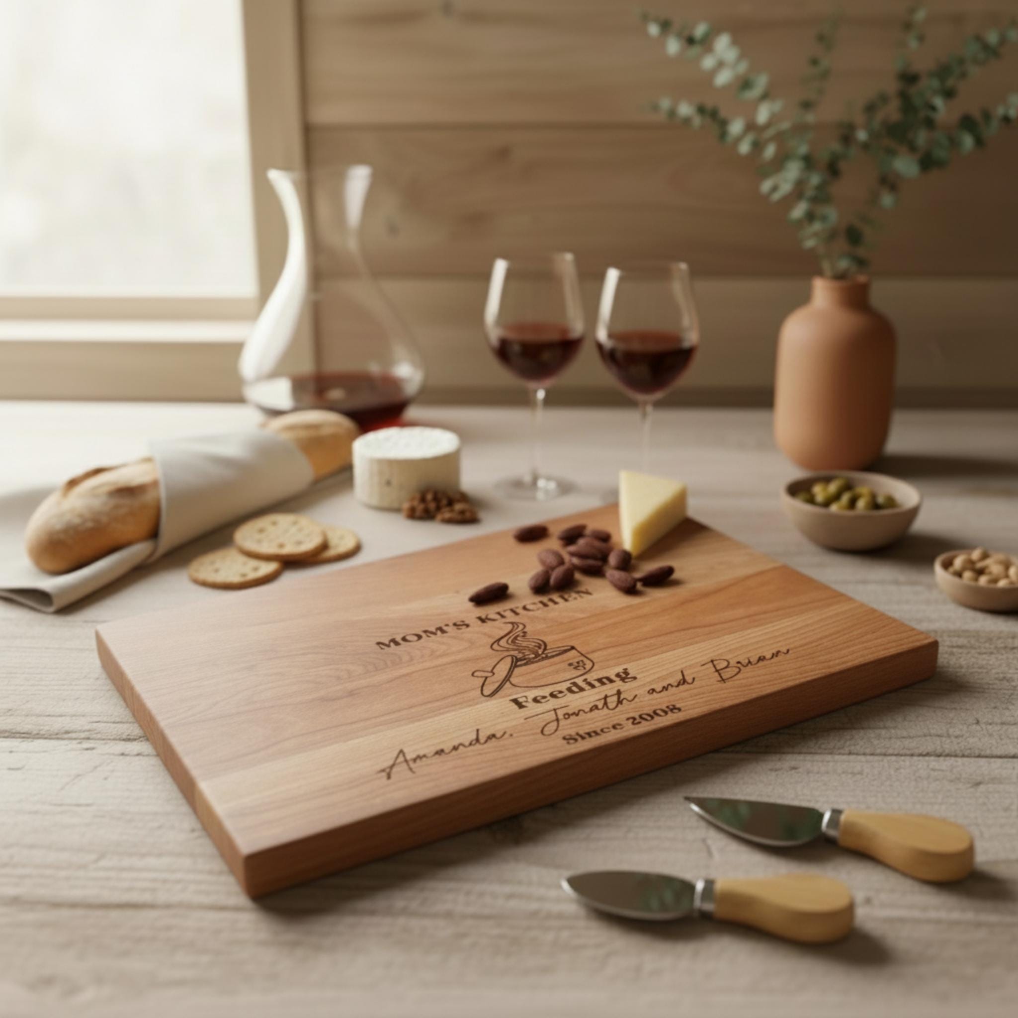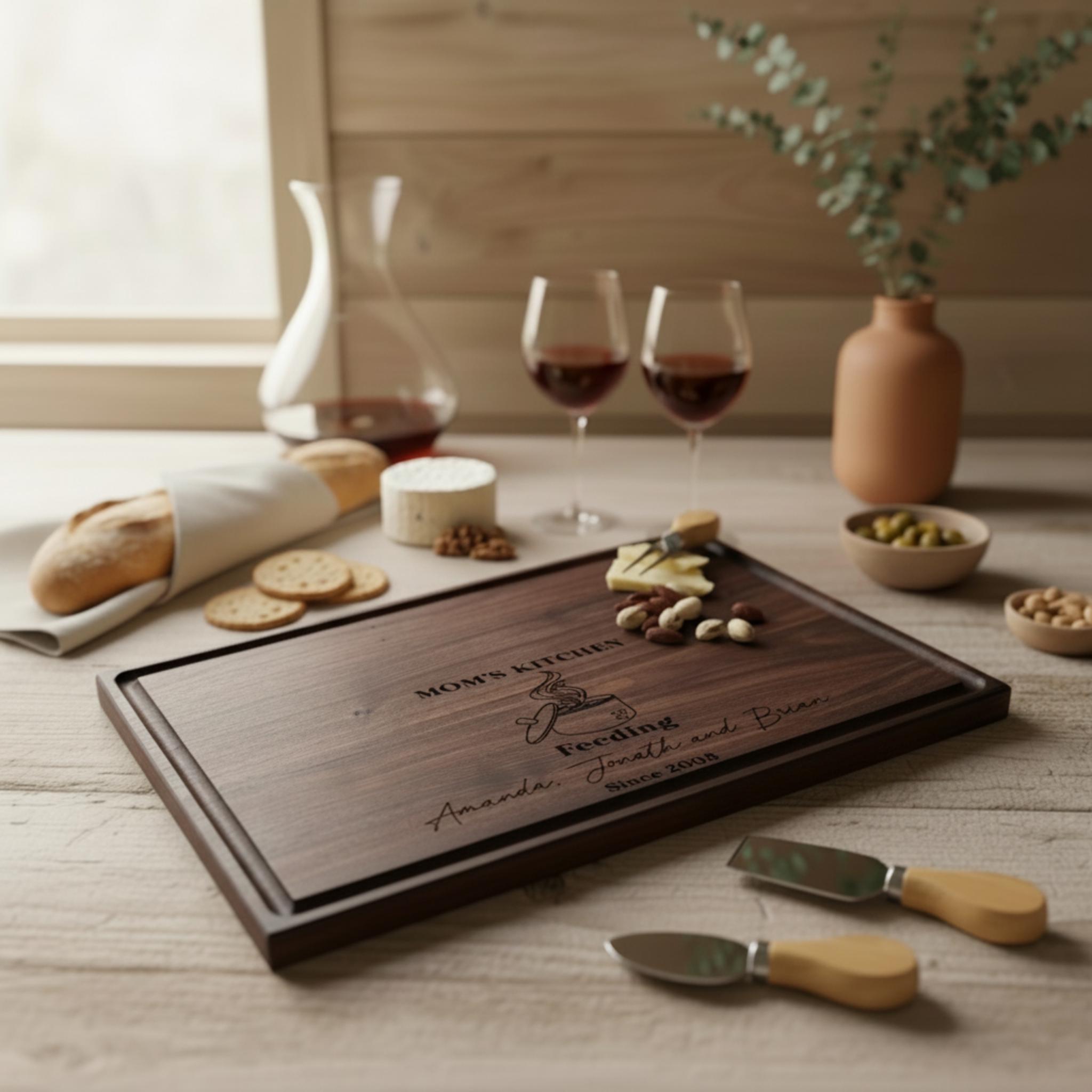 Signature Custom Engraving: Our experienced artisans carefully laser engrave “Mom’s Kitchen” into the rich surface of the board, ensuring that her personal touch is highlighted in every slice and serving.