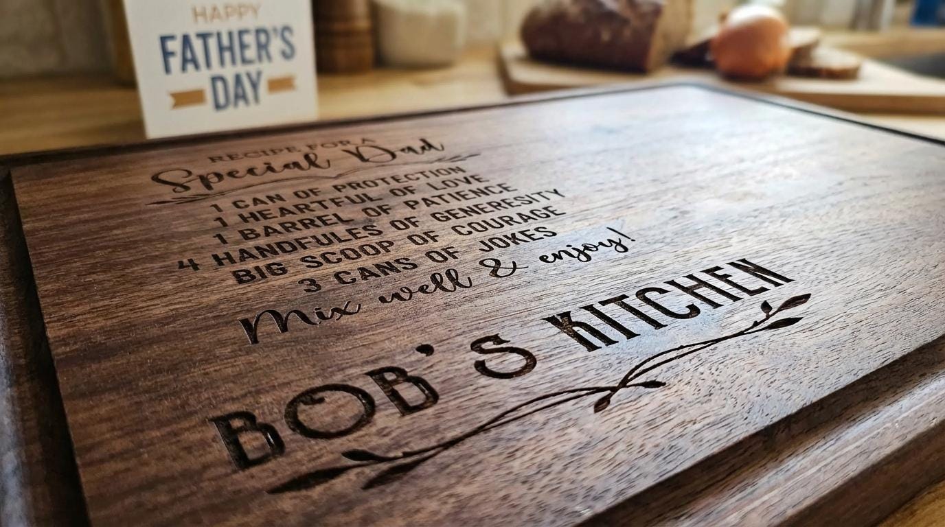 Signature Custom Engraving: Our skilled artisans use precision laser engraving to imprint the message “Recipe for Special Dad” on high-quality wood. Every slice and serve will remind him that his kitchen is filled with his special recipe for love.
