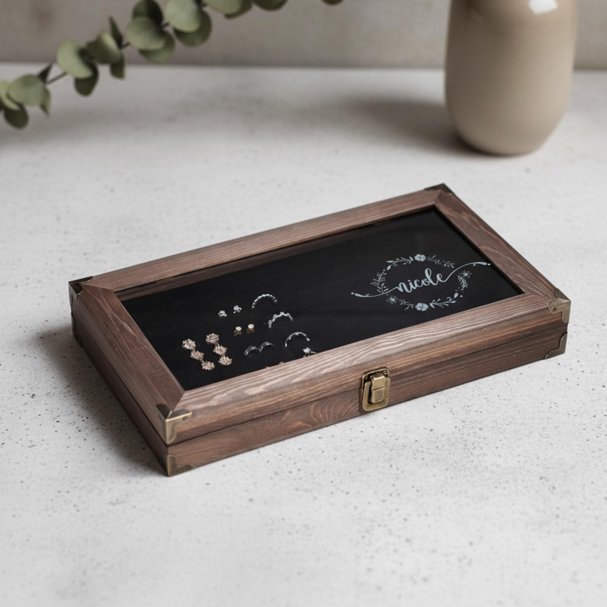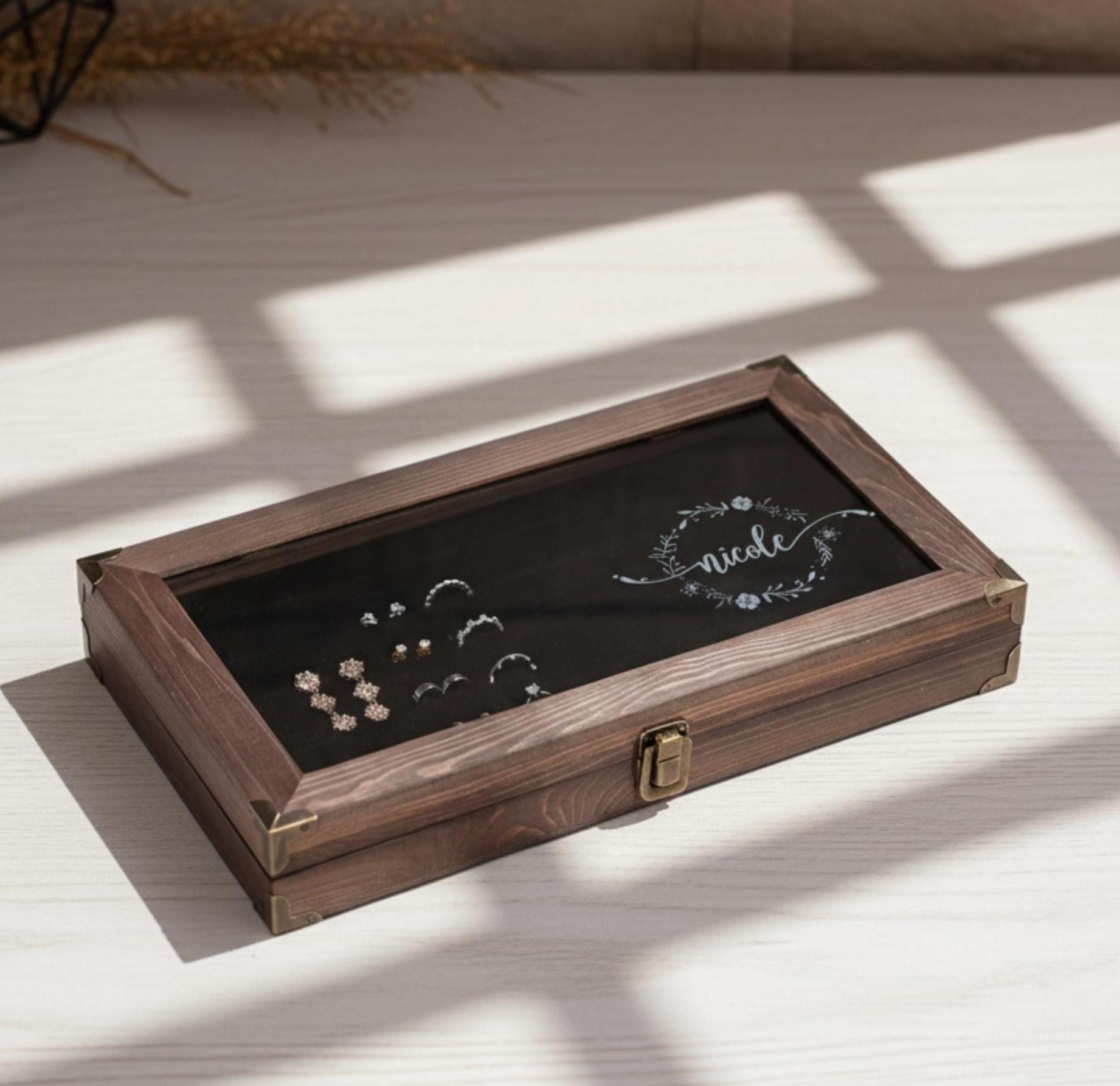 Discover the timeless charm of our Personalized Antique Jewelry Box, a perfect blend of elegance and practicality. This beautifully crafted wooden organizer features a clear glass lid, allowing you to admire your treasured collection while keeping it secure and organized.