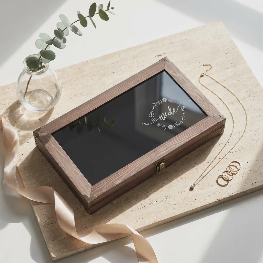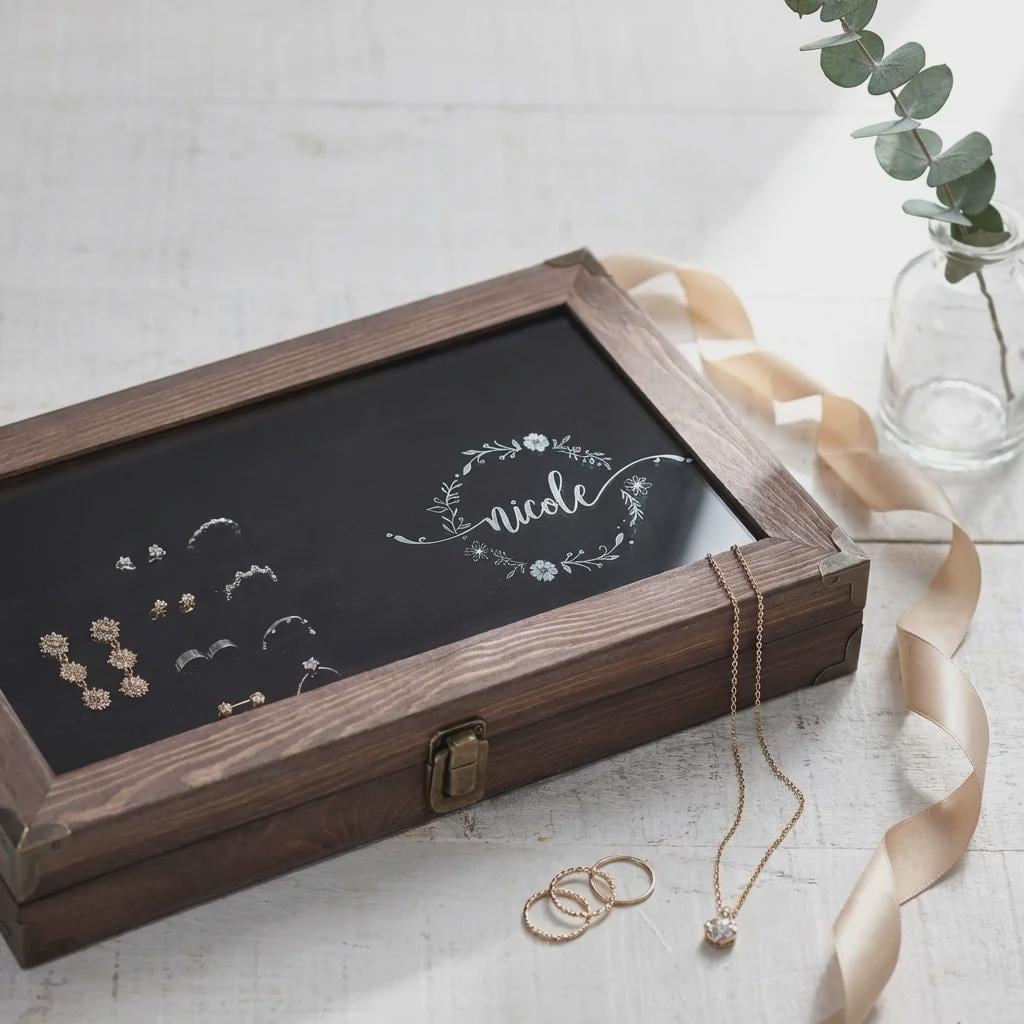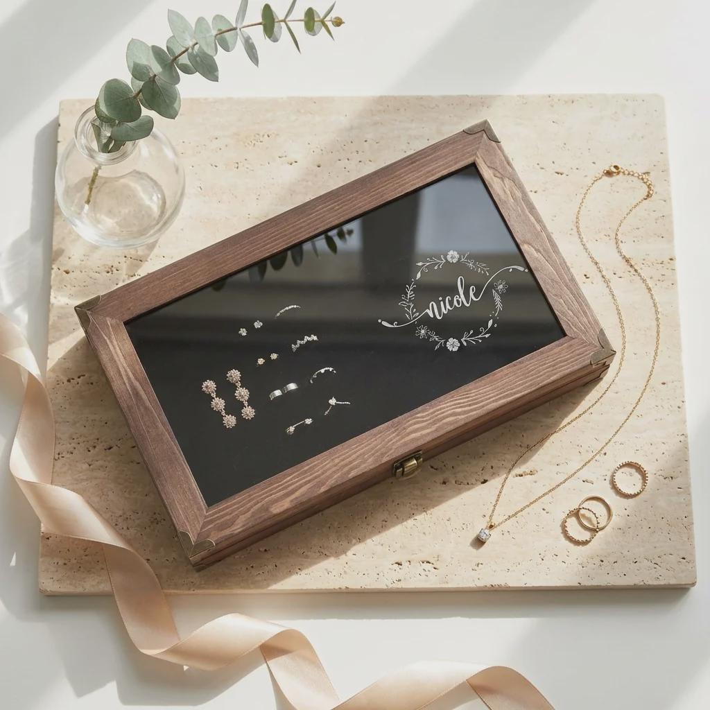 Personalized Wood Jewelry Box with Glass Lid, Custom Engraved Earring Organizer, Gift for Her
