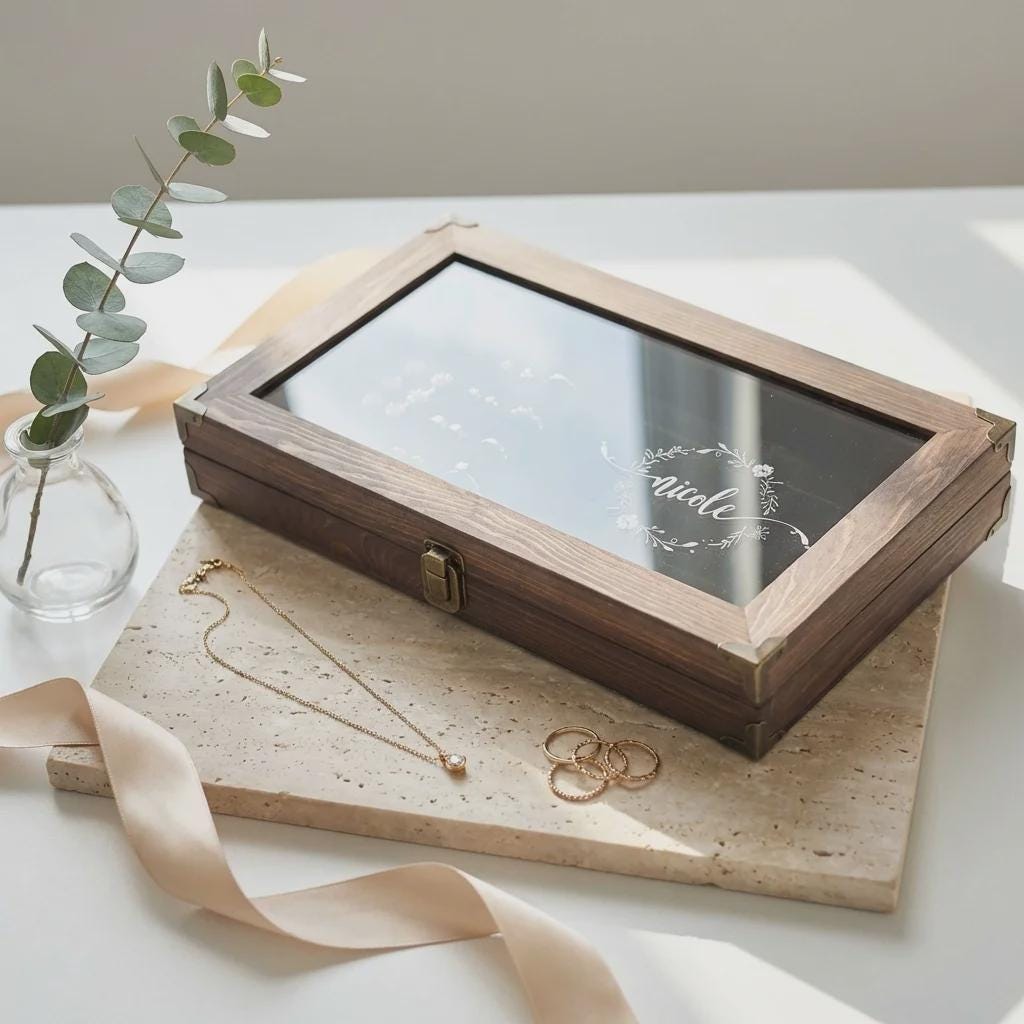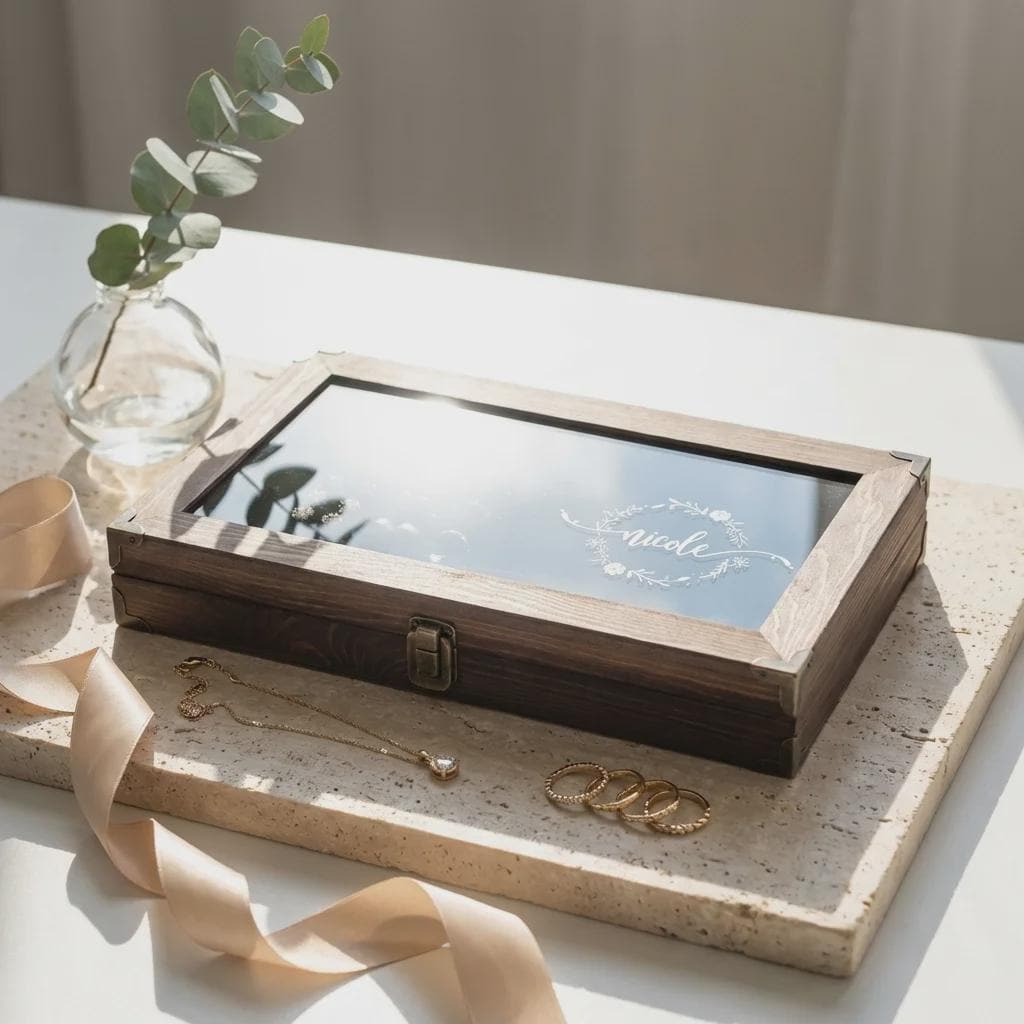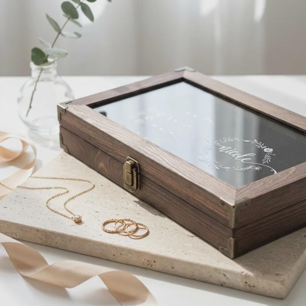 Personalized Wood Jewelry Box with Glass Lid, Custom Engraved Earring Organizer, Gift for Her