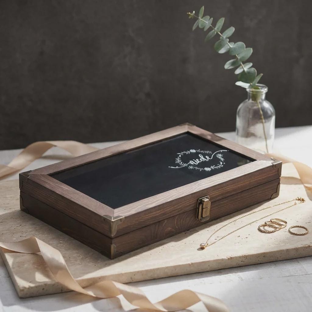 Discover the timeless charm of our Personalized Antique Jewelry Box, a perfect blend of elegance and practicality. This beautifully crafted wooden organizer features a clear glass lid, allowing you to admire your treasured collection while keeping it secure and organized.
