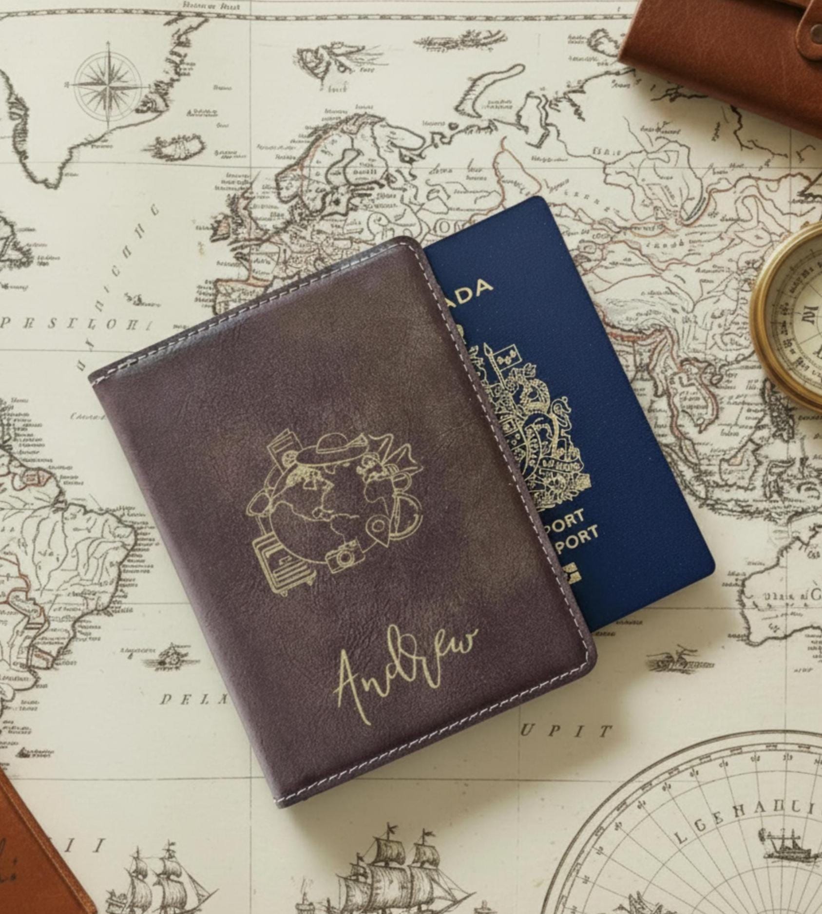 Fuel your wanderlust with our personalized vegan leather passport cover, intricately engraved with a unique travel montage. This beautifully detailed design features a globe, a classic suitcase, a pair of stylish sunglasses, and evocative travel pictures—all on premium, cruelty‑free vegan leather. Perfect for adventurers who value style and substance, this cover protects your passport while igniting the spirit of exploration.