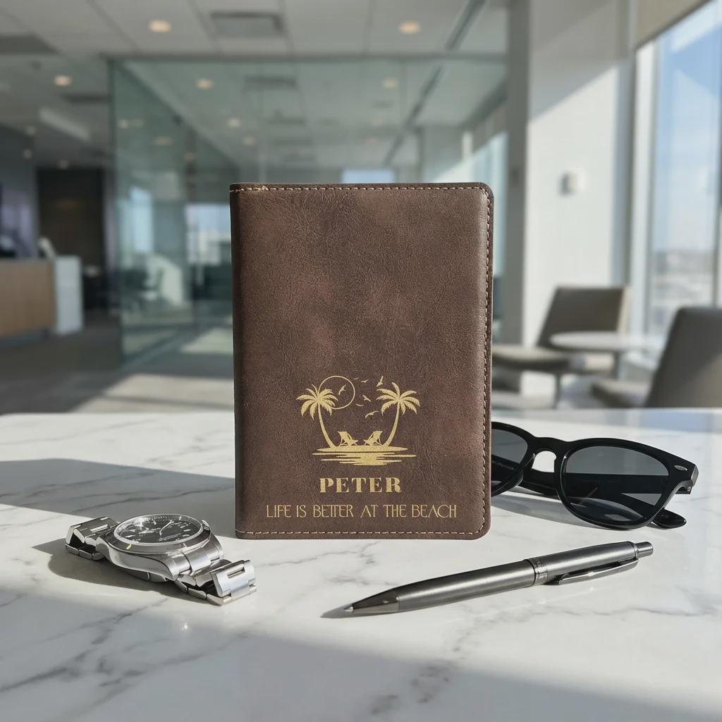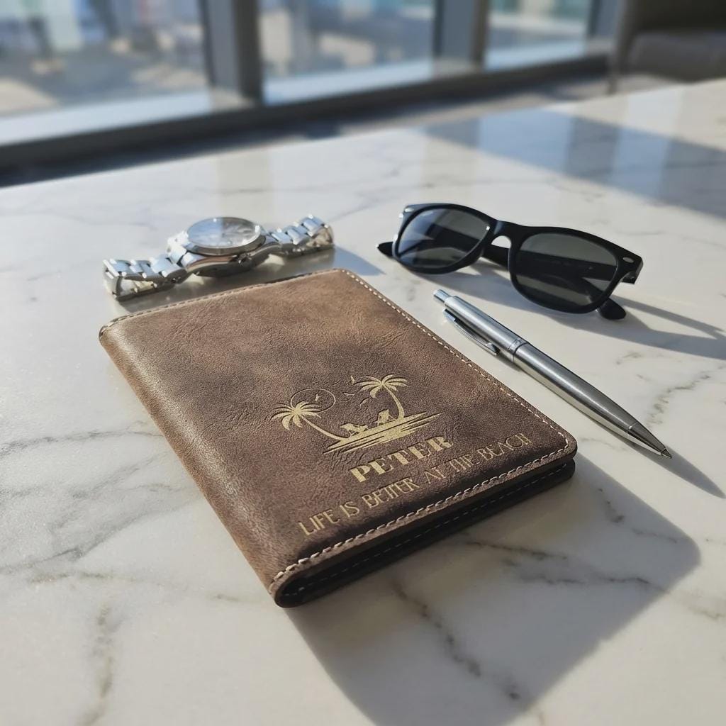 Escape to the sun with this personalized beach passport holder. Featuring a custom 'Life is Better at the Beach' engraving, this vegan leather travel wallet is the perfect retirement gift or vacation accessory for sun seekers and snowbirds.