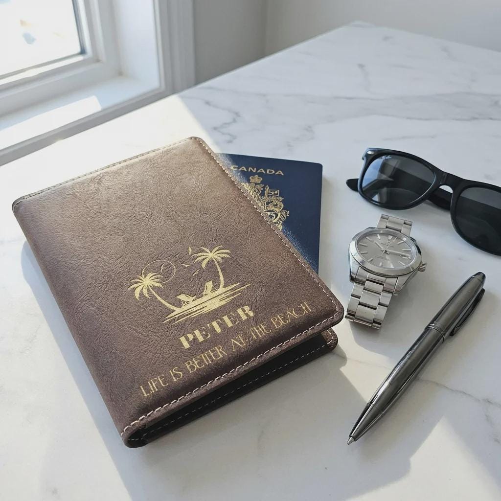 Personalized Vegan Leather Passport Cover, Custom Beach Design Travel Wallet, Retirement Gift for Him