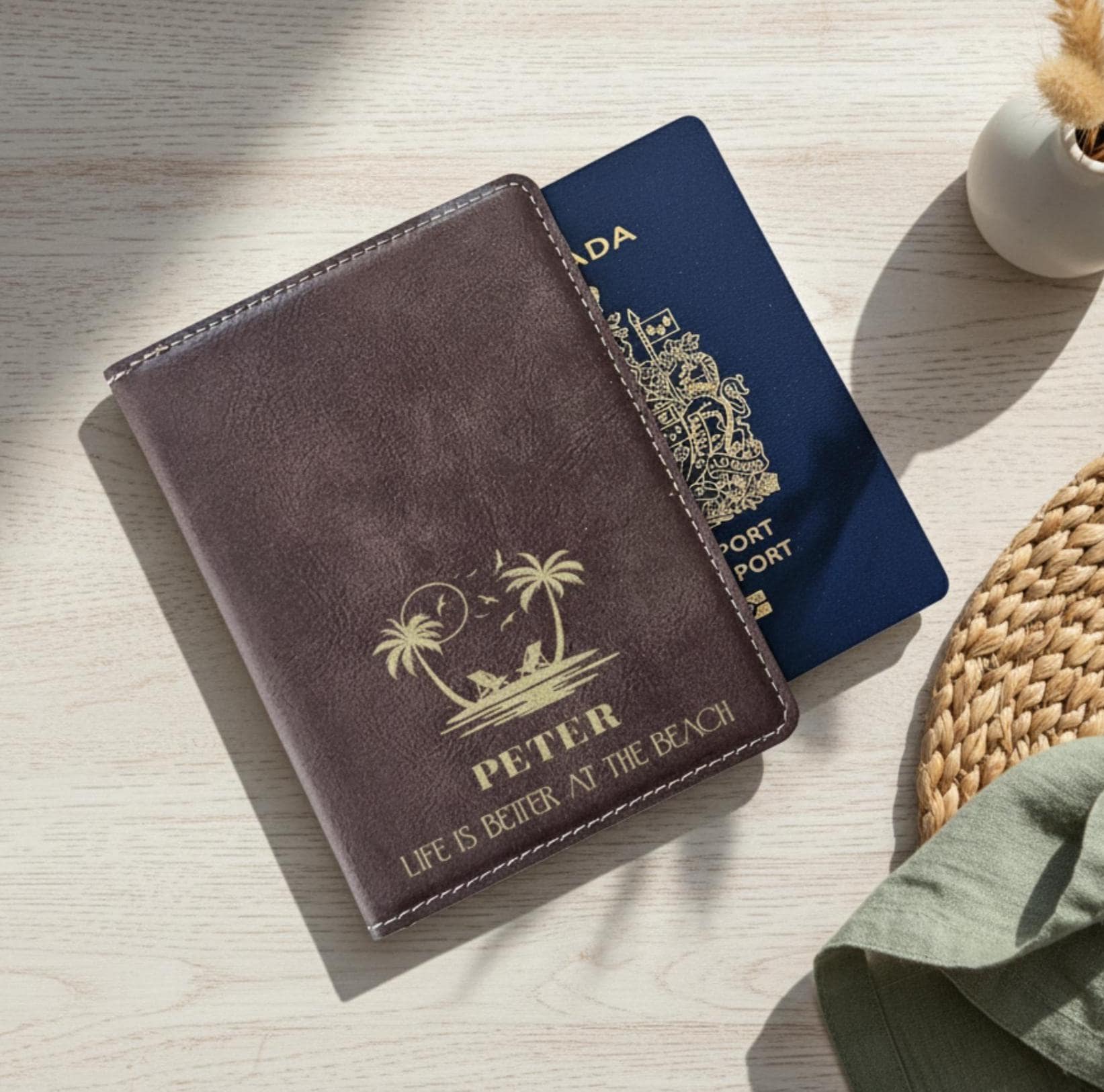 Embrace the tropical spirit with our personalized vegan leather passport cover. This unique travel accessory is meticulously engraved with a sun-kissed scene featuring palm trees, lounge chairs, playful birds, and your custom name alongside the inspiring quote “Life is Better at the Beach.” Crafted from premium, eco‑friendly vegan leather, it’s the perfect companion for anyone who dreams of endless summer and sandy shores—all while keeping your travel essentials safe.