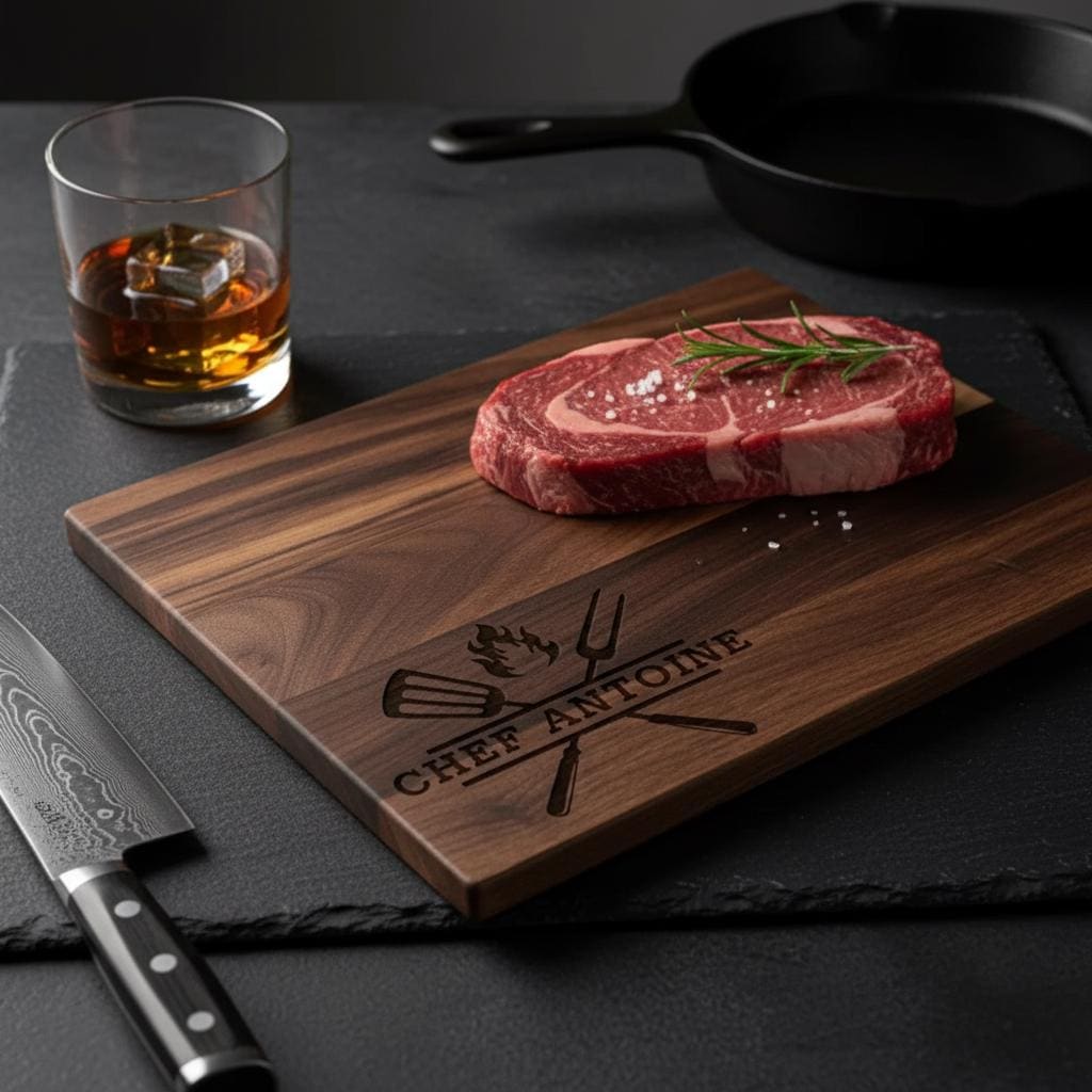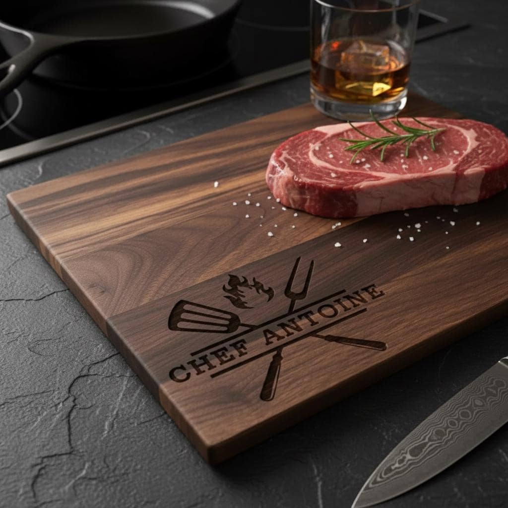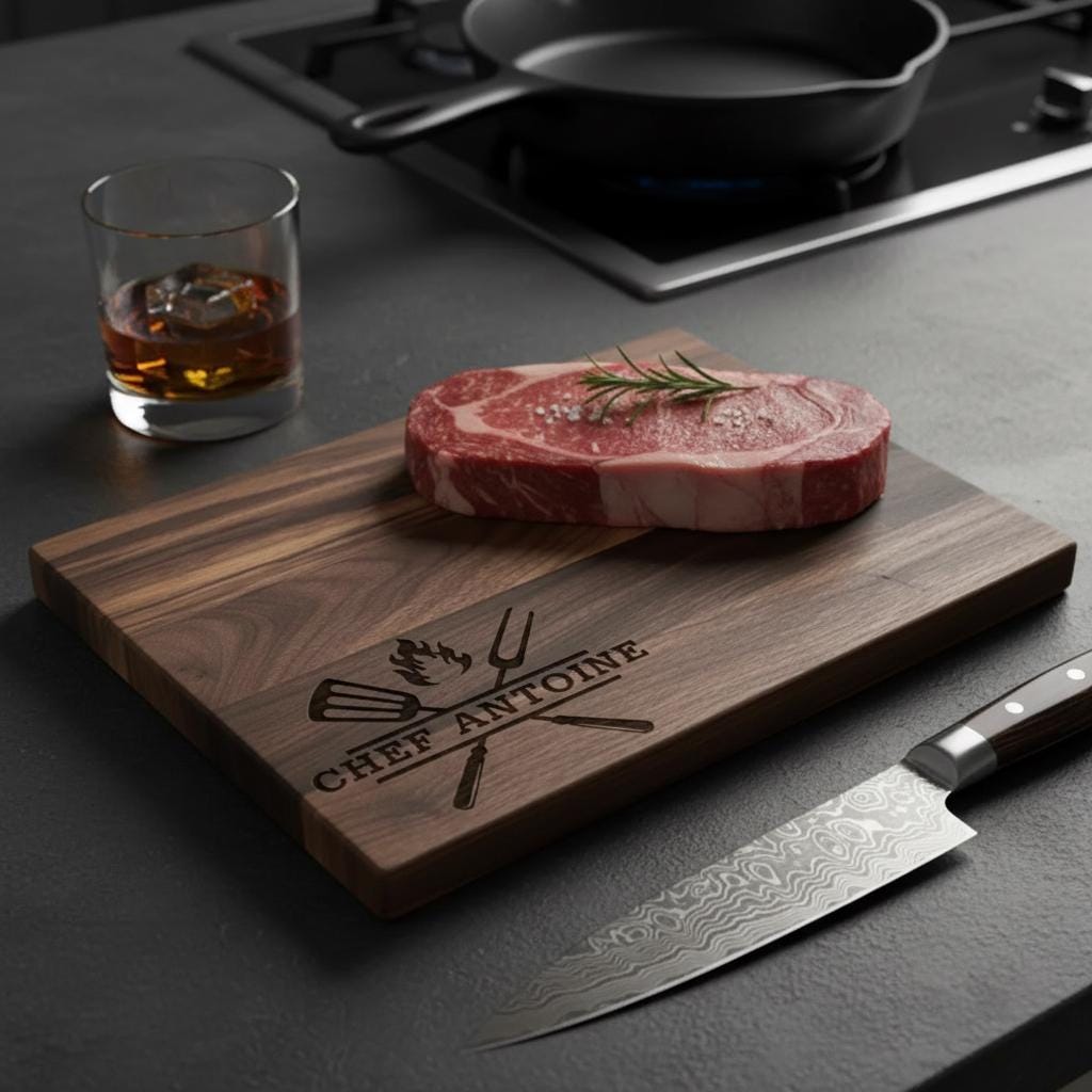 Celebrate your love for grilling with our BBQ cutting board, designed especially for the passionate chef. Each board is meticulously made with precision and care, featuring custom laser engraving that highlights essential BBQ tools, a dynamic flame design, and your chef’s name. This exceptional piece transforms a practical kitchen tool into a cherished memento, seamlessly blending everyday functionality with rustic, eye-catching decor.