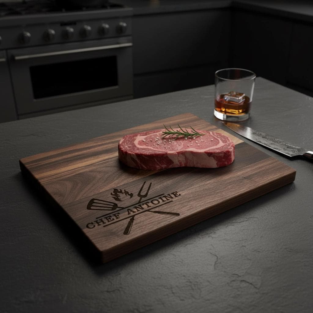 Elegant Custom Engraving: Our cutting board is thoughtfully engraved with a dynamic design featuring essential BBQ tools and flickering flames, perfectly accented by your chef’s name. This personalized detail captures the spirit of outdoor cooking and adds a bold statement to your culinary space.