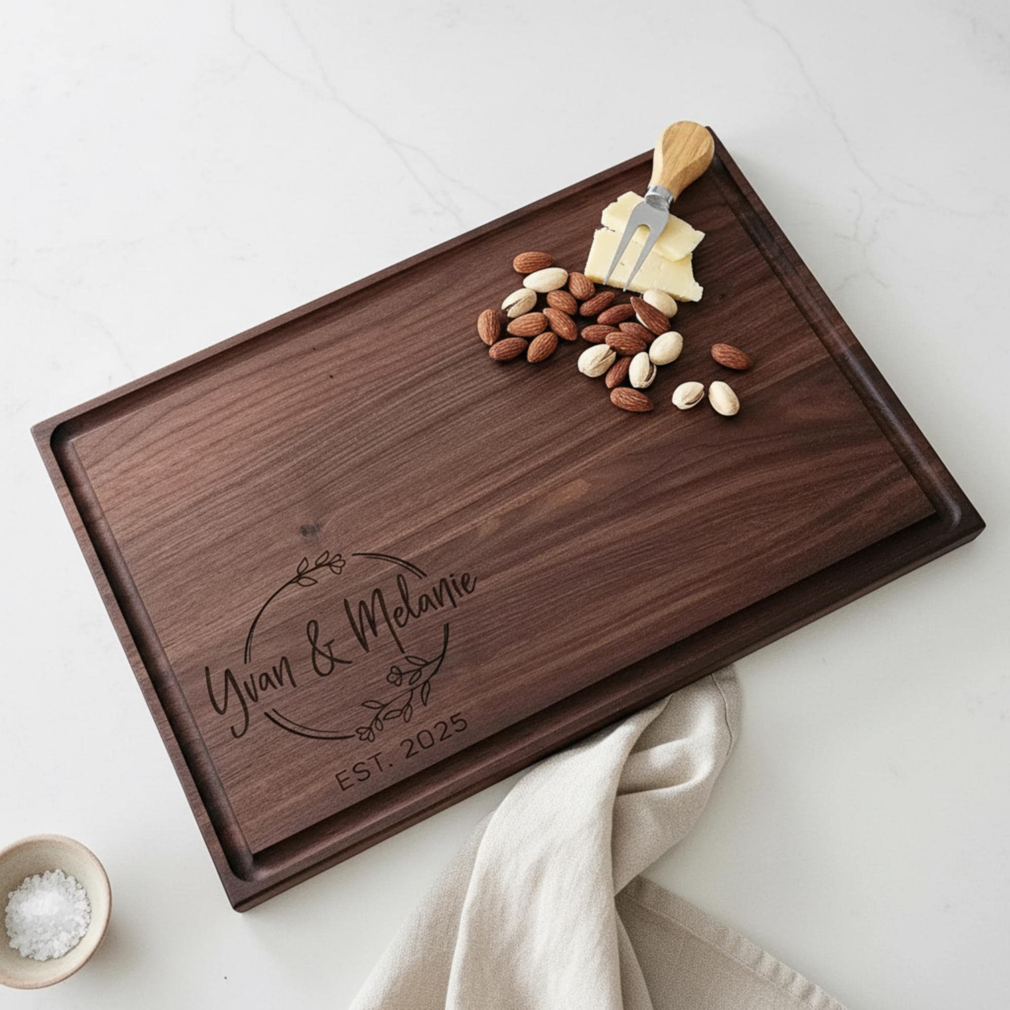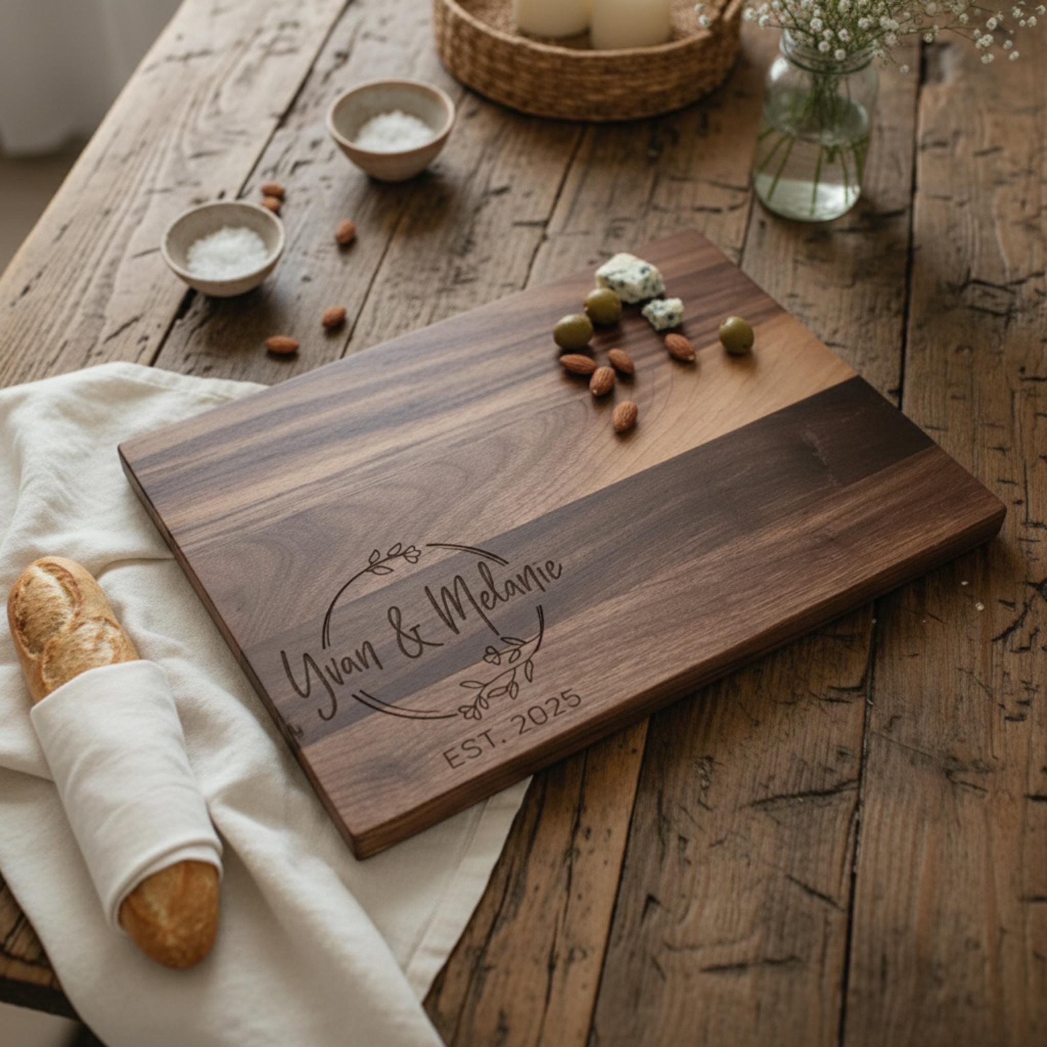 Elegant Custom Engraving: Each board is intricately engraved with a floral wreath design that frames the couple’s names, creating a heartfelt tribute to their love. This personalized detail adds a unique, romantic statement to your kitchen or dining space.