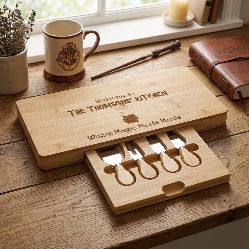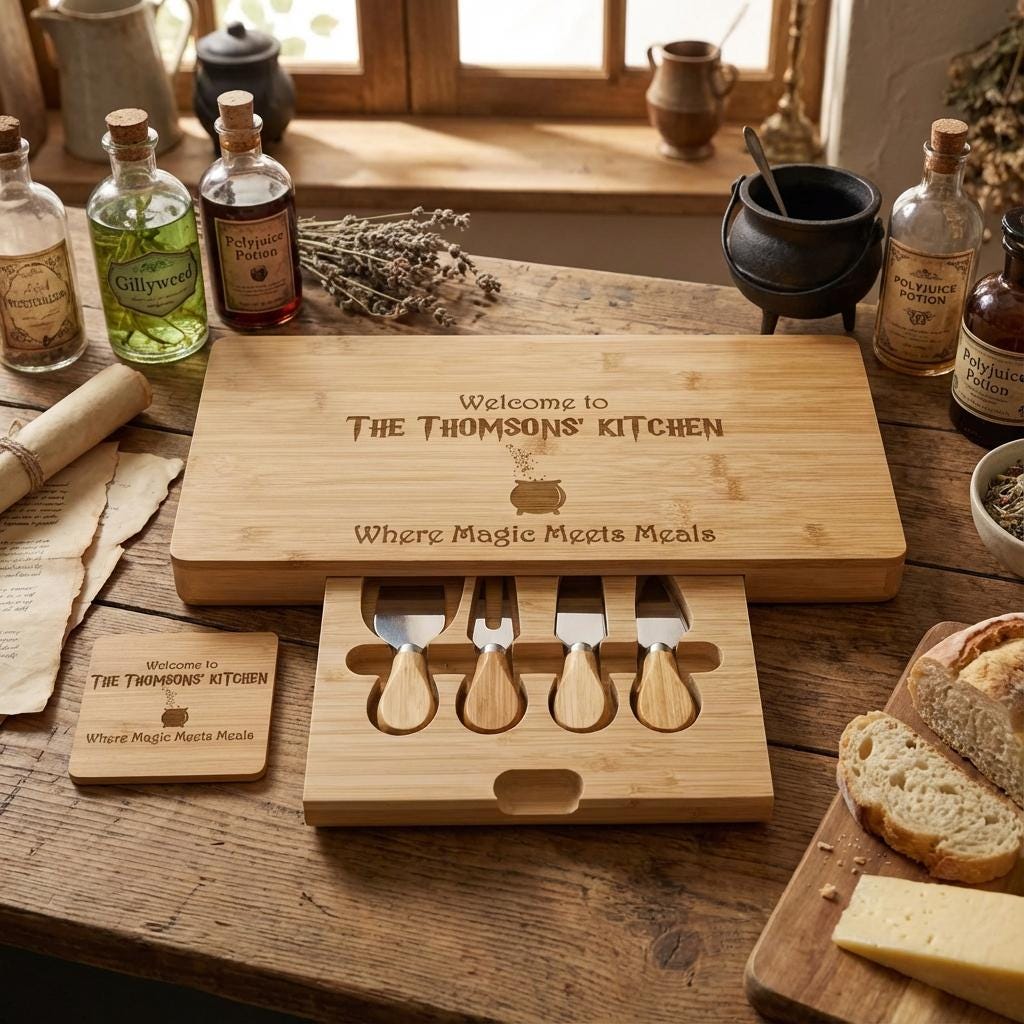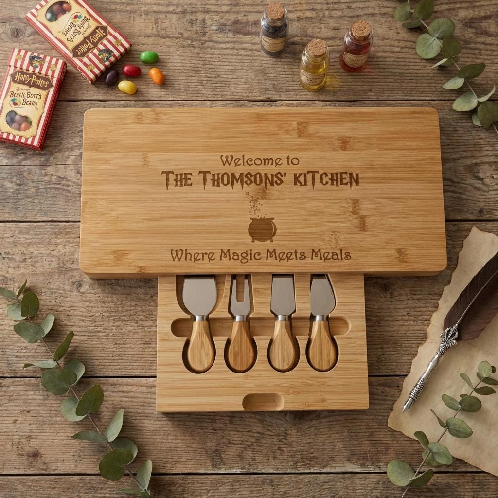 Cast a spell on their kitchen with this personalized wizard charcuterie board set. Featuring a custom 'Magic Meets Meals' engraving, this bamboo cheese board features a slide-out knife drawer and matching coasters—the ultimate geeky housewarming gift.