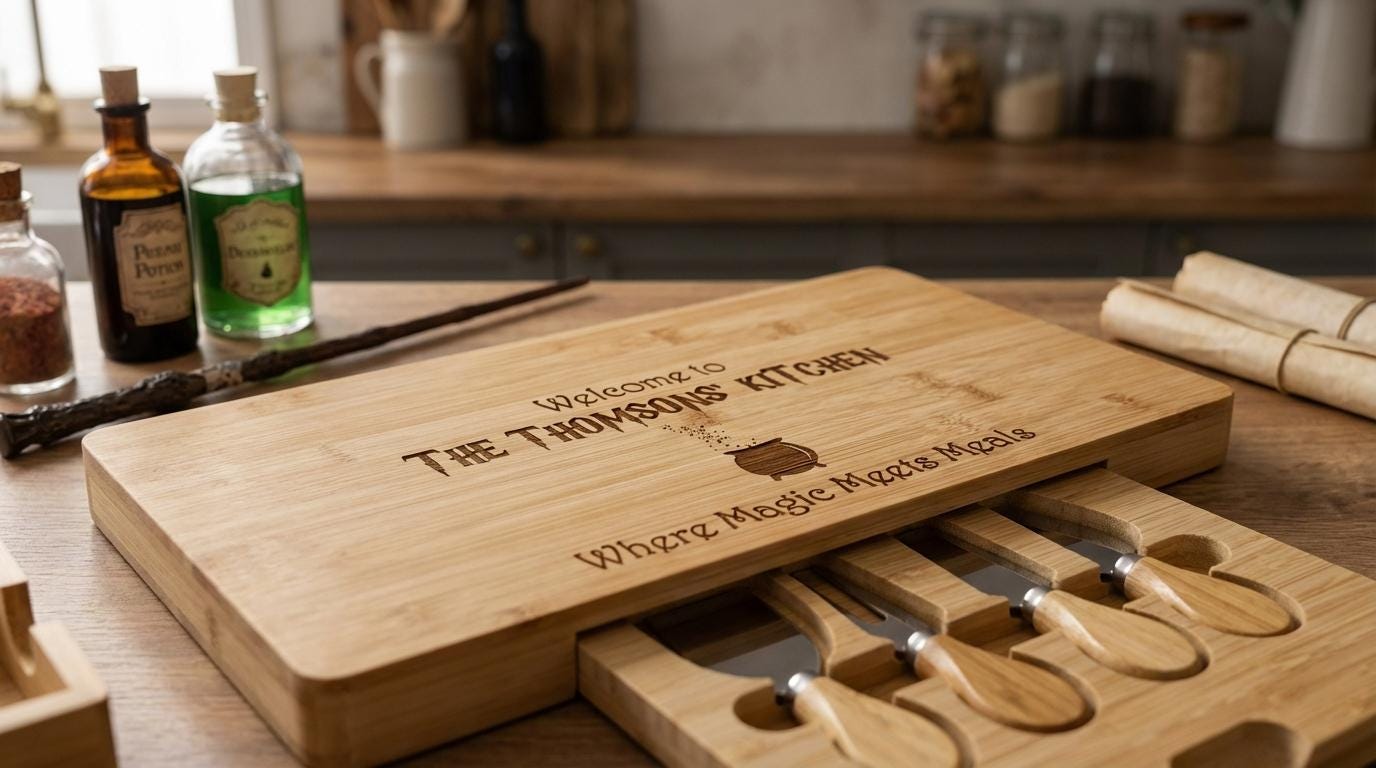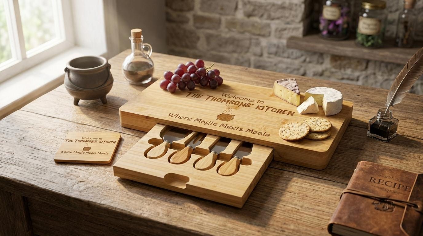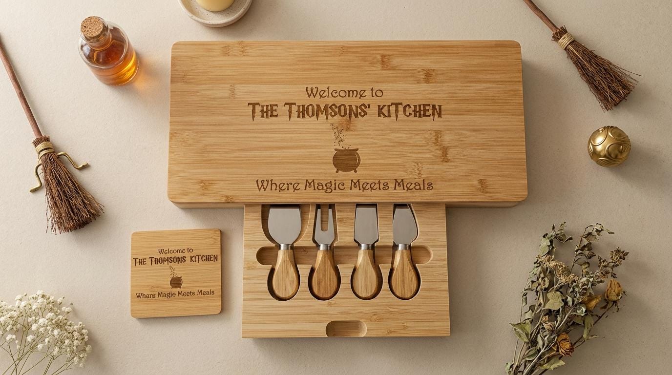 Cast a spell on their kitchen with this personalized wizard charcuterie board set. Featuring a custom 'Magic Meets Meals' engraving, this bamboo cheese board features a slide-out knife drawer and matching coasters—the ultimate geeky housewarming gift.