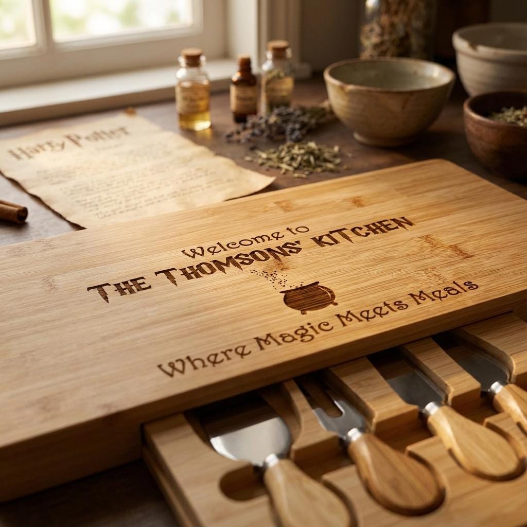 The board is exquisitely engraved with the enchanting message: "Welcome to [Name]'s Kitchen—Where Magic Meets Meals." This striking personalization transforms an everyday serving piece into a cherished keepsake—ideal for housewarmings, weddings, anniversaries, and special gatherings. The sophisticated laser engraving, rendered in a style reminiscent of your favorite magical tales, adds an unmistakable allure to any culinary space.