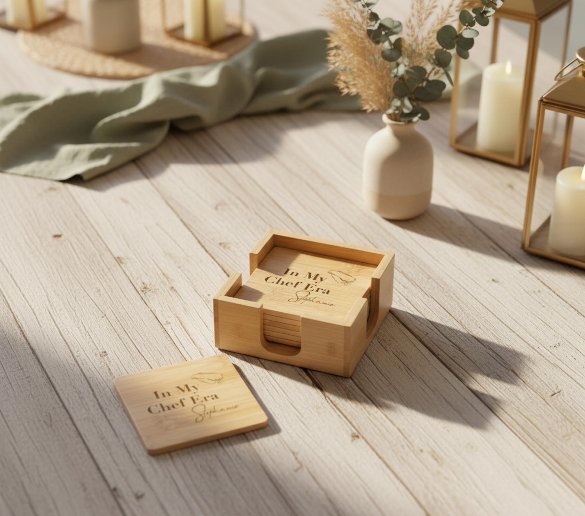 Bamboo Coaster Set: A 5-piece set with 4" x 4" coasters and a matching holder.