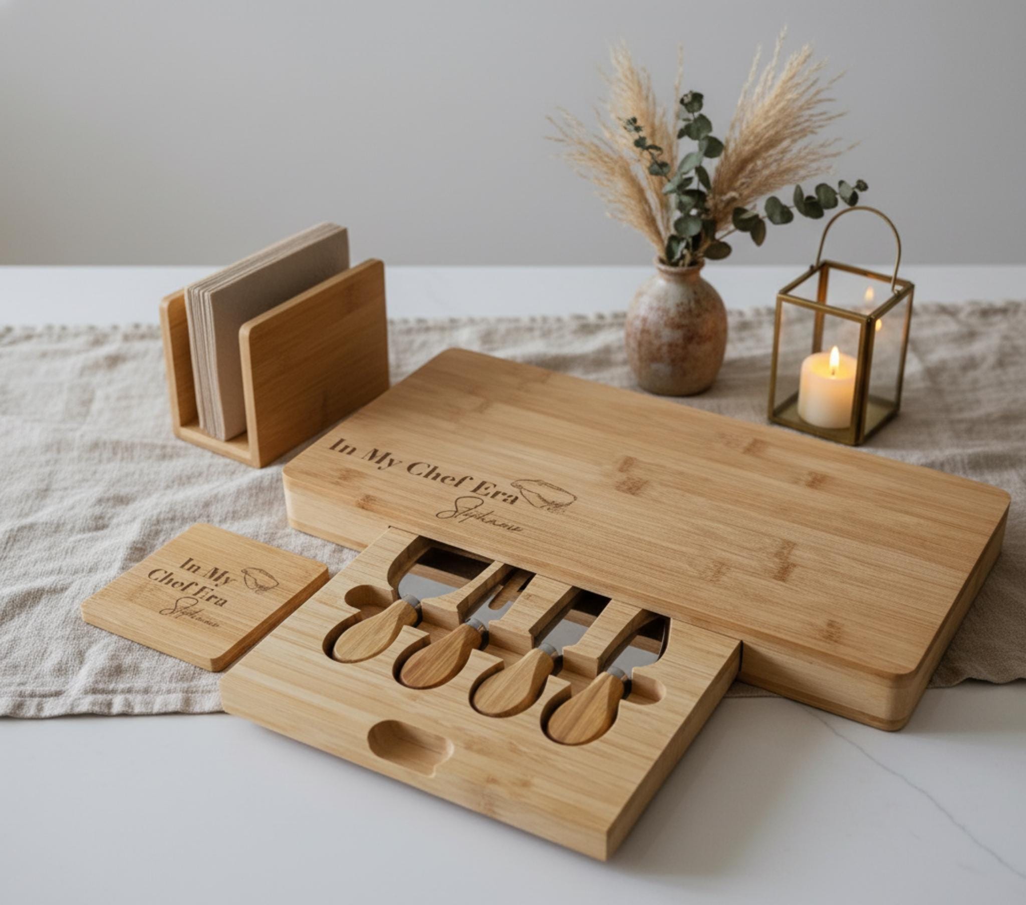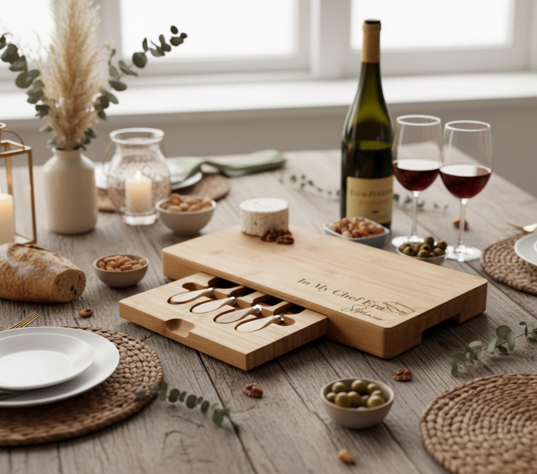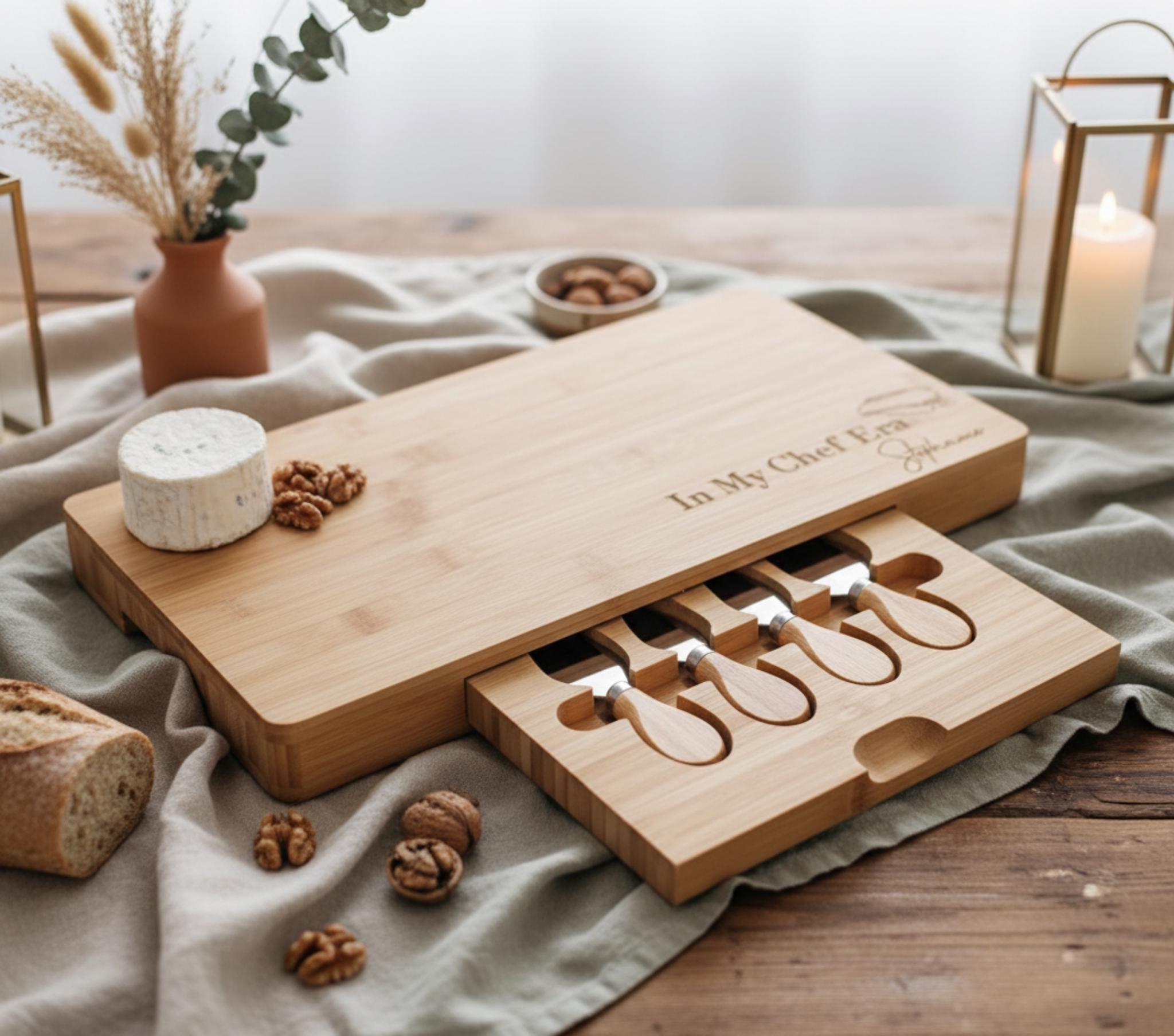 Transform your entertaining space with our Personalized Cheese Board, a meticulously laser-engraved bamboo charcuterie and serving board that effortlessly marries modern sophistication with a playful culinary twist. Expertly crafted from premium, eco‑friendly bamboo, this board enhances your presentation and serves as a unique conversation starter. Designed with both beauty and practicality in mind, it’s the perfect canvas for showcasing your personalized engraving.