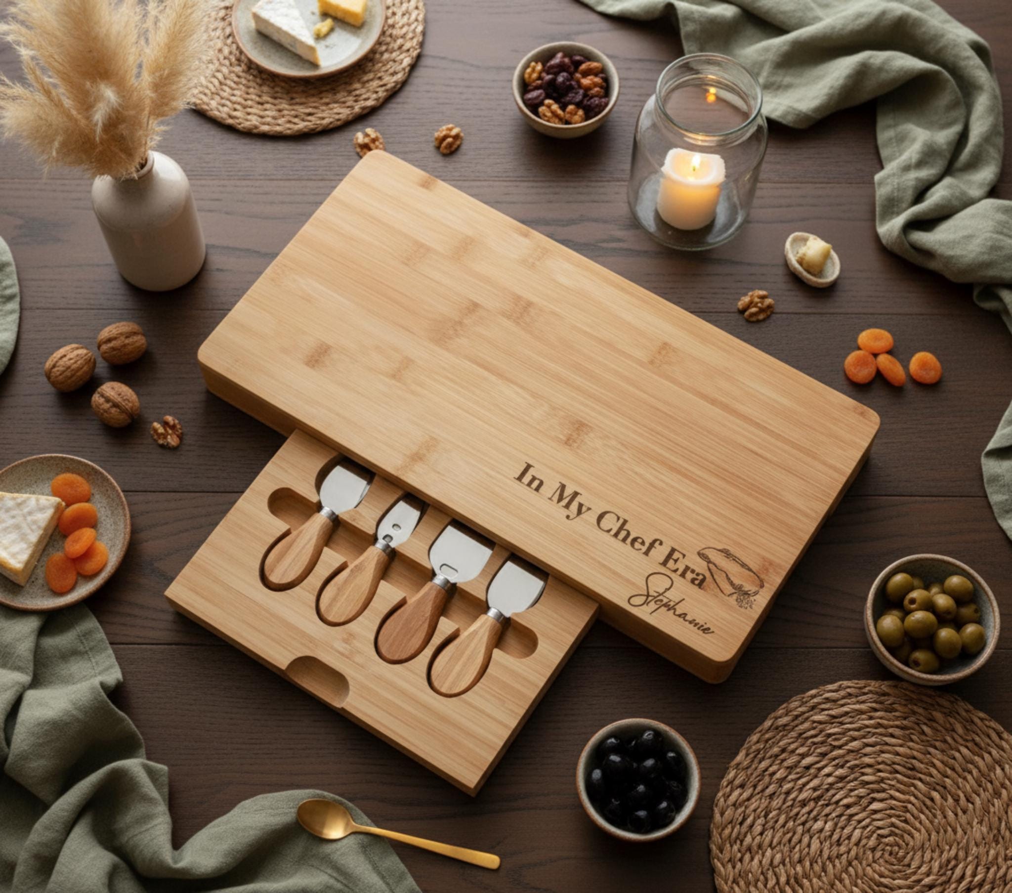 Imprinted with the captivating phrase “In my Chef Era” and personalized with your name, this cheese board becomes more than just a serving piece—it’s a statement of style, humor, and culinary passion. Imagine hosting an intimate dinner or a lively gathering where your board proudly declares your entry into a world of gourmet creativity and kitchen mastery. The enchanting precision laser engraving lends an artistic flair, transforming your board into a cherished keepsake that celebrates every meal and moment.
