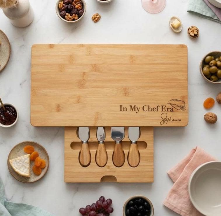 Embrace your culinary journey with this personalized 'In My Chef Era' charcuterie board set. Featuring a hidden knife drawer and custom name engraving, this bamboo cheese platter is the ultimate trendy kitchen gift for foodies and home cooks.