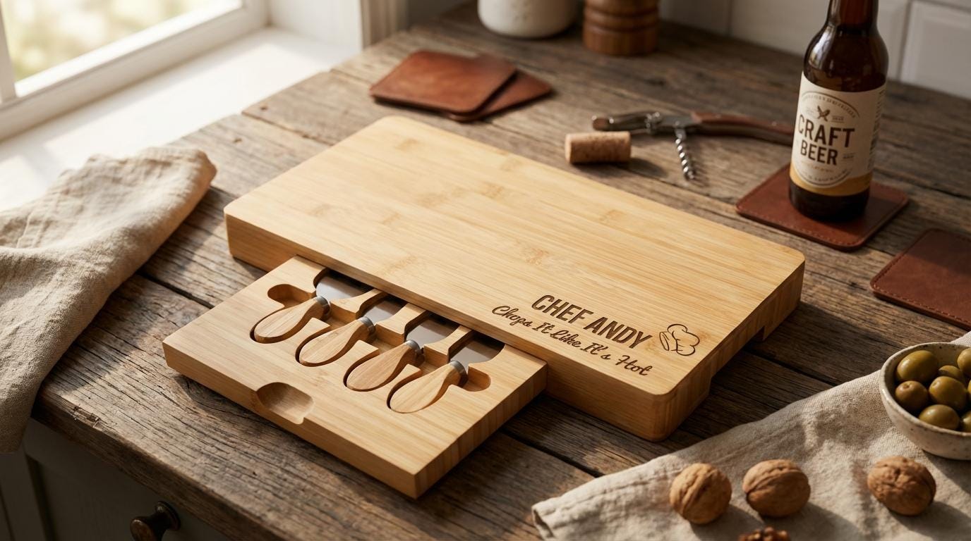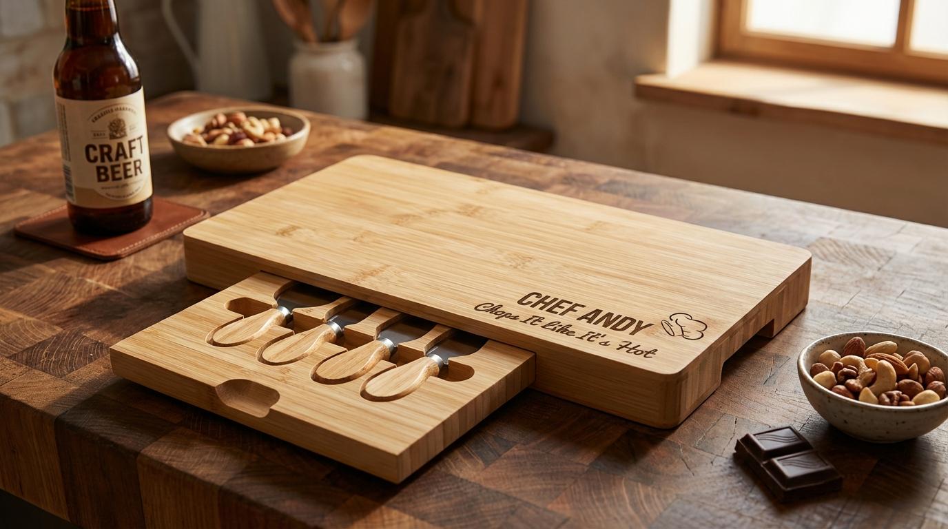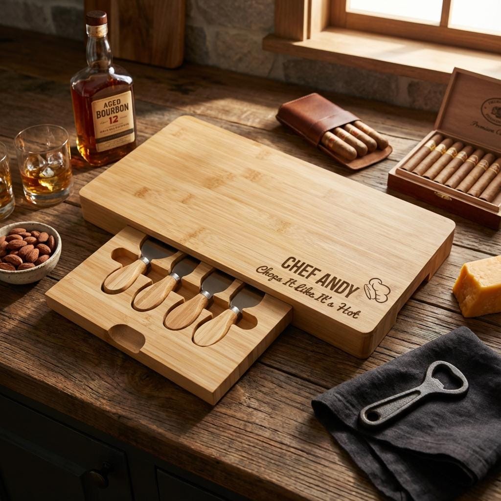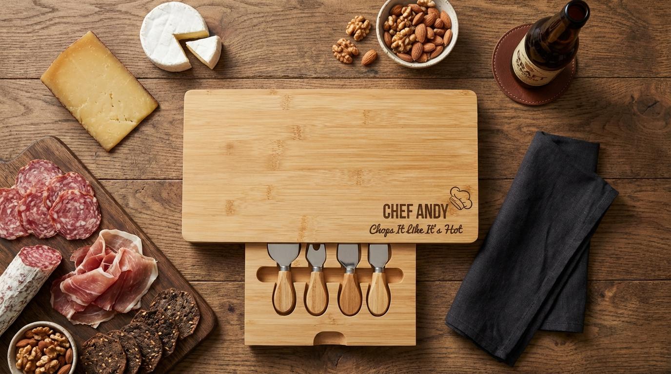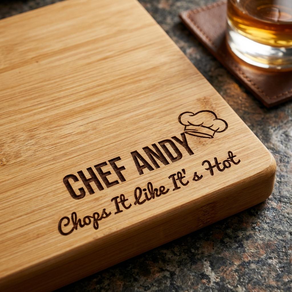 Personalized Chef Cutting Board Set | Custom "Chops It Like It's Hot" Bamboo Cheese Platter & Funny Gift for Dad