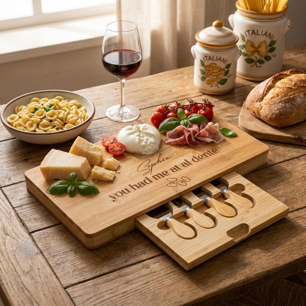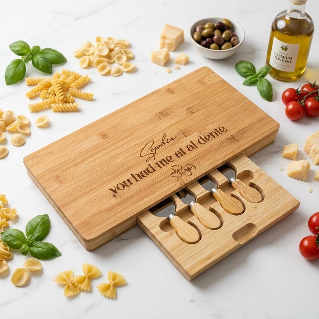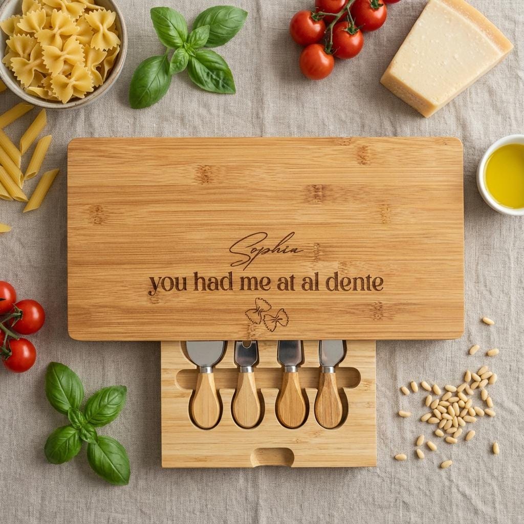Serve up a side of romance and humor with this personalized pasta lover charcuterie board. Featuring the funny 'You Had Me At Al Dente' engraving and a slide-out knife drawer, this bamboo cheese board set is the perfect anniversary gift or date night essential.