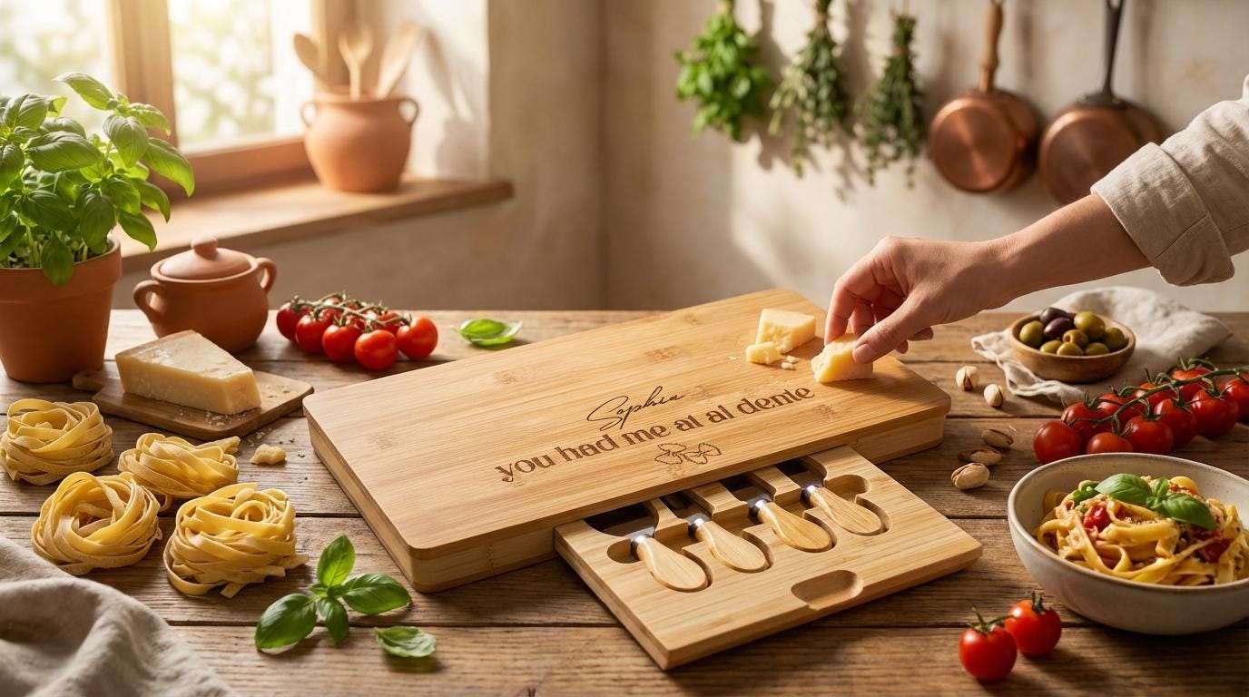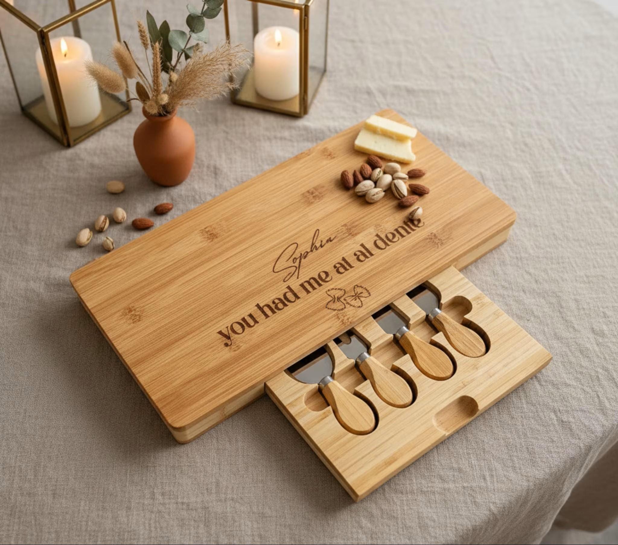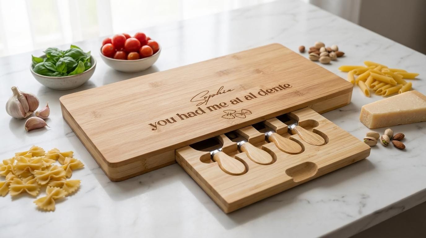Serve up a side of romance and humor with this personalized pasta lover charcuterie board. Featuring the funny 'You Had Me At Al Dente' engraving and a slide-out knife drawer, this bamboo cheese board set is the perfect anniversary gift or date night essential.