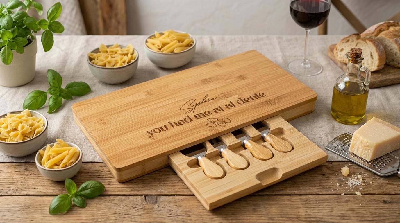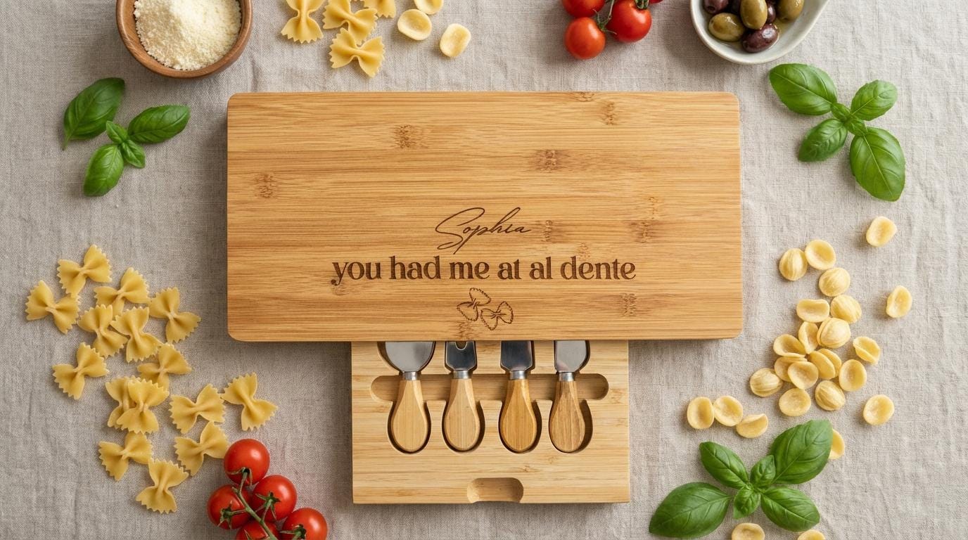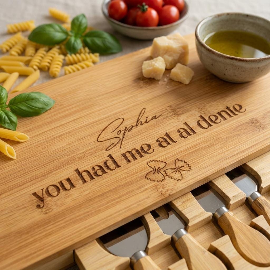 Personalized Pasta Lover Gift | "You Had Me At Al Dente" Bamboo Charcuterie Board Set & Funny Gift for Wife