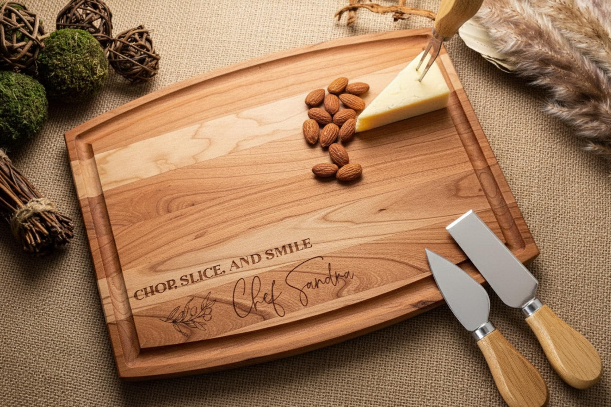 Beautiful laser engraved personalization with "Chef Sandra" and the cheerful "Chop, Slice, and Smile" quote, complemented by an elegant olive branch design for a stylish touch.
