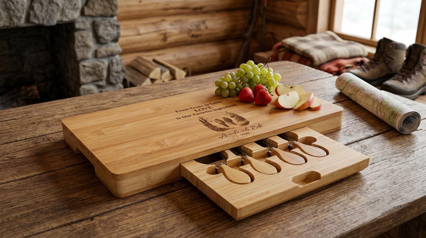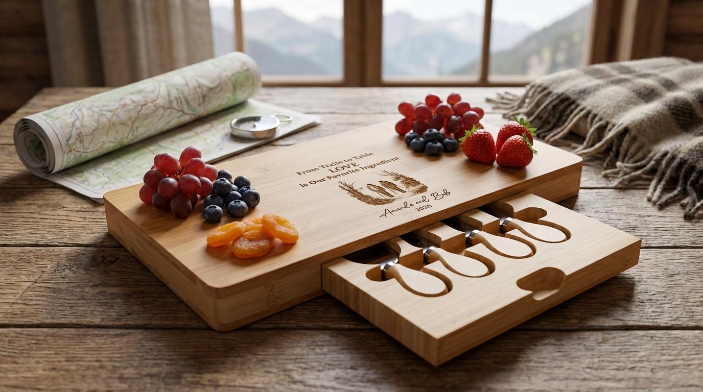 Celebrate Adventure & Flavor with Our Custom Engraved Bamboo Cheese Board.