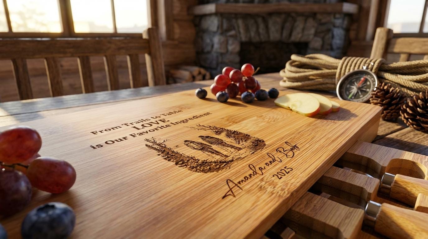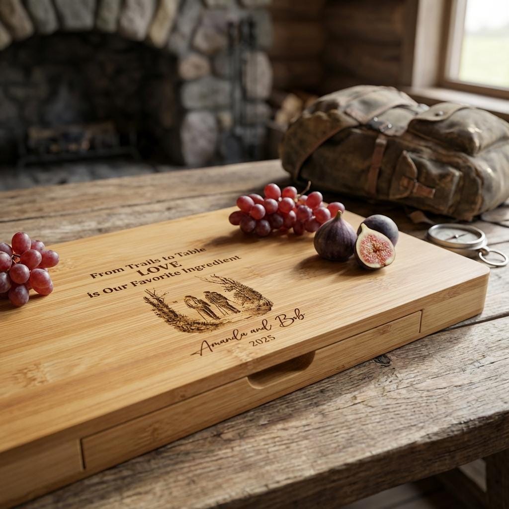 Engraved with the witty phrase "From Trails to Table" and the couple's names, this cheese board transforms into a practical keepsake. Whether it’s a gift for an adventure lover, a nature-loving duo, or a camping family, every detail pays tribute to their love for the great outdoors.