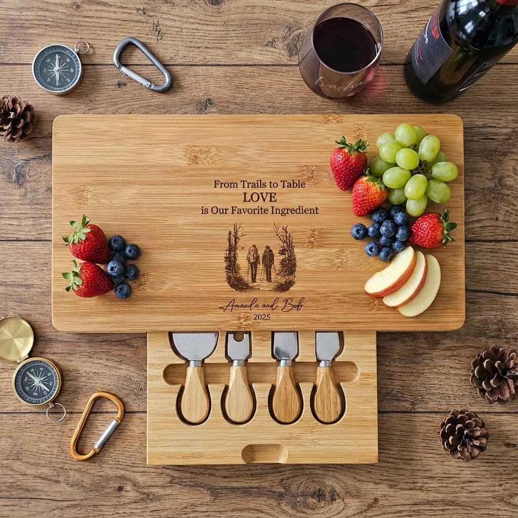 Personalized Hiking Charcuterie Board Set | Custom "Trails to Table" Bamboo Cheese Platter & Adventure Wedding Gift