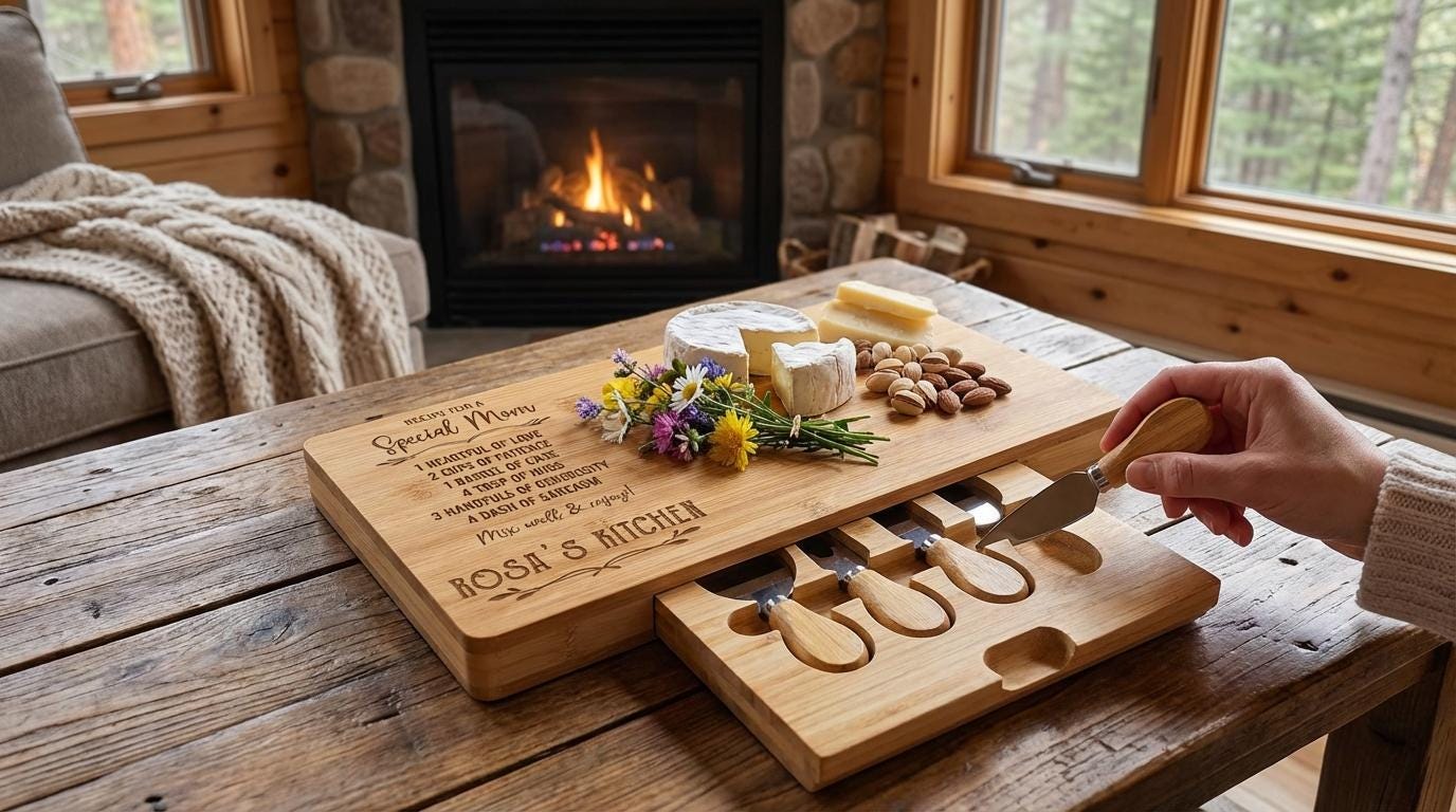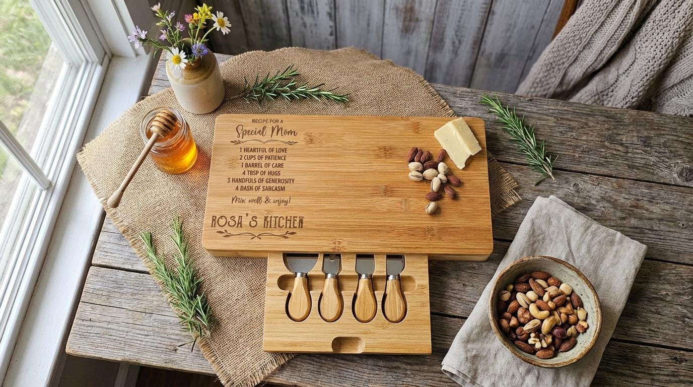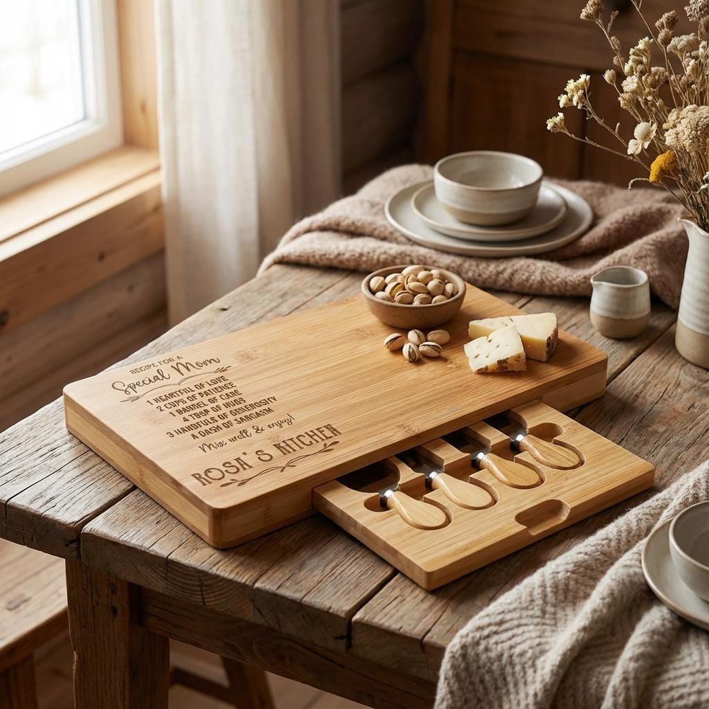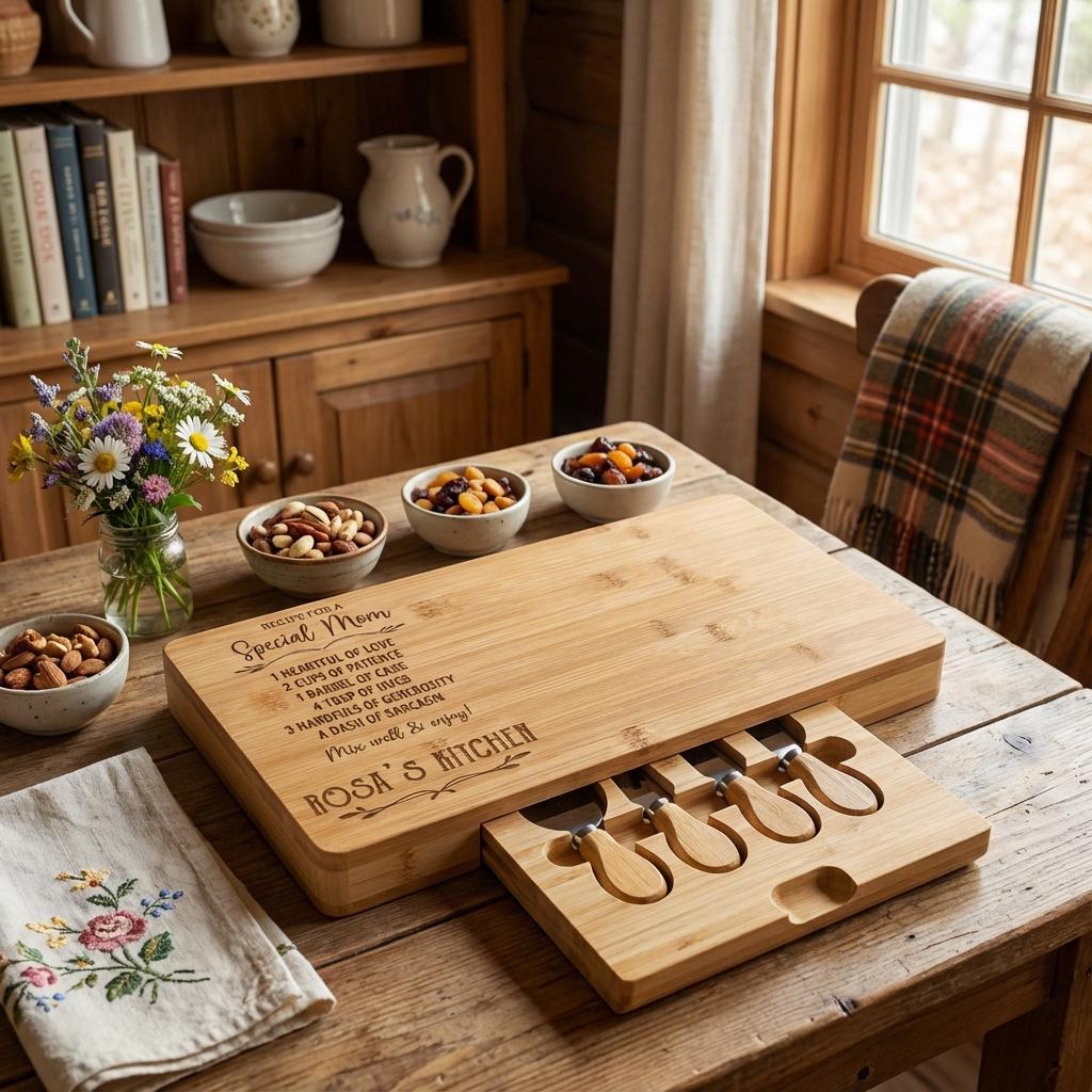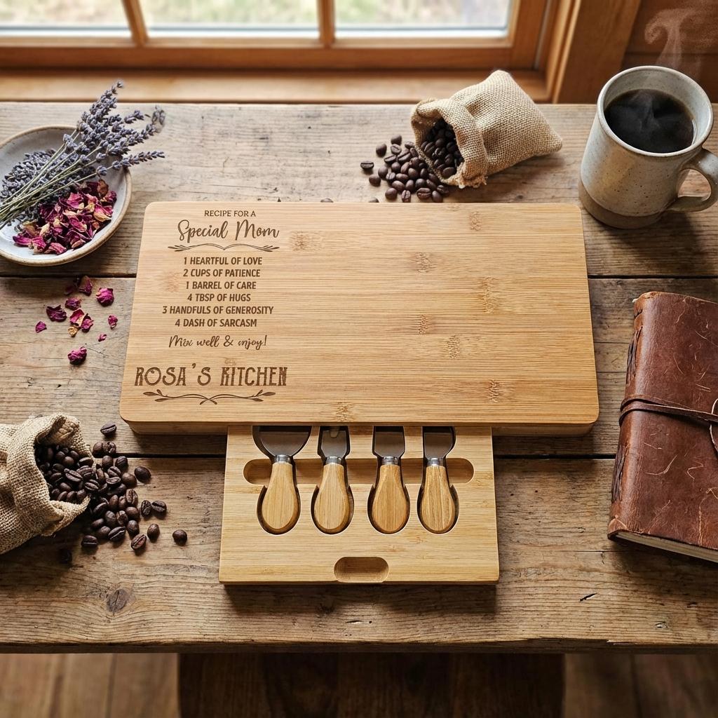 Personalized Bamboo Cheese Board Set | "Recipe for a Special Mom" Charcuterie Platter with Knives