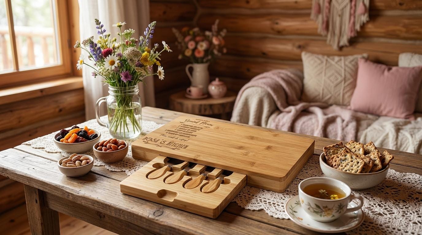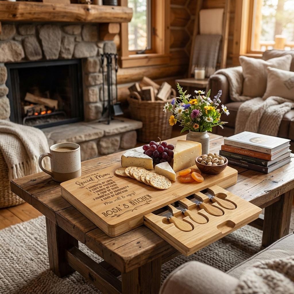 Cheese Board Set: The engraved bamboo board (15.75" x 7.75") features a hidden slide-out drawer with 4 stainless steel serving tools.