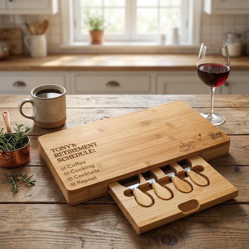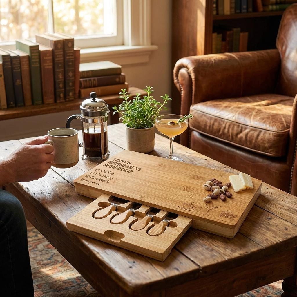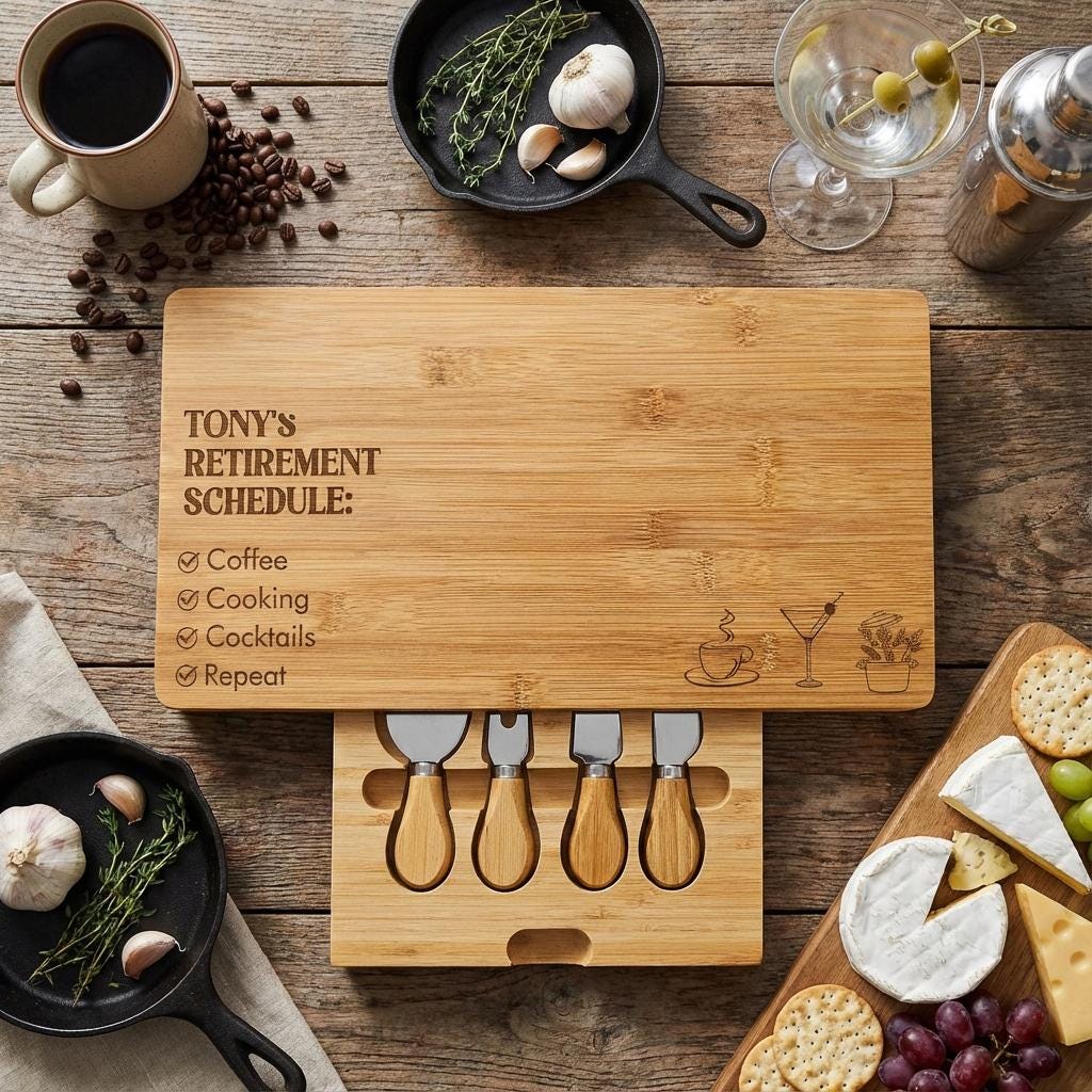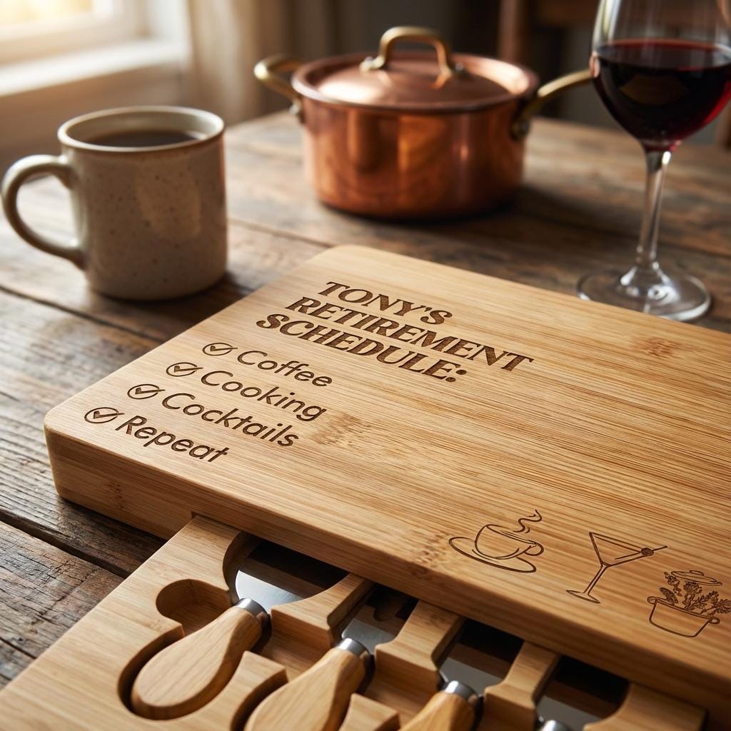 After years of the 9-to-5 grind, it’s time to focus on what really matters: Coffee, Cooking, and Cocktails. This custom-engraved bamboo set is the perfect funny-yet-functional tribute to his well-earned freedom. Whether he’s hosting a retirement party or enjoying a quiet Tuesday afternoon (because he can!), this board serves as a daily reminder that he is officially off the clock.