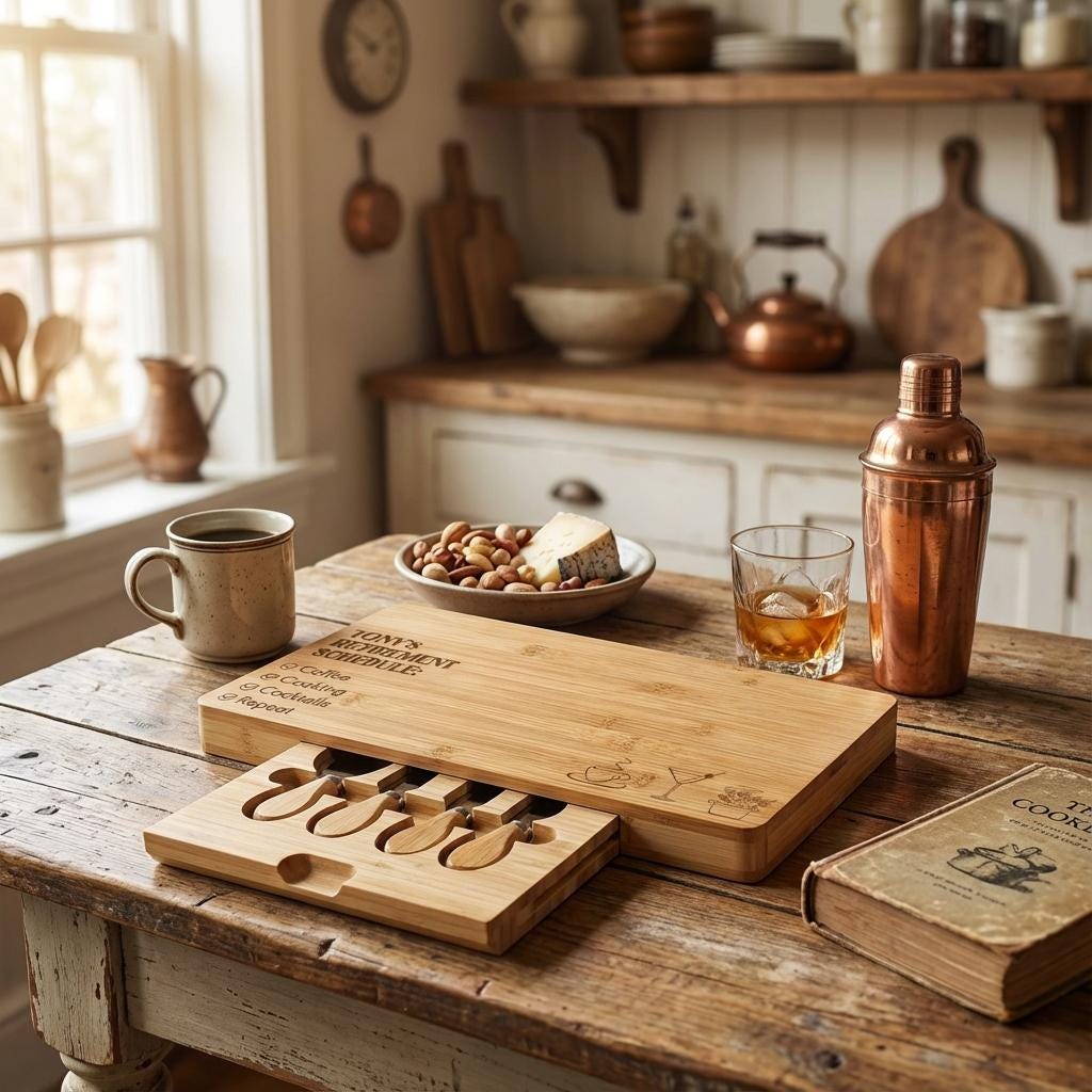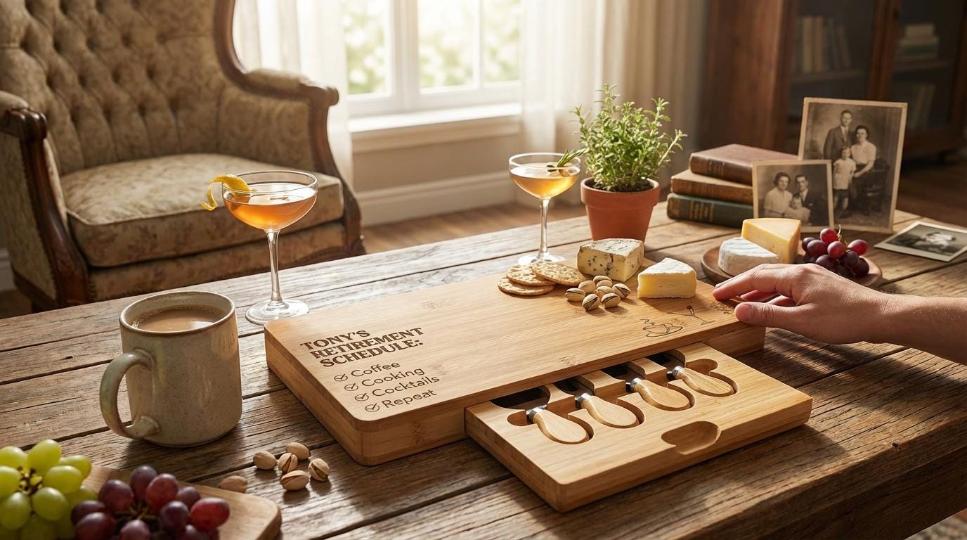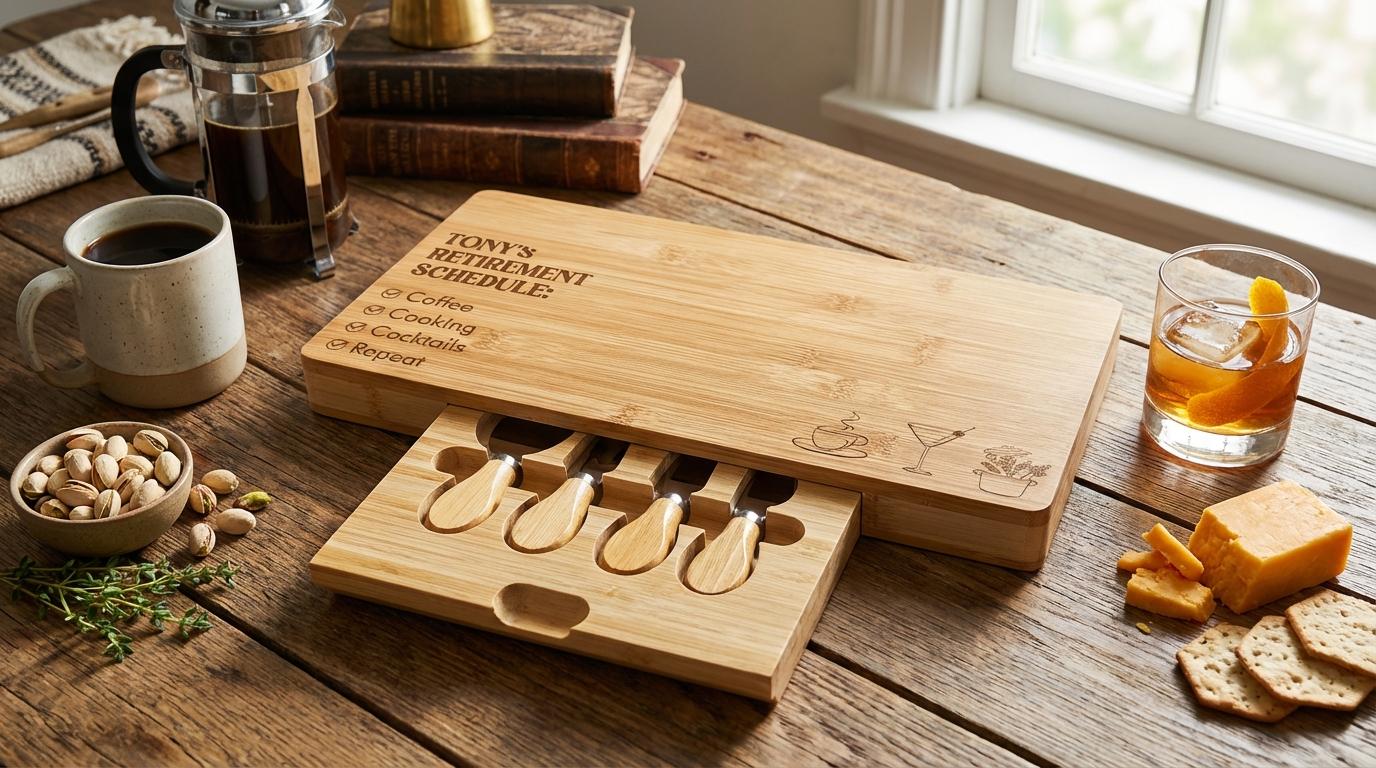 After years of the 9-to-5 grind, it’s time to focus on what really matters: Coffee, Cooking, and Cocktails. This custom-engraved bamboo set is the perfect funny-yet-functional tribute to his well-earned freedom. Whether he’s hosting a retirement party or enjoying a quiet Tuesday afternoon (because he can!), this board serves as a daily reminder that he is officially off the clock.