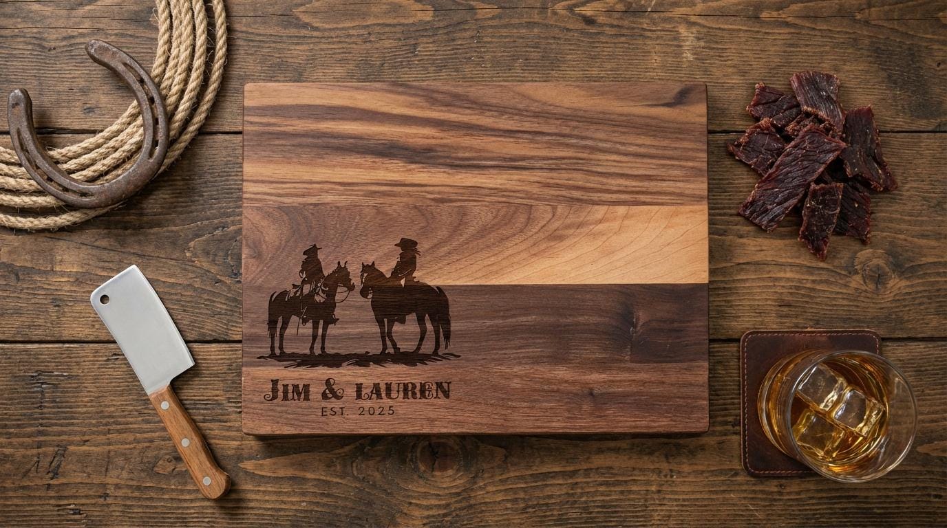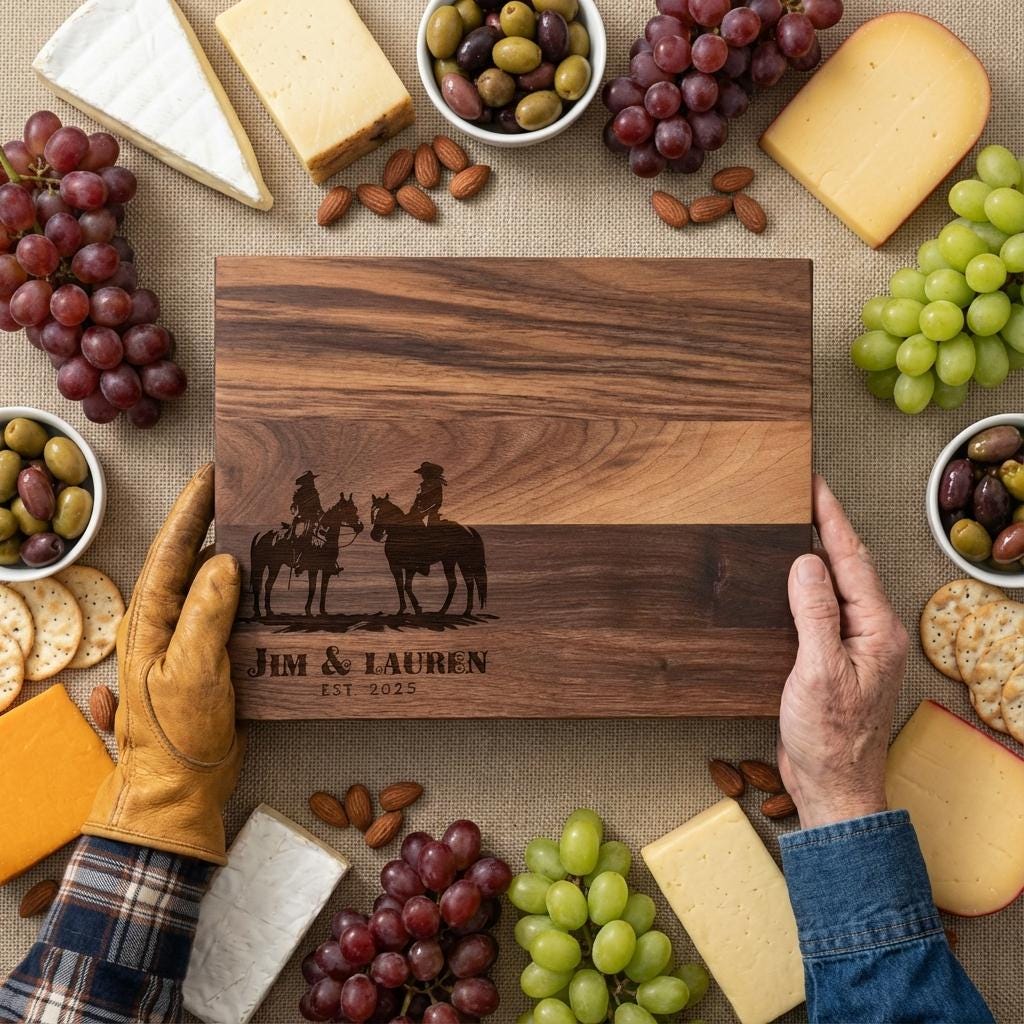 Personalized Cutting Board – Cowboy & Cowgirl with Horse: Custom Engraved Charcuterie Western Kitchen Decor, Gift for Him and Her