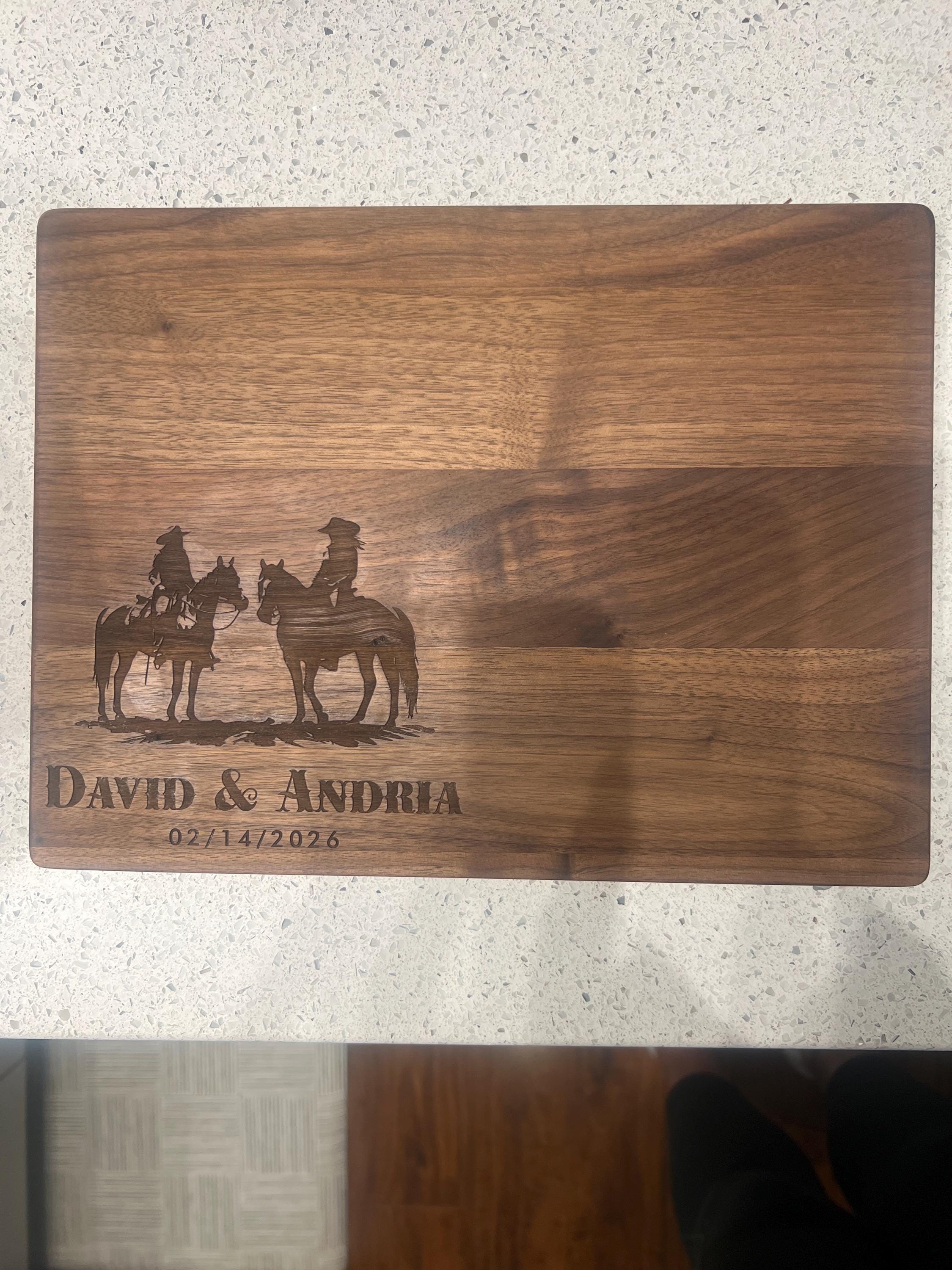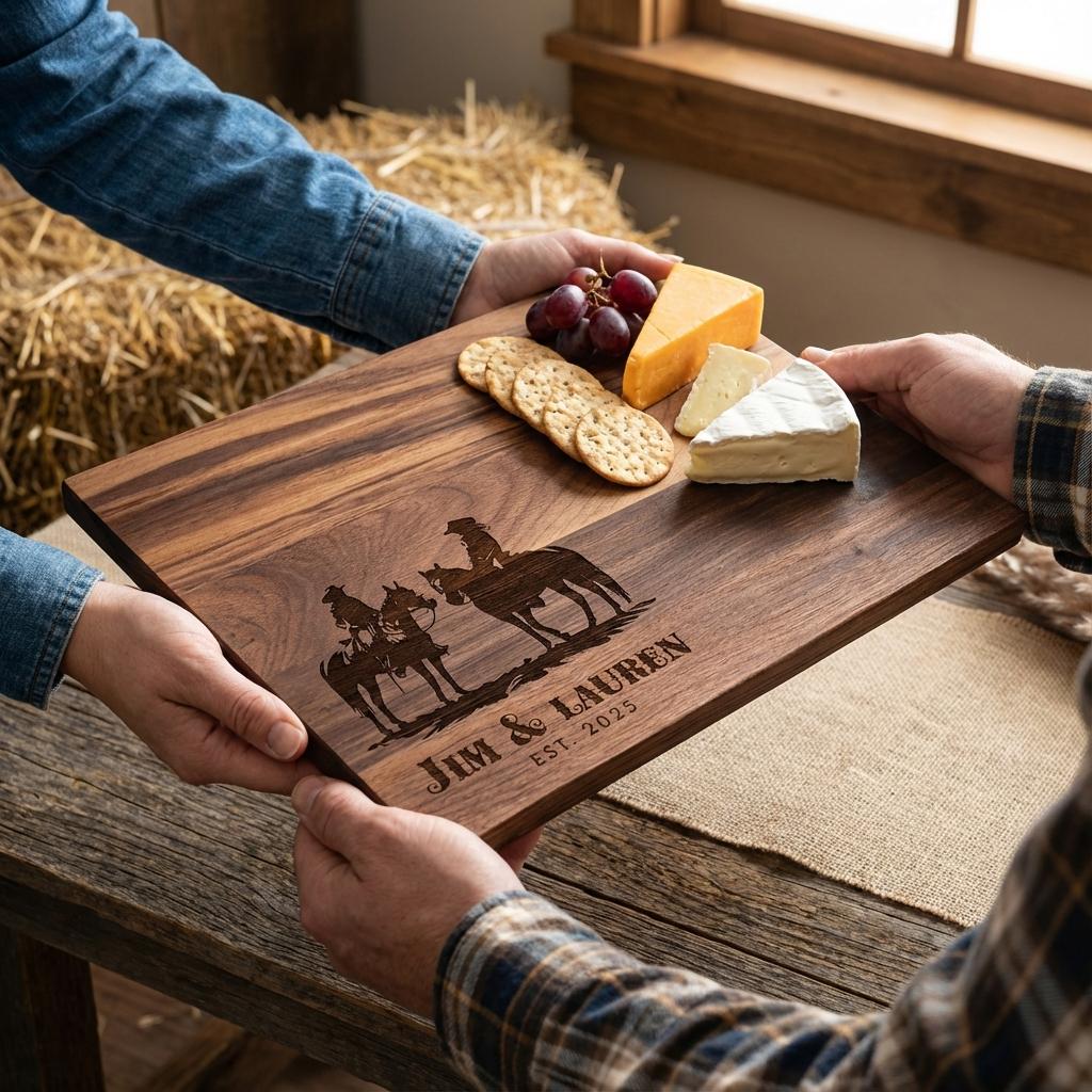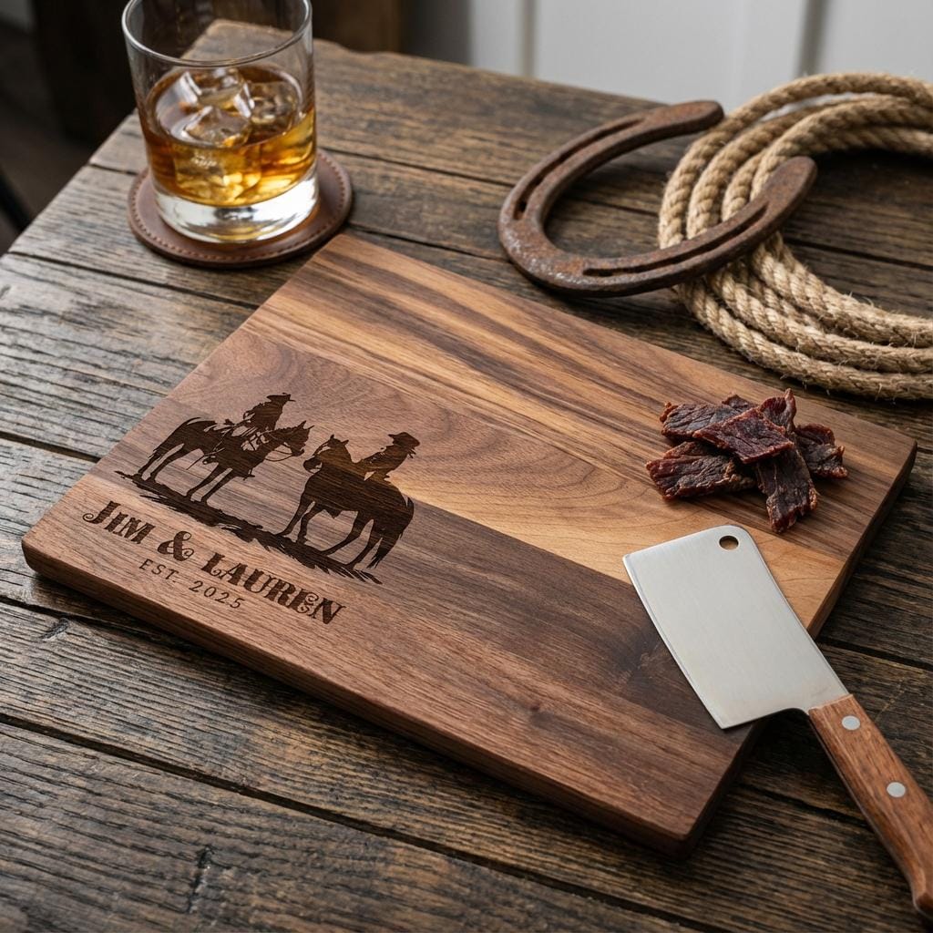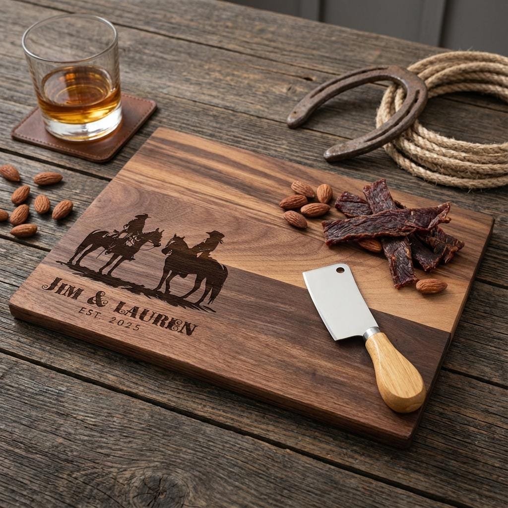 Celebrate the untamed charm of the Wild West with our Personalized Cutting Board, featuring a stunning engraving of a cowboy, a cowgirl, and a horse. This cutting board is a tribute to Western adventure and timeless romance, making it a perfect addition to any kitchen or a unique gift for that special someone.
