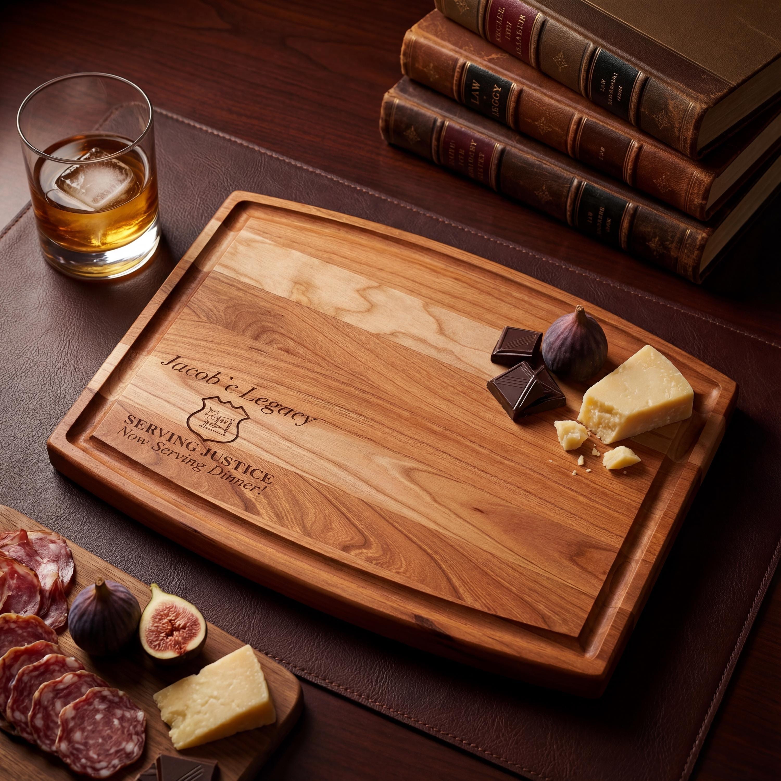 Honor the badge with this personalized police officer gift. Featuring the funny 'Serving Justice, Now Serving Dinner' engraving and a deep juice groove, this custom wood cutting board is the ultimate retirement present for law enforcement.